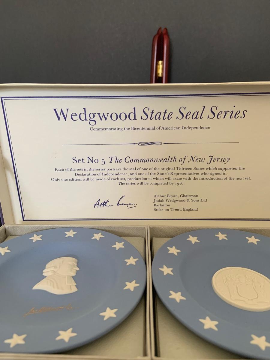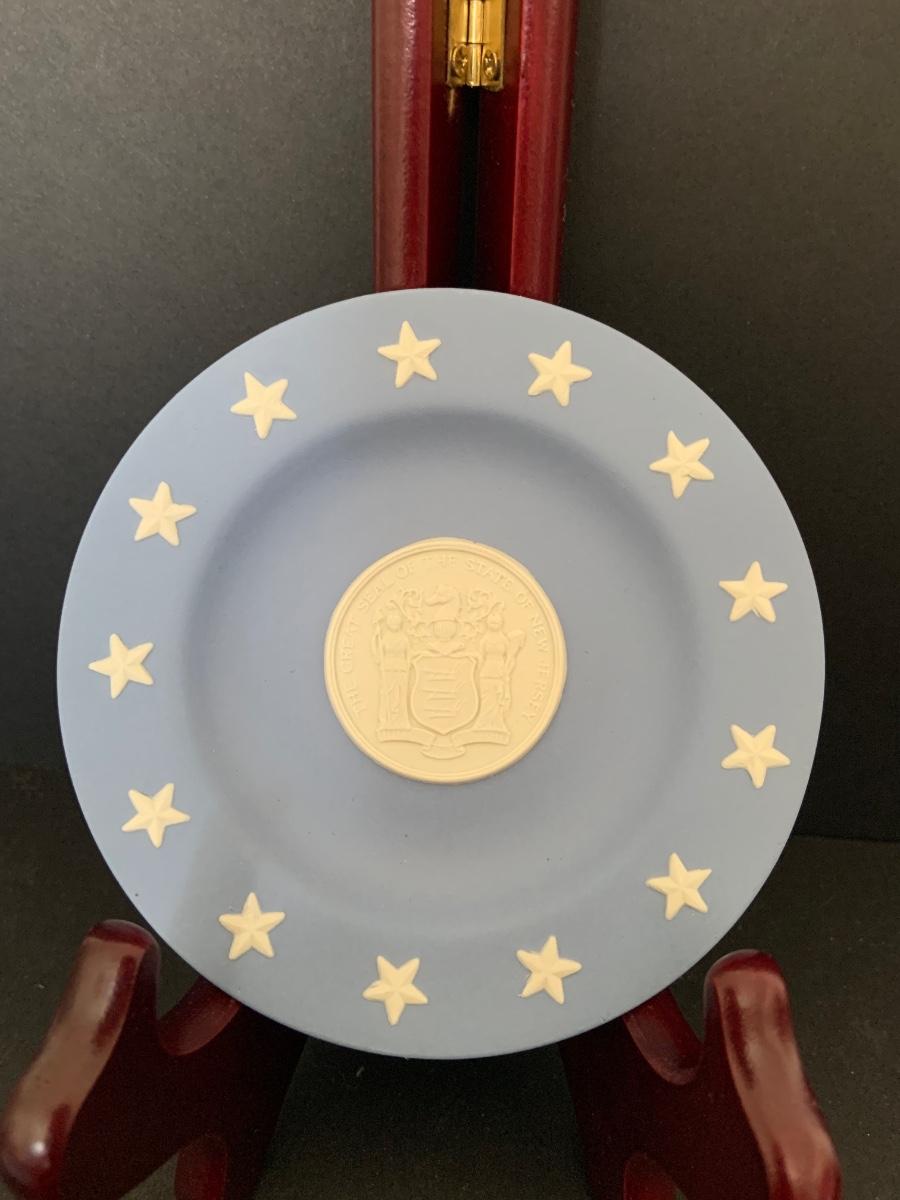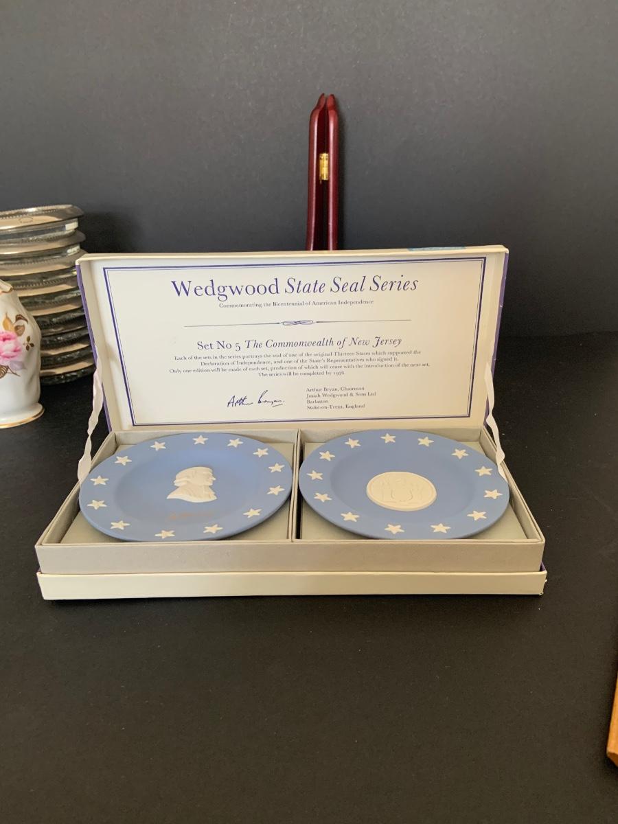LOT:112G: Wedgwood Blue Jasper  Bicentennial State Seal Series NEW JERSEY; Wes Blackinton Silver-plated Crystal Coasters; an Ansley China Shaker and a Square Milk-Glass Compote with Lid