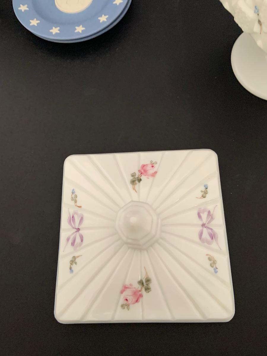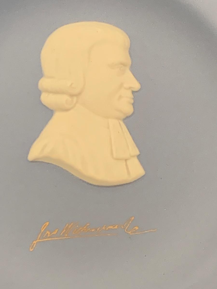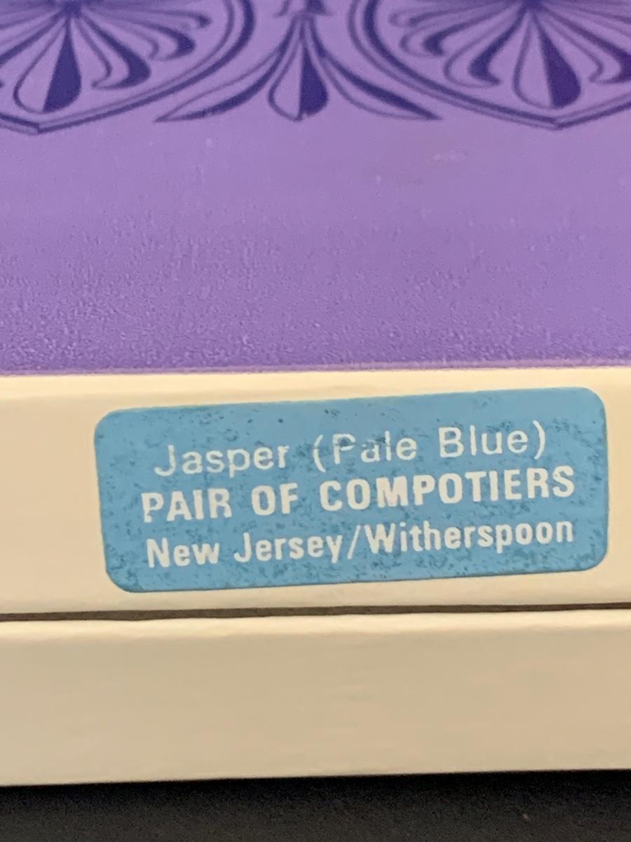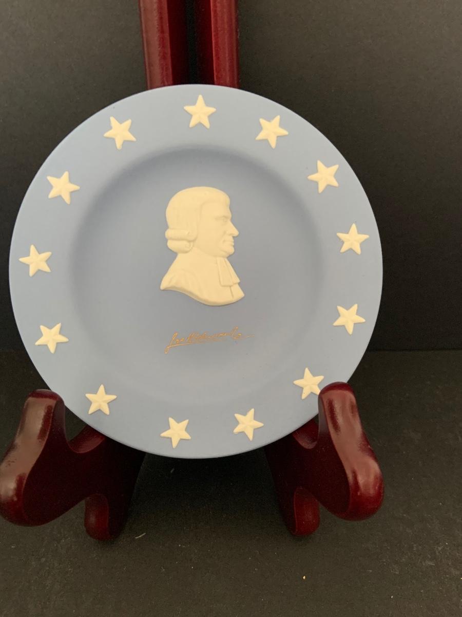 LOT:112G: Wedgwood Blue Jasper  Bicentennial State Seal Series NEW JERSEY; Wes Blackinton Silver-plated Crystal Coasters; an Ansley China Shaker and a Square Milk-Glass Compote with Lid