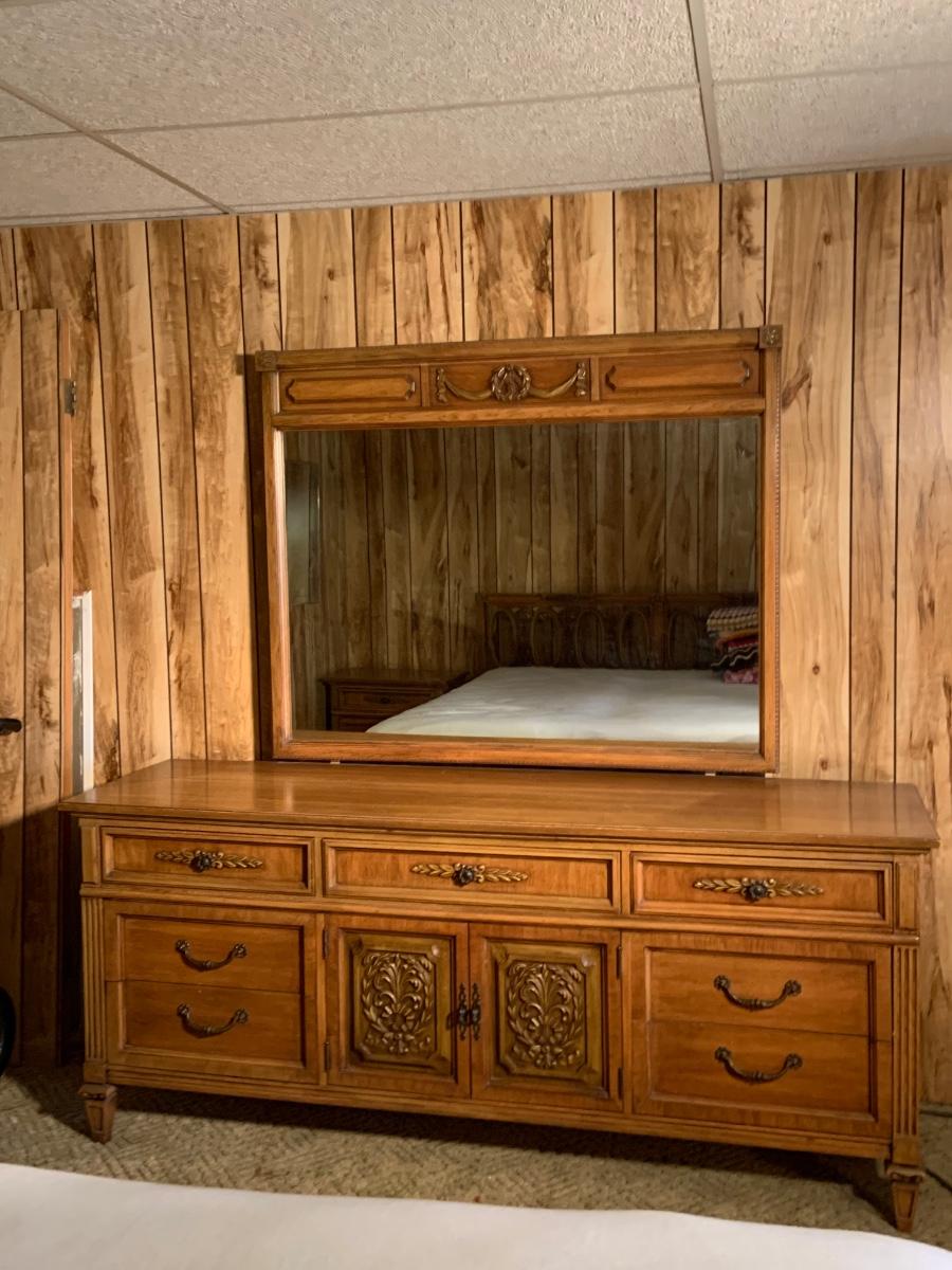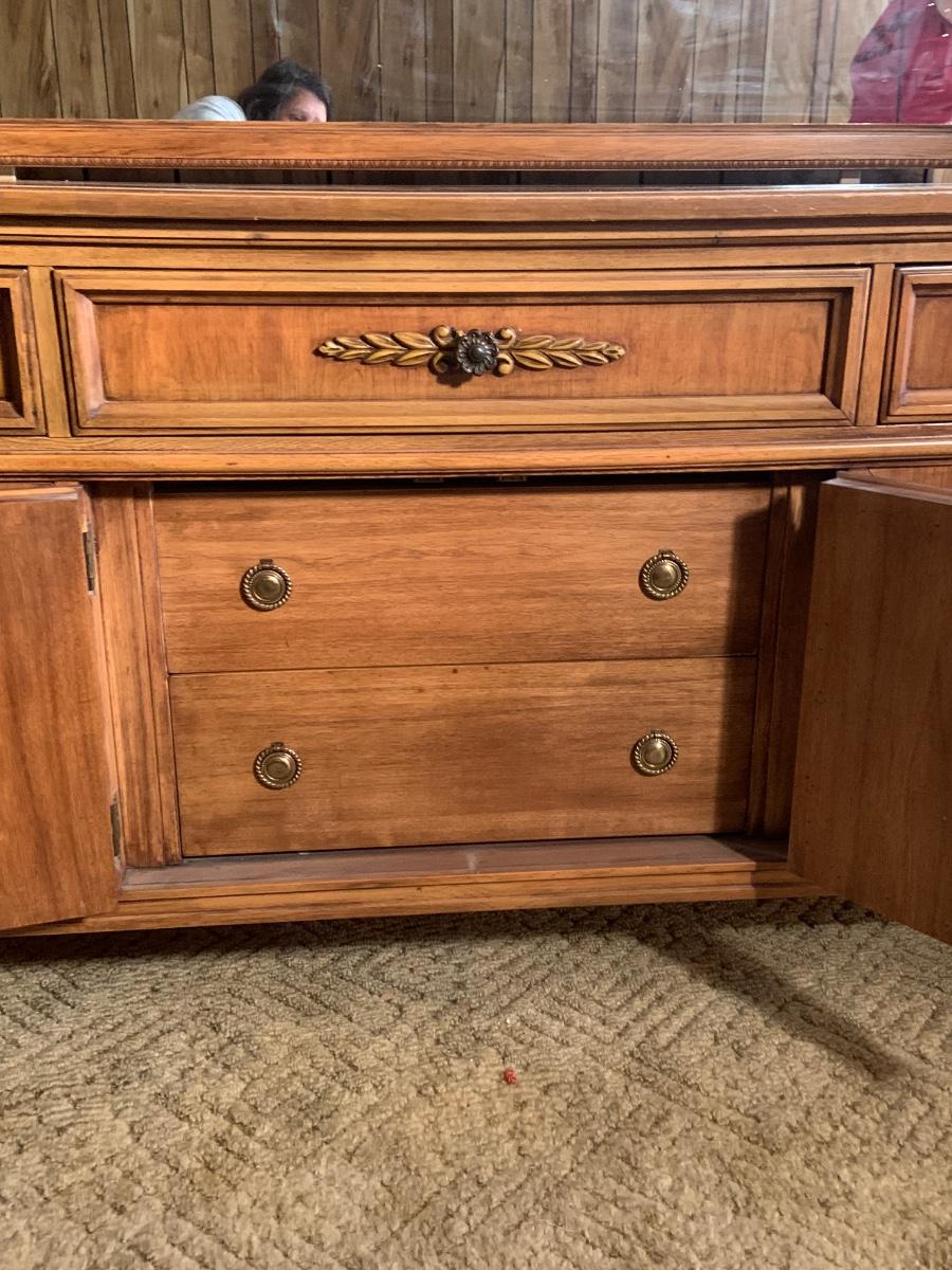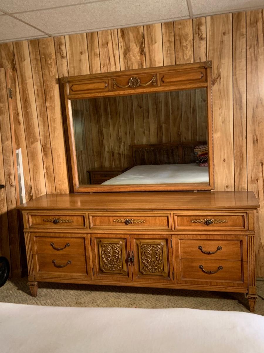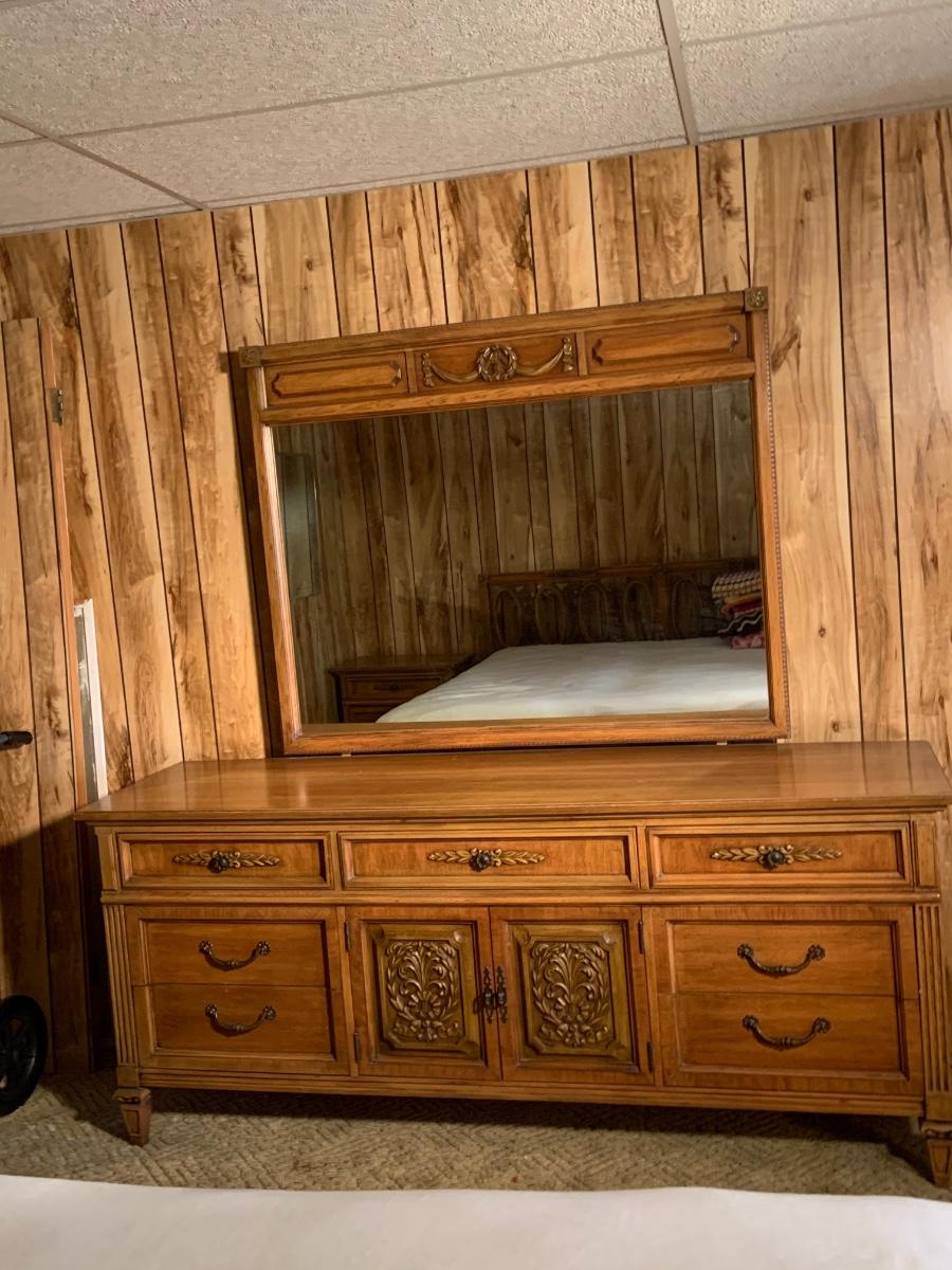 The dresser is approximately 75” x 20” x 32” and the Mirror is approximately 51” x 42”. Please see all pictures as they are the best representation of the items. The pictures show condition, measurements if taken, and what is included in the lot. Due to the large amount that we photograph and the time frame, we are not always able to take measurements. All items unless noted, are pre-owned and have been used. If you purchased furniture, you must bring help. We do not allow one person to carry large furniture out on their own. Bring help, tools and a truck for the safety of our client’s homes, and your personal safety. Any damages that result to the property including walls, and floors due to moving of the furniture will be charged to the buyer. Company policy. Thank you.