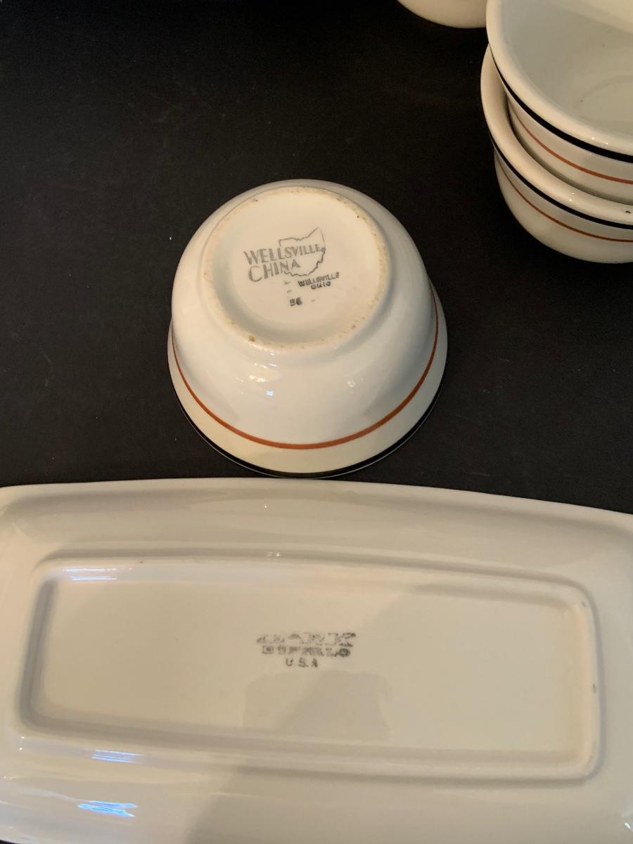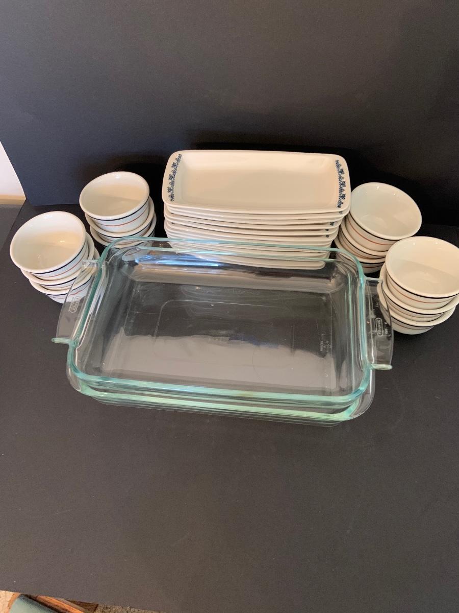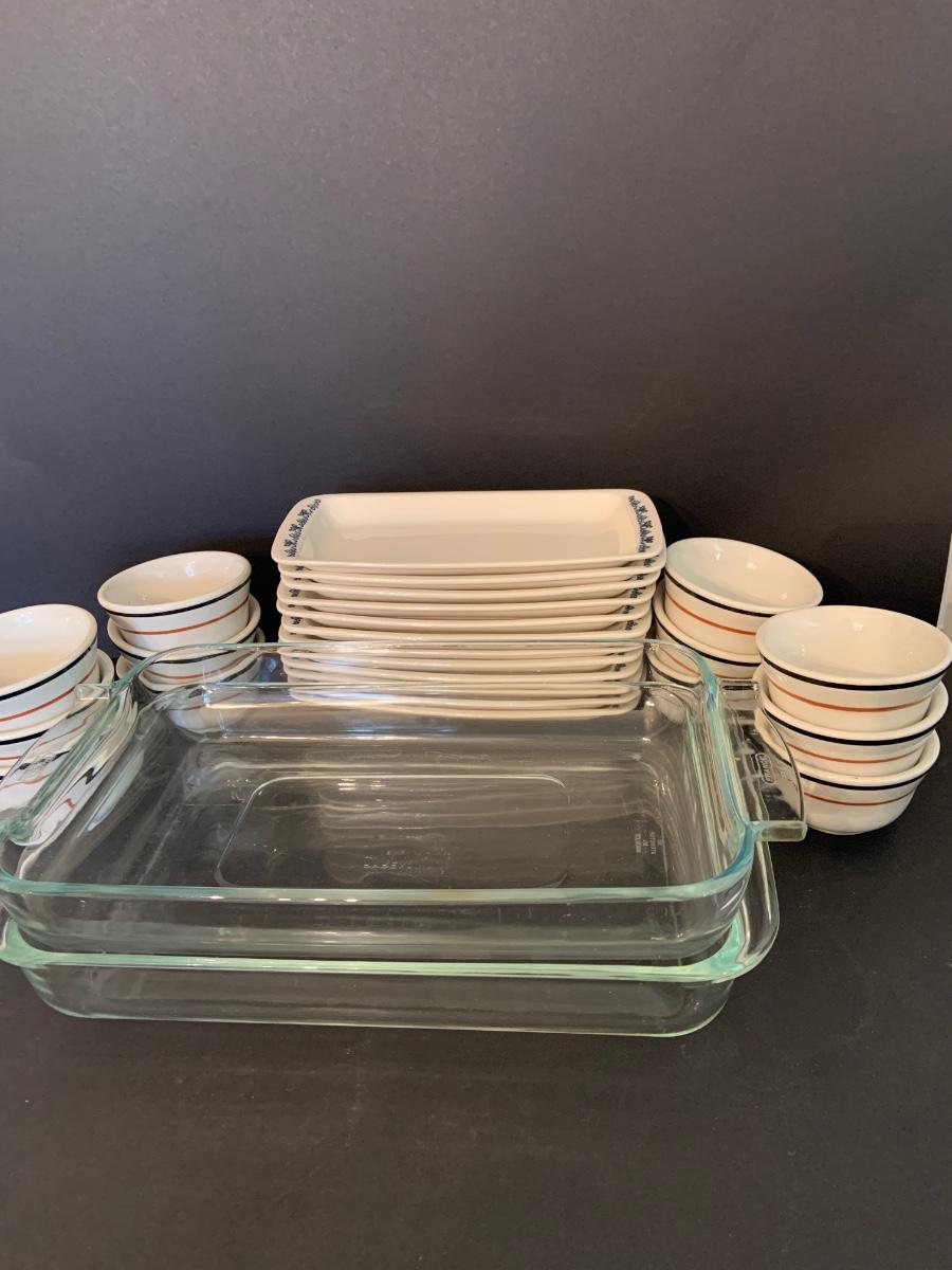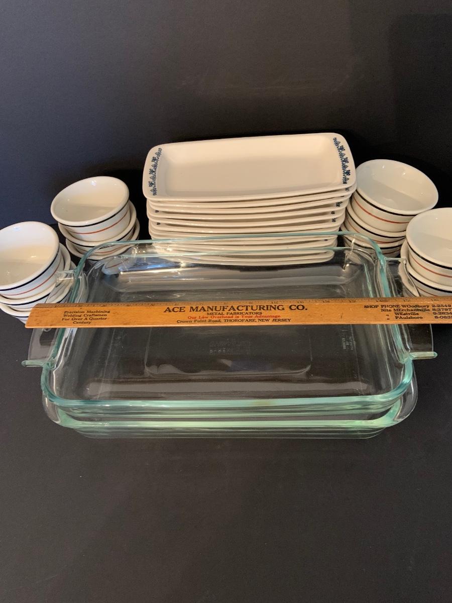 LOT:124G: 2 Rectangular Pyrex Baking Dishes, 12 Mark Buffalo Relish Dishes and Wellsville Soup/Custard Bowls