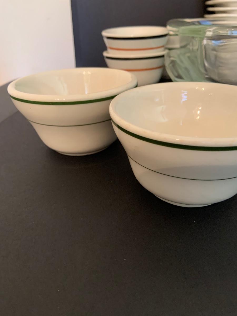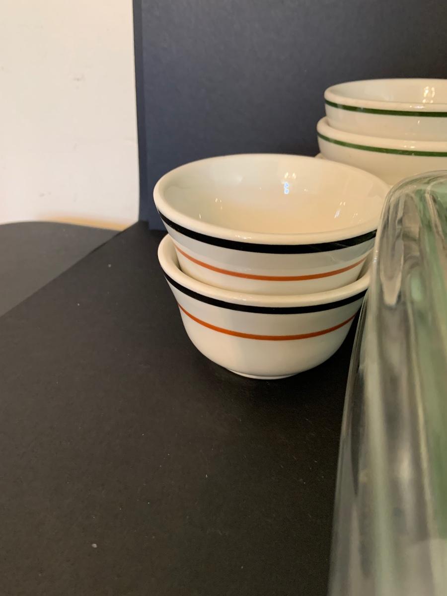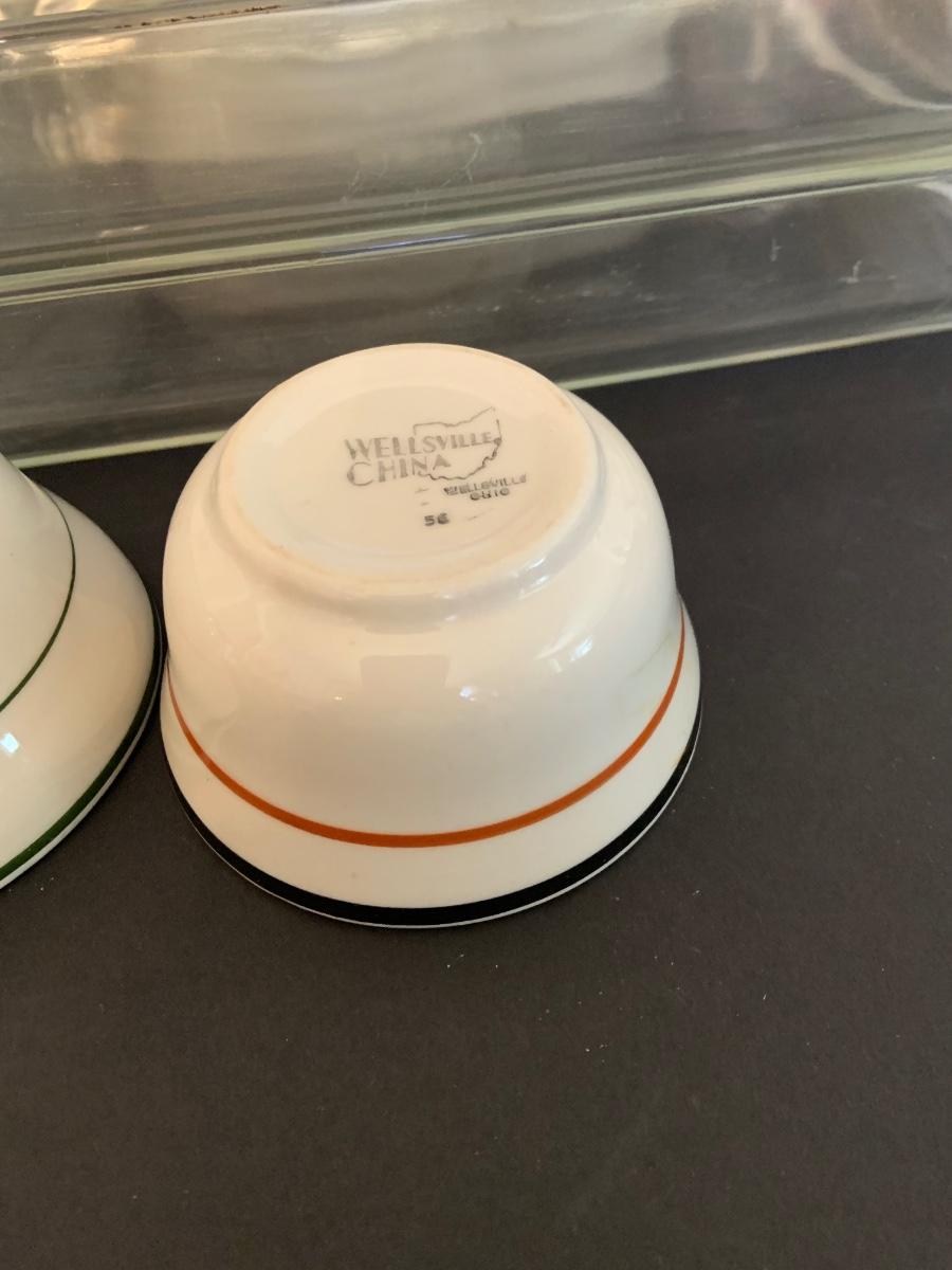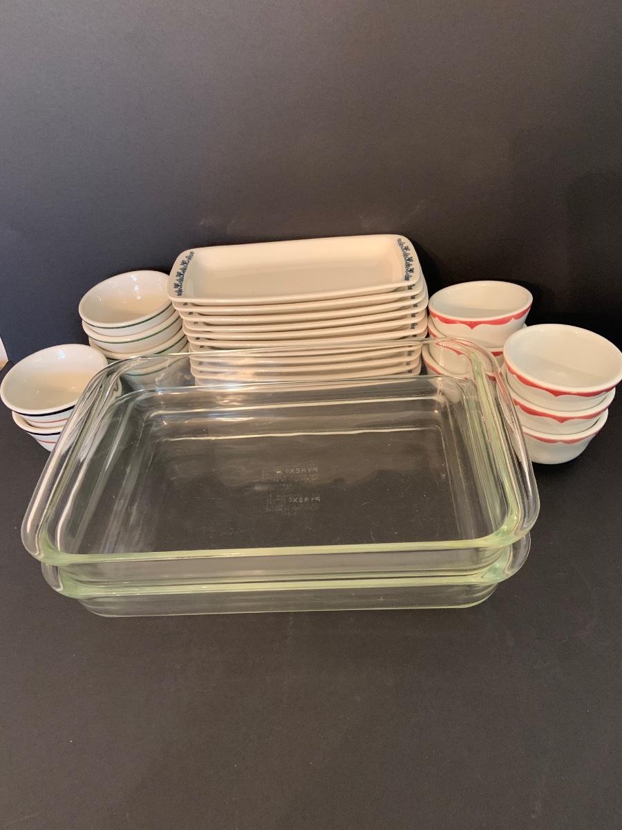 LOT:125G: 2 Rectangular Pyrex Baking Dishes, 12 Mark Buffalo Relish Dishes and Cosmopolitan,, Sterling and Wellsville Soup/Custard Bowls