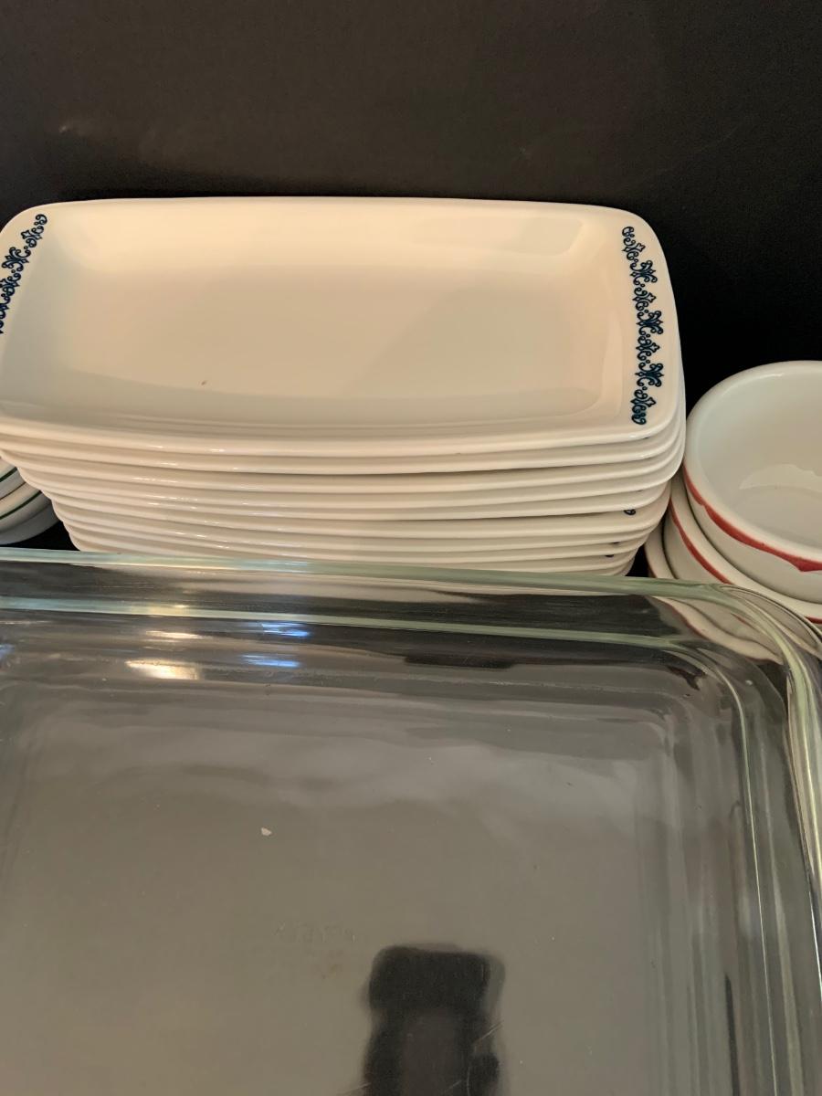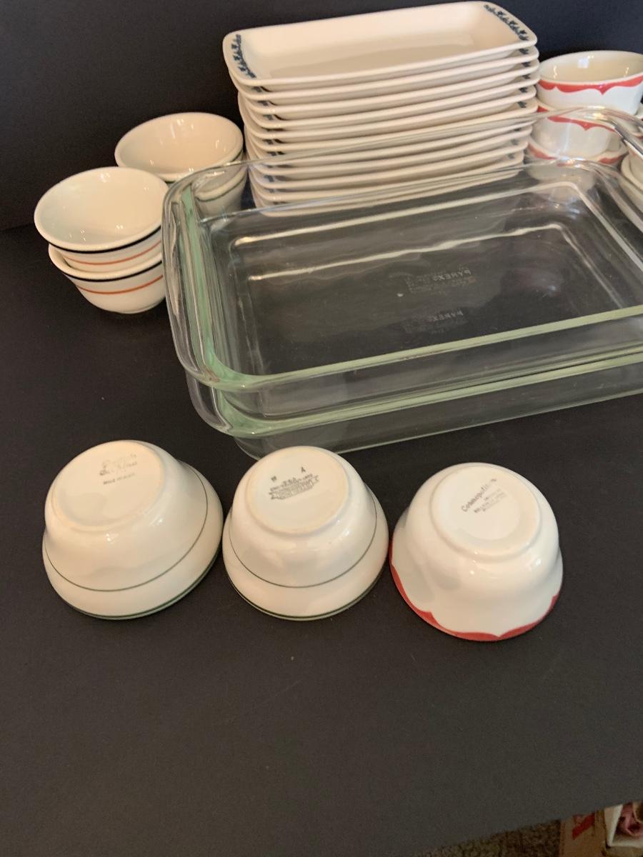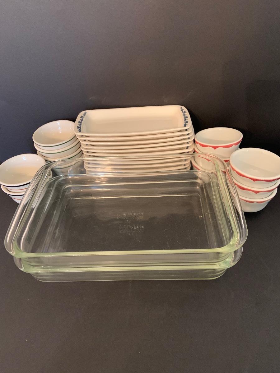 LOT:125G: 2 Rectangular Pyrex Baking  Dishes, 12 Mark Buffalo Relish Dishes and Cosmopolitan,, Sterling and  Wellsville Soup/Custard Bowls