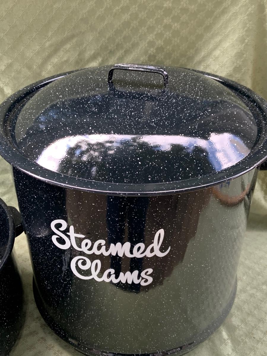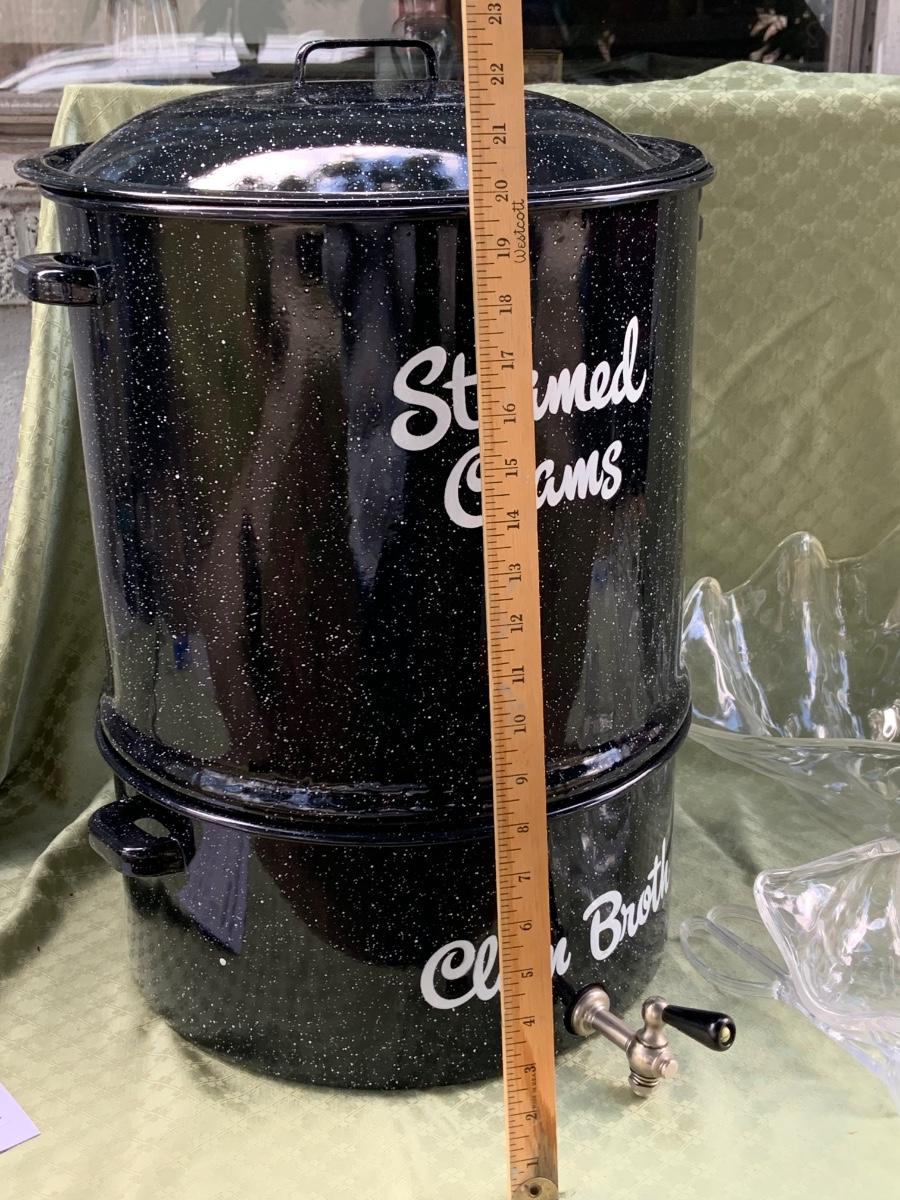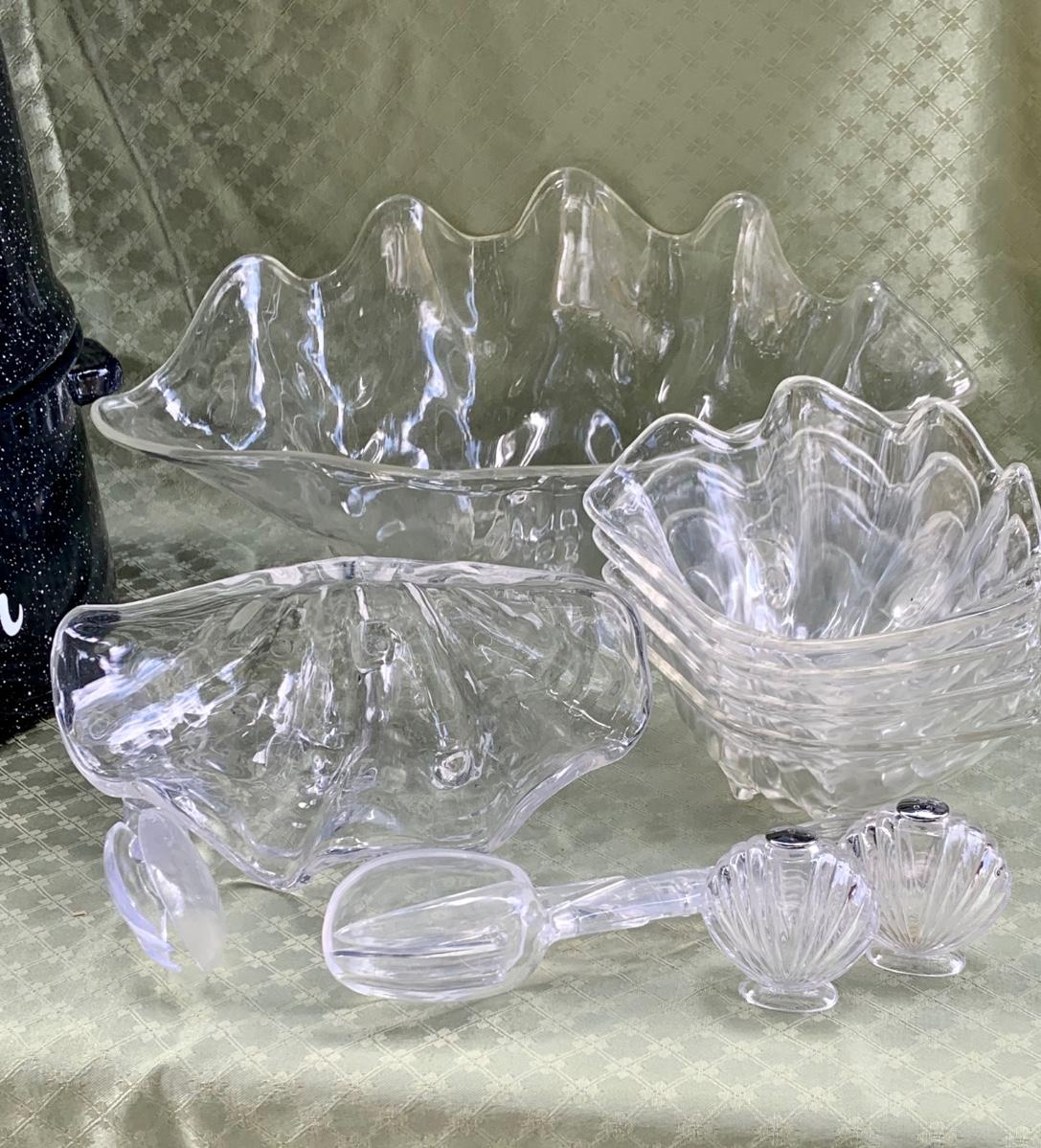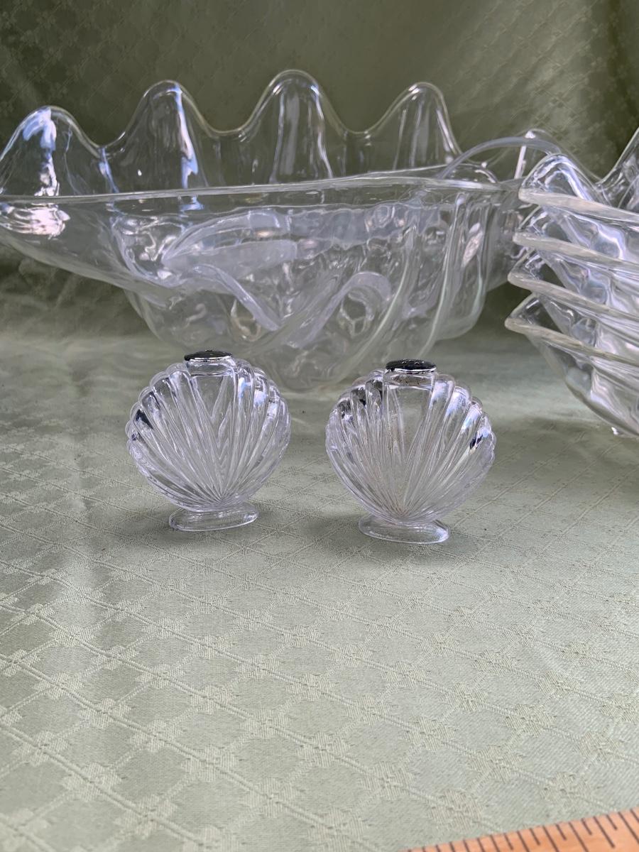 LOT:130G: Extra Large 3 Piece Clam Steam Pot and Clear Claim Shaped Dishes and Salt & Pepper Shaker