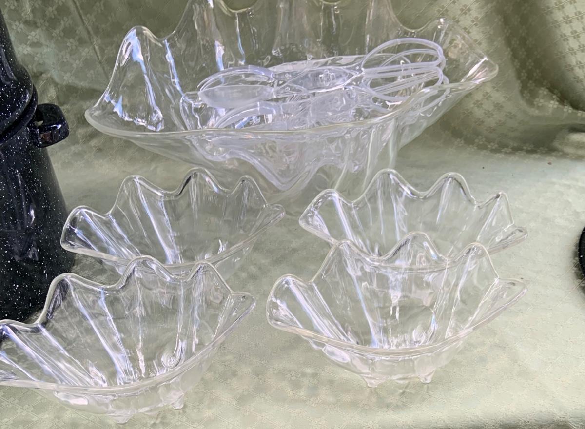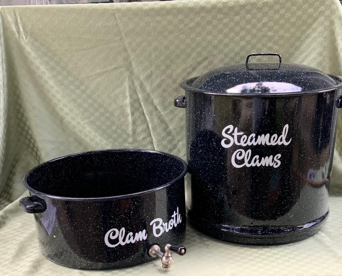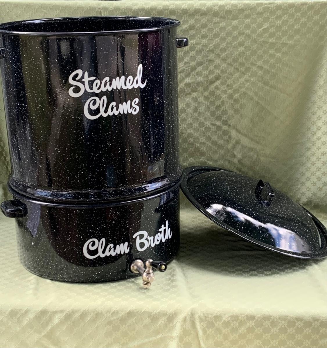 LOT:130G: Extra Large 3 Piece Clam Steam Pot and Clear Claim Shaped Dishes and Salt & Pepper Shaker