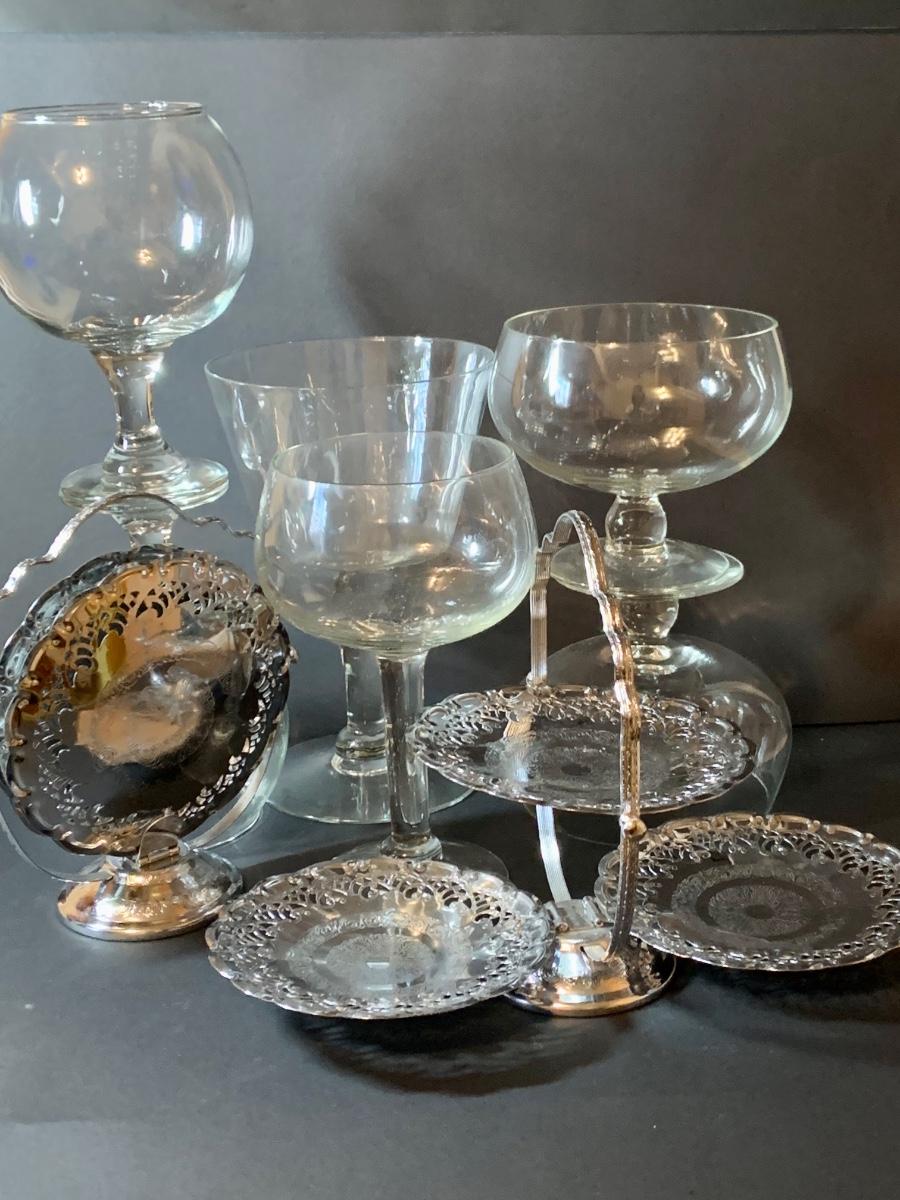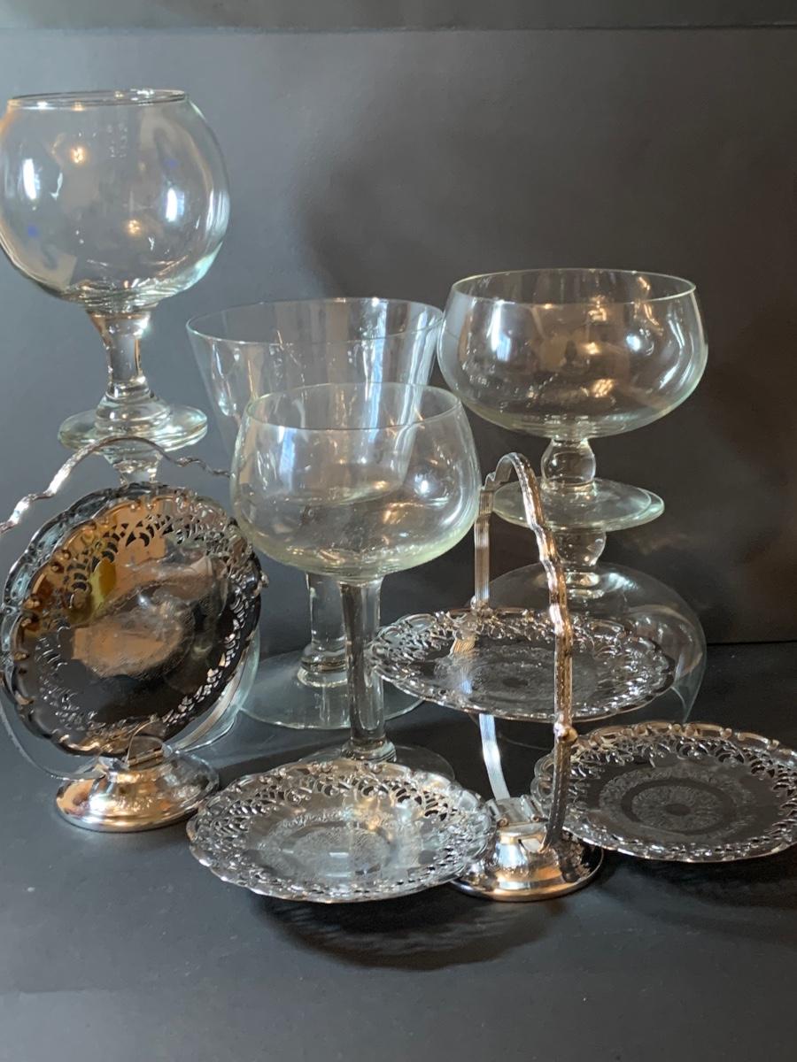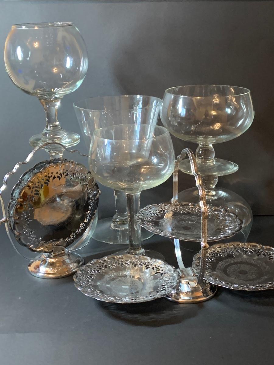 LOT:131G: 5 Large Decorative Glasses and 2 Fan Shaped 3 Tier Serving Platter