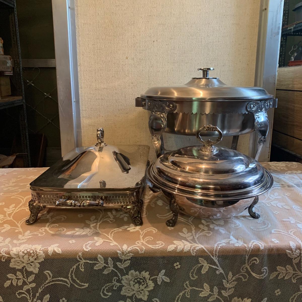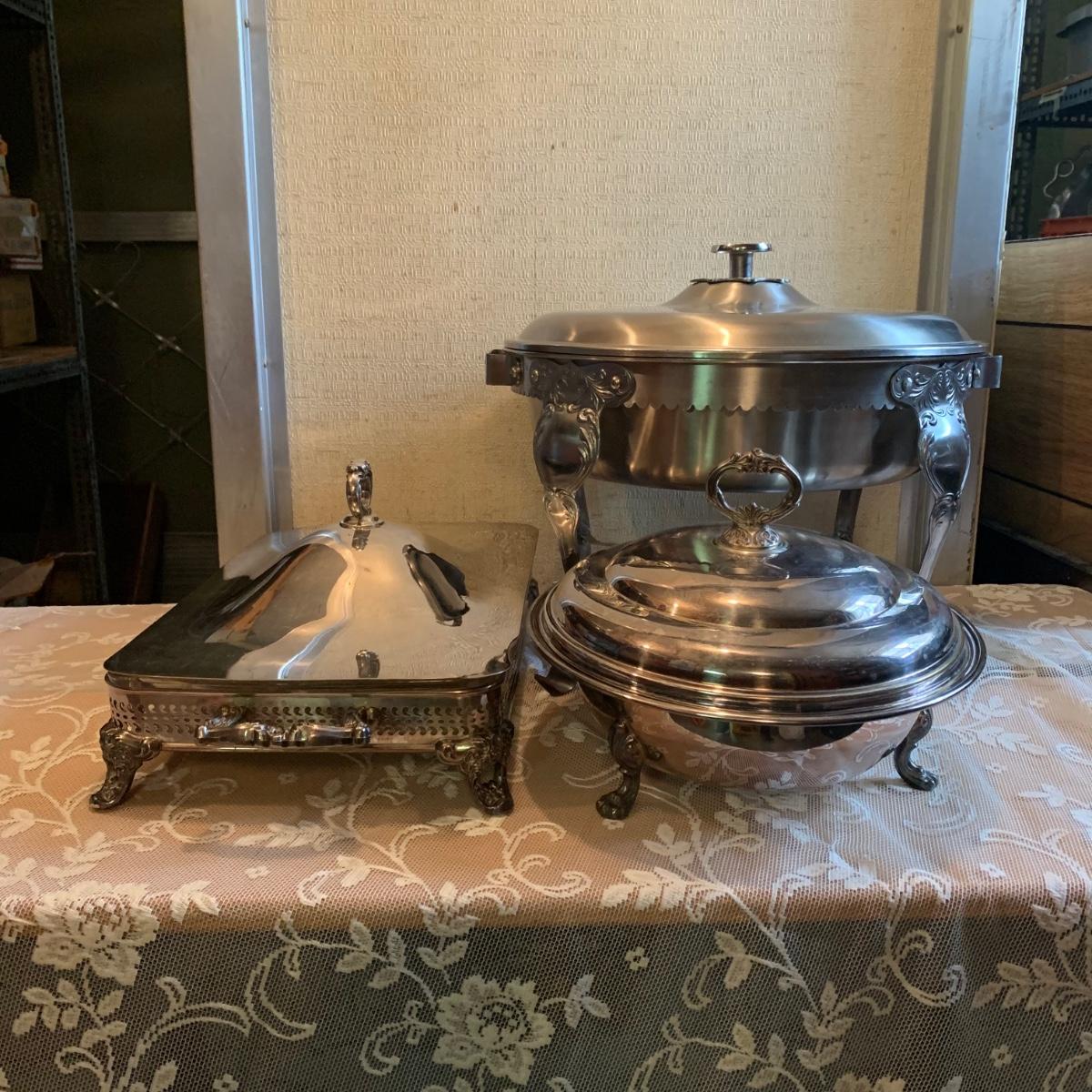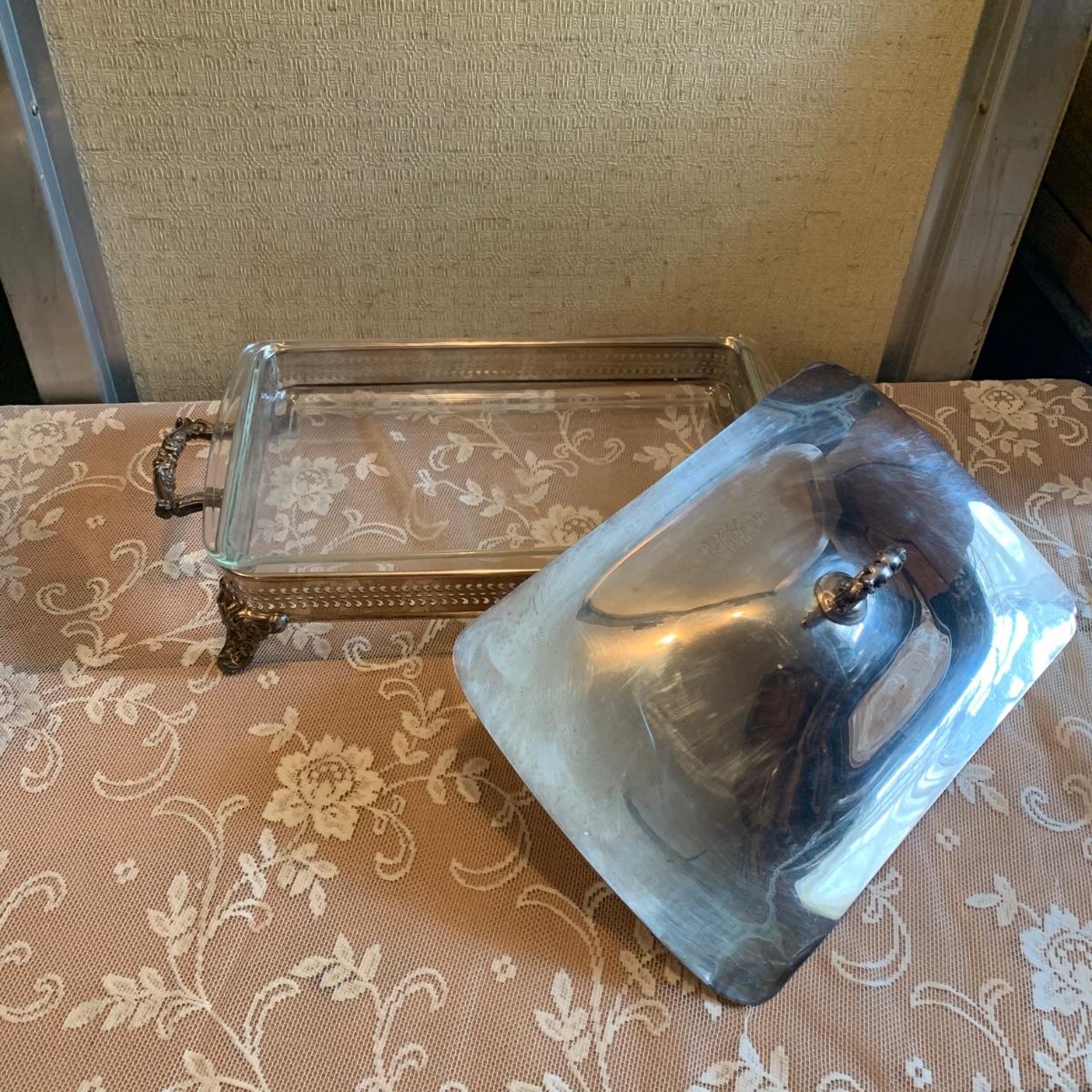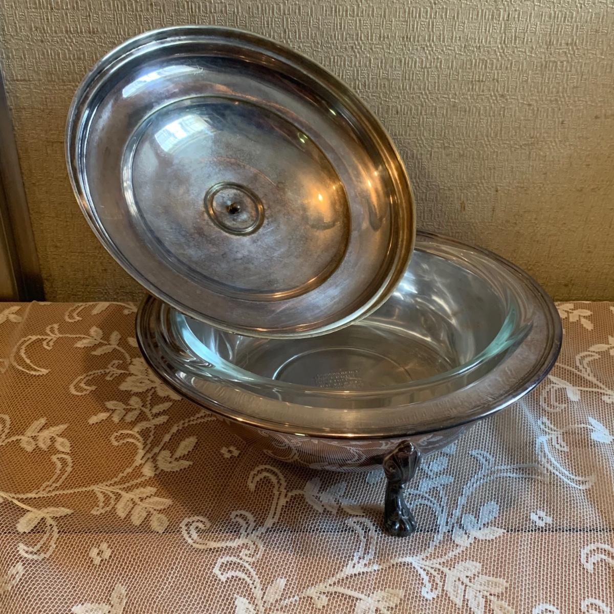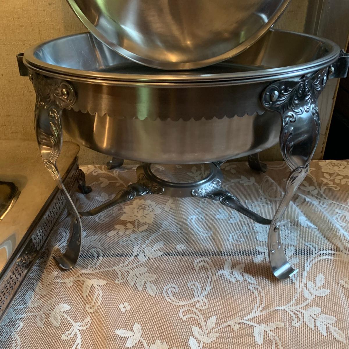LOT 137R: Vintage Chafing Dish &  Footed and  Covered  Serving Dishes w/Pyrex Inserts