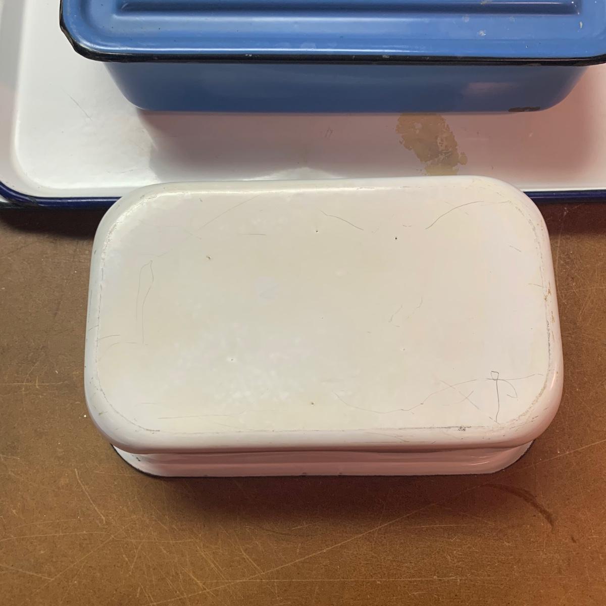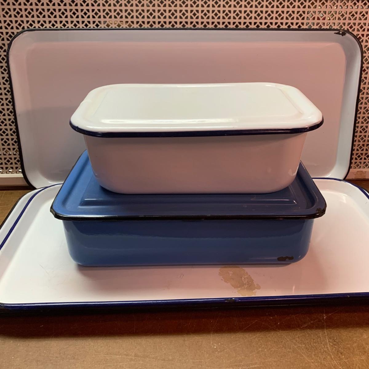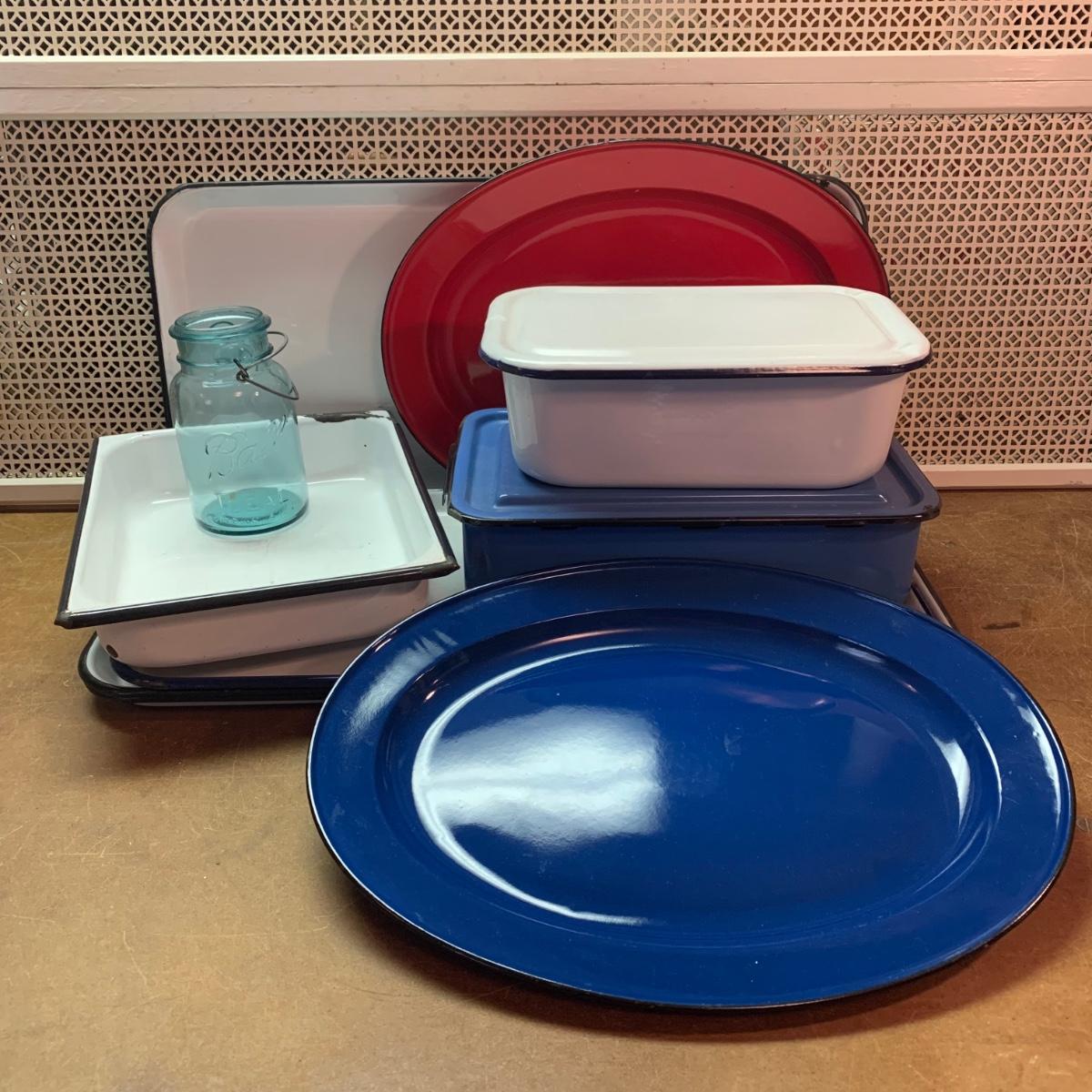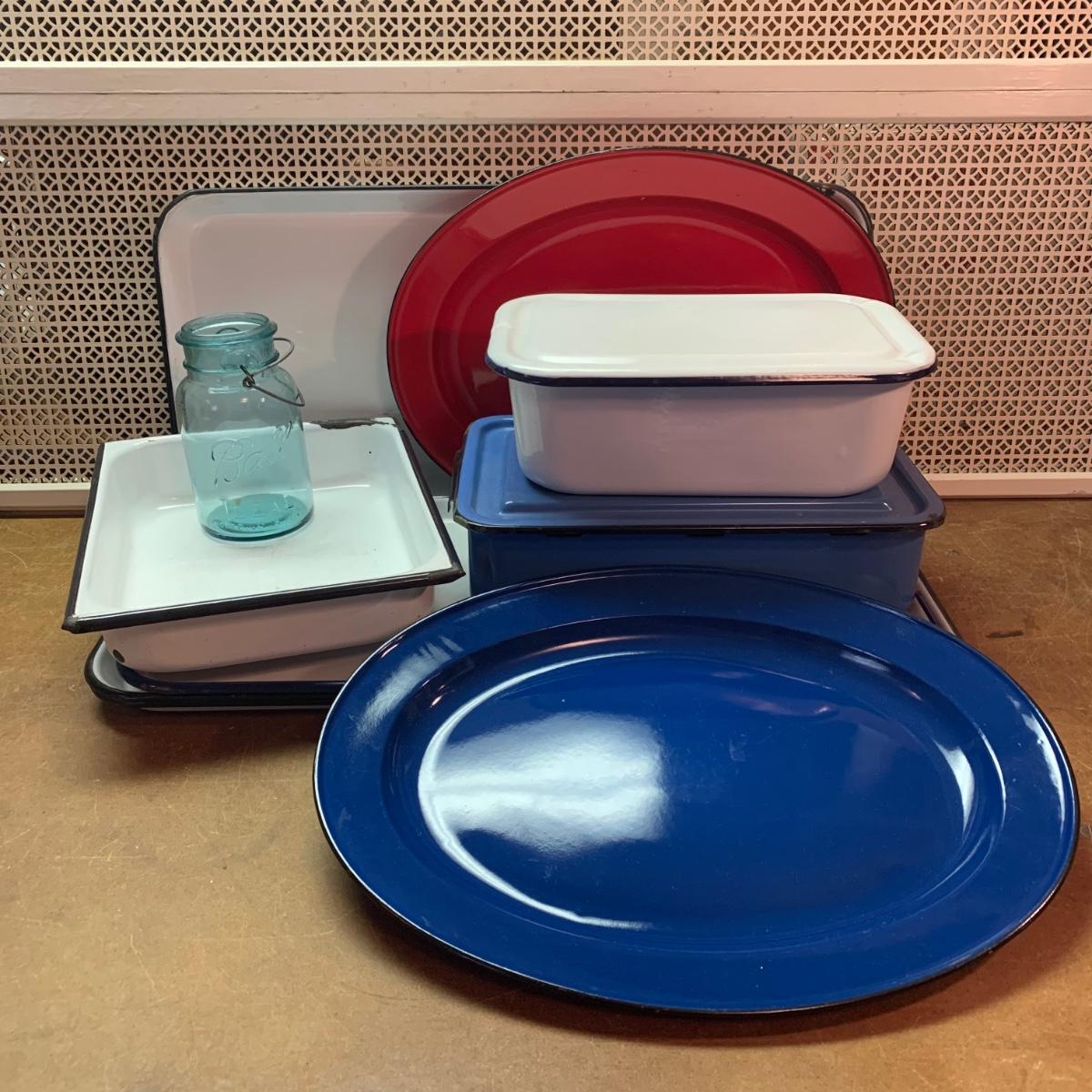 LOT 140R: Vintage Enamel Metal Refrigerator Dishes, Trays and Oval Platters