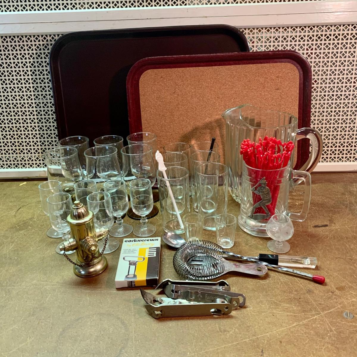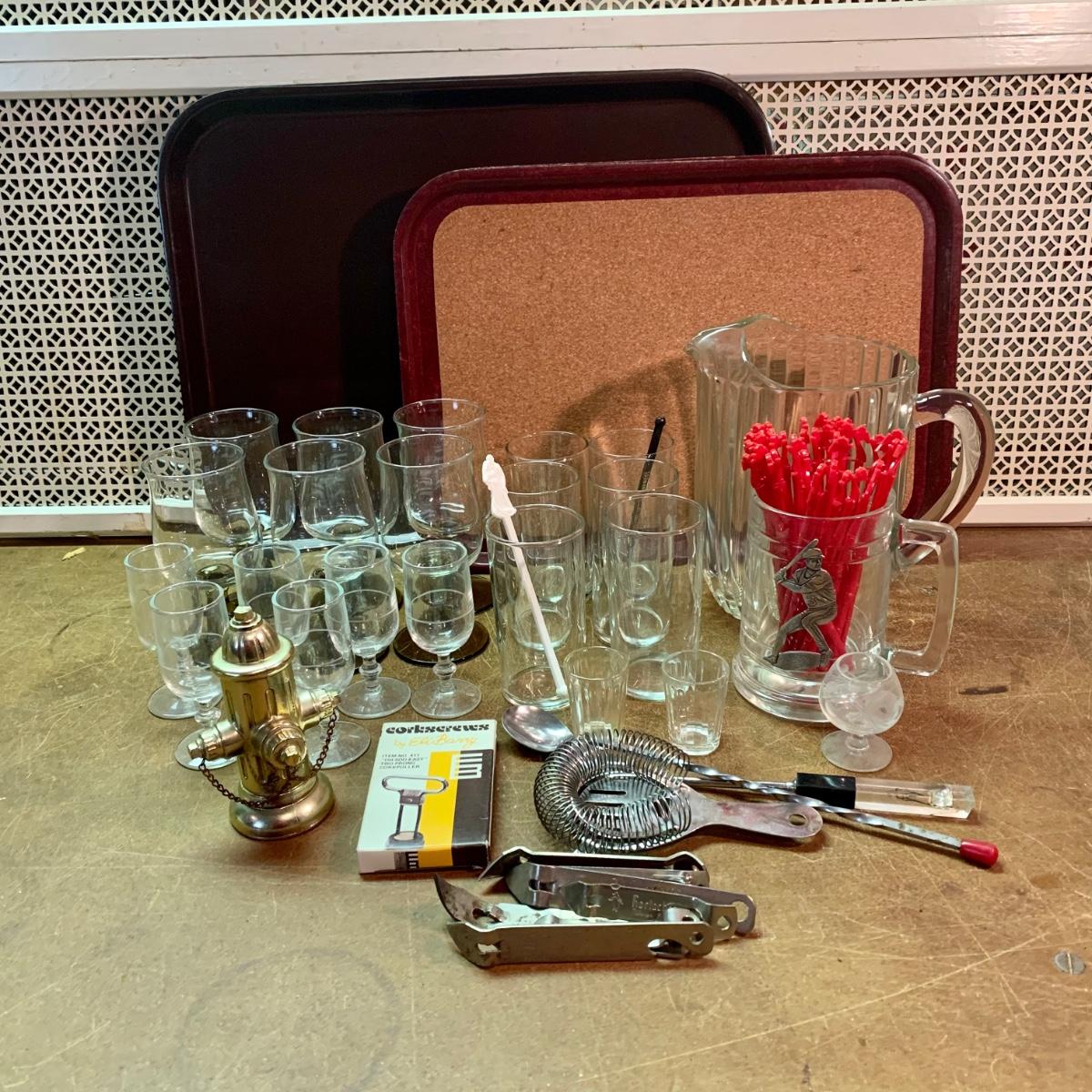 LOT 142R: Vintage Trays: SiLite, Boltabilt Cork Bottom, Fire Hydrant Bottle Opener, Vintage Can/Bottle Openers & Barware