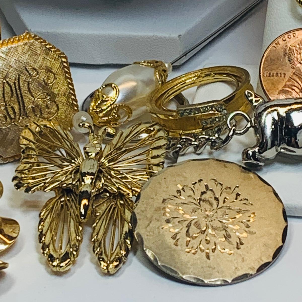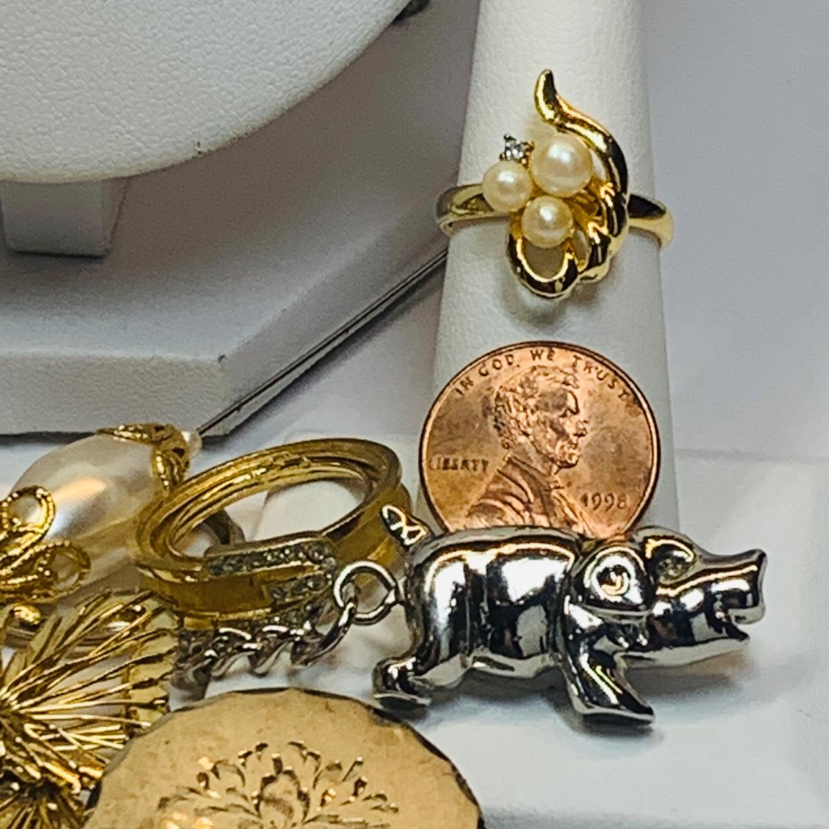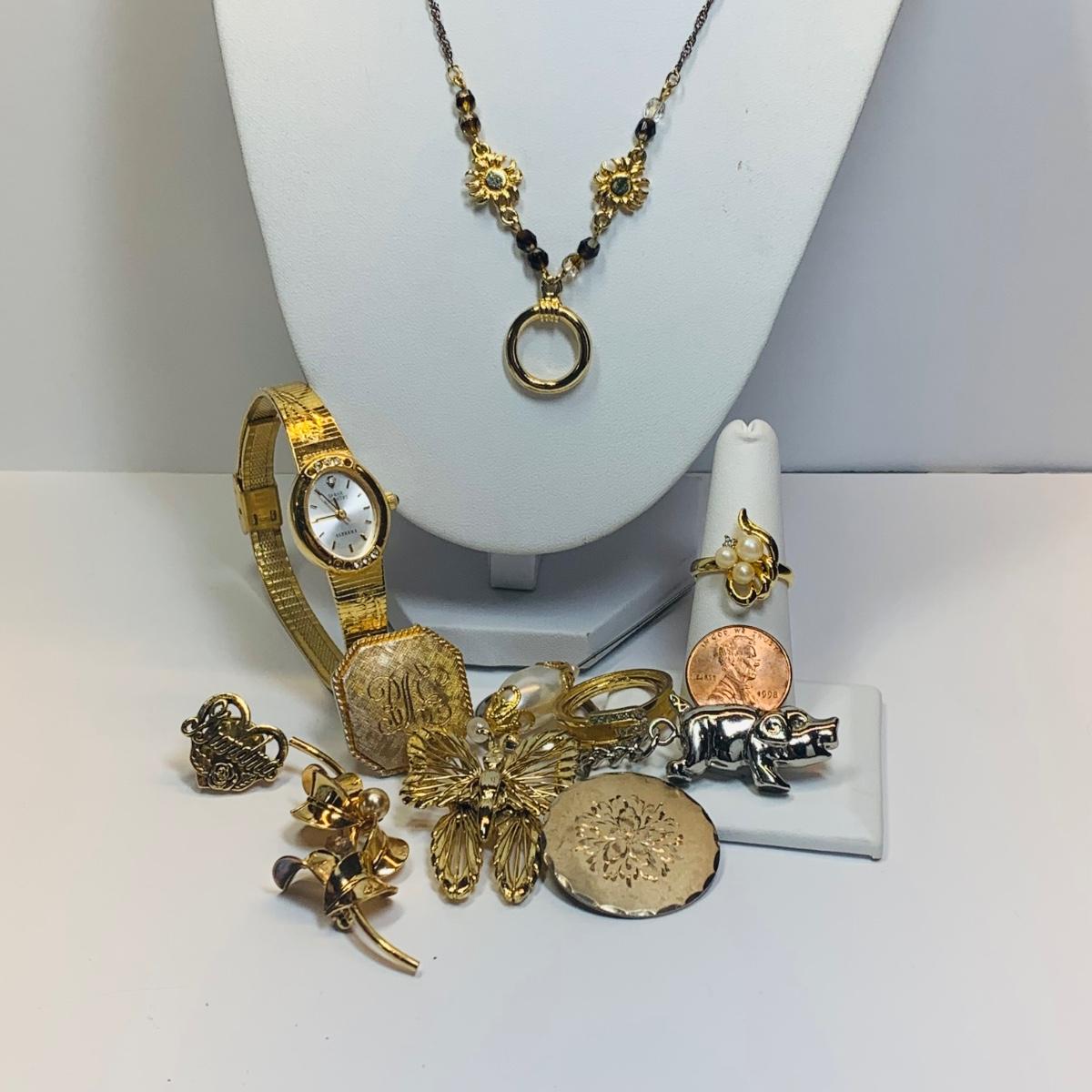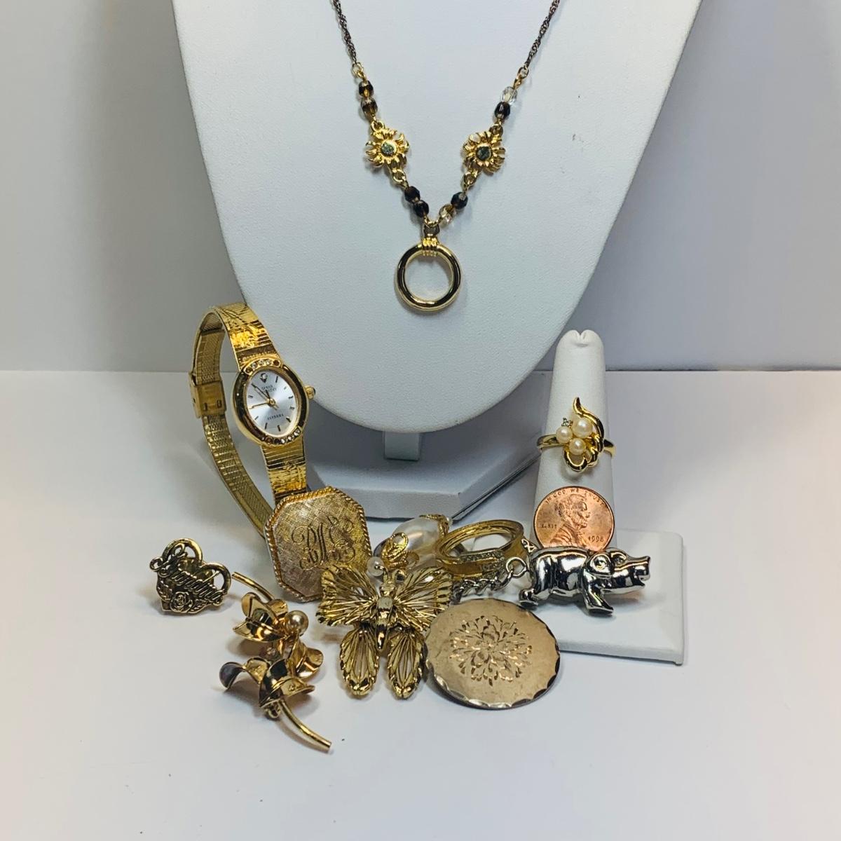 LOT 148R: Sarah Coventry Watch (Missing Stones), Adjustable Rings, Lucky Pig Kef Chain, 30" Necklace Gold Fill Pin w/Missing Pearl