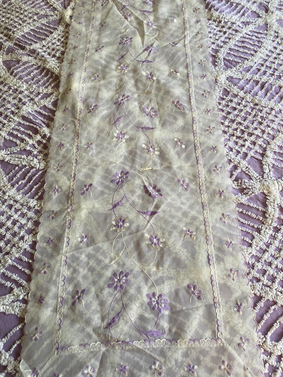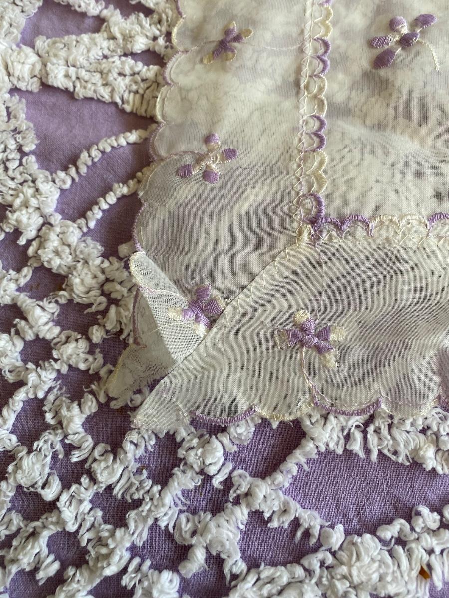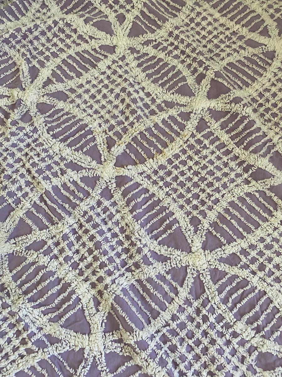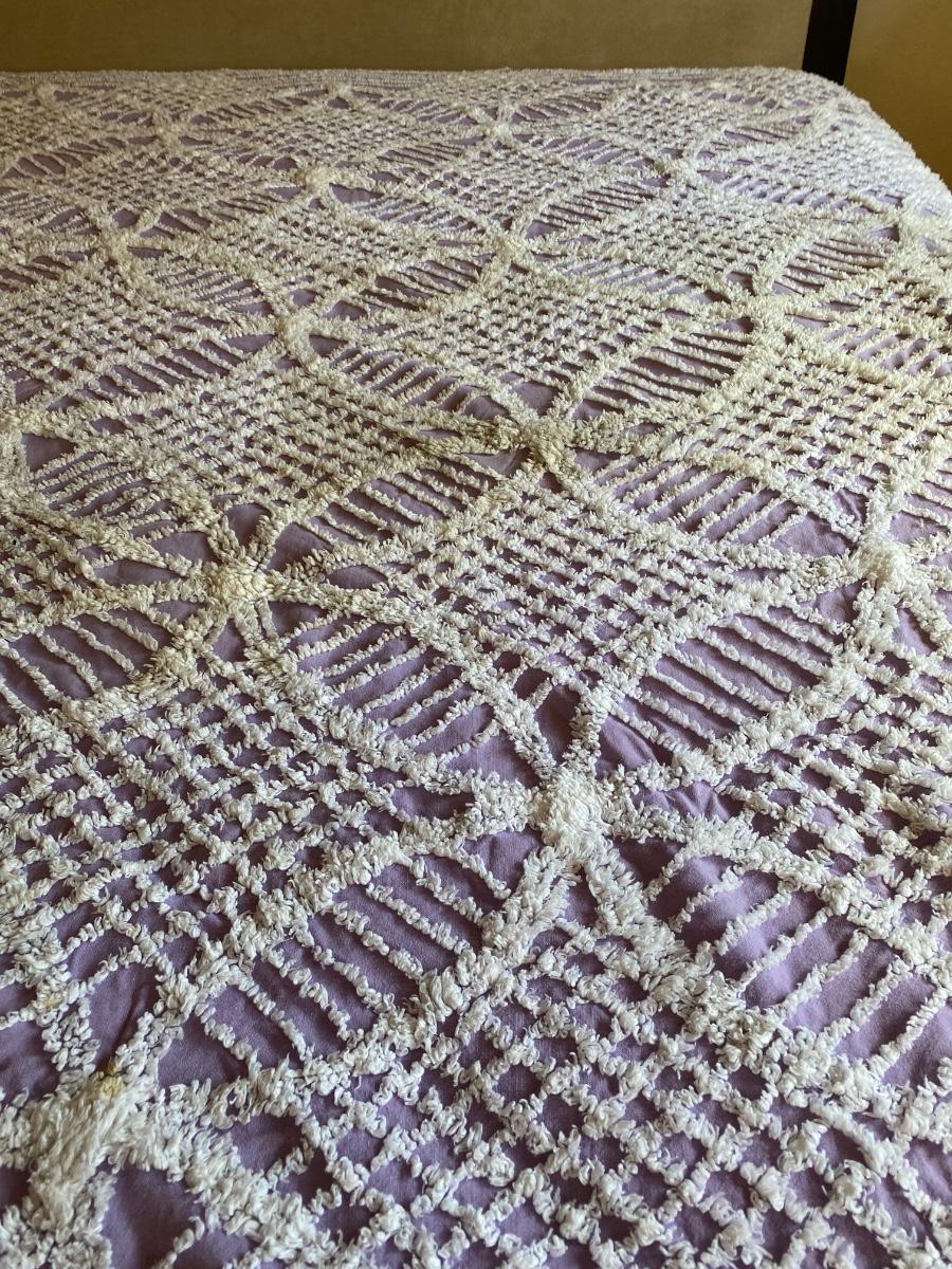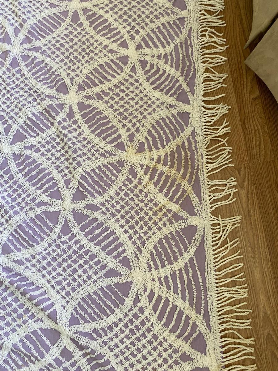 92x92 Purple and White Vintage bedspread. Bedspread is displayed on a queen size bed. Bedspread has marks and possible staining. Lot also includes two table doilies.