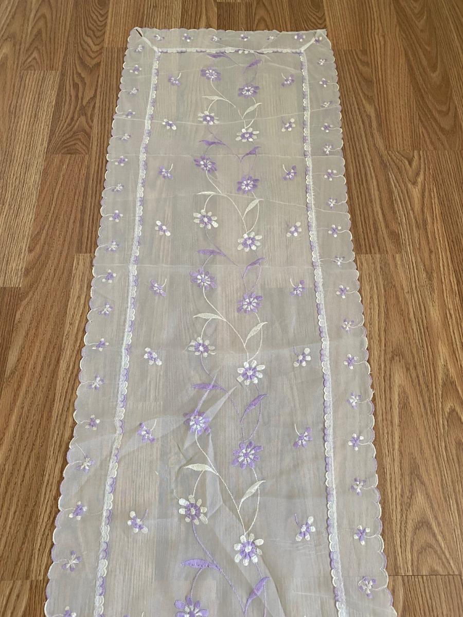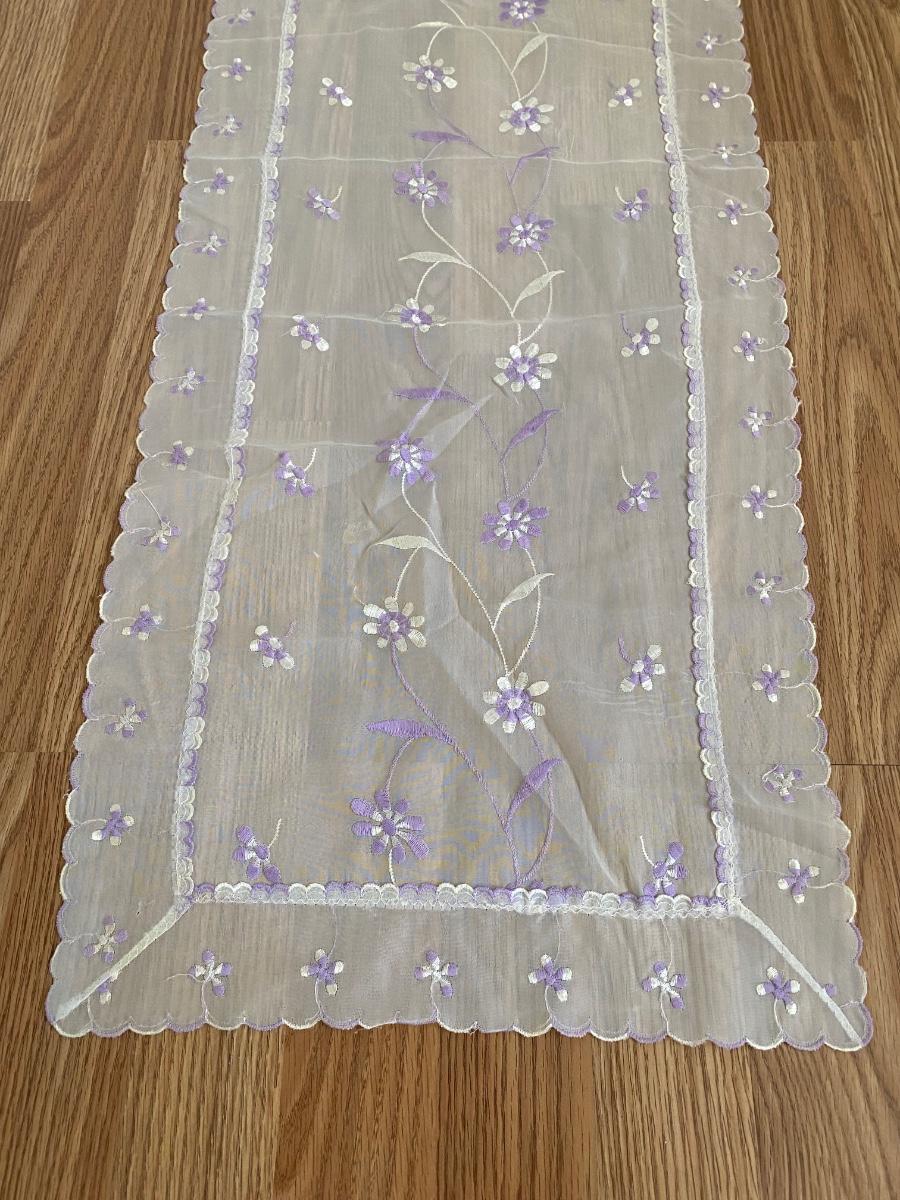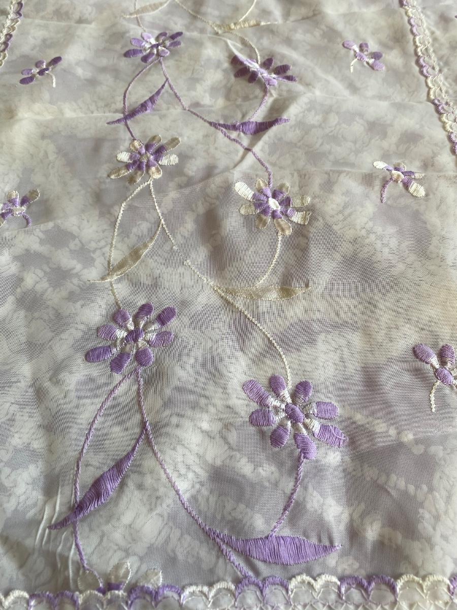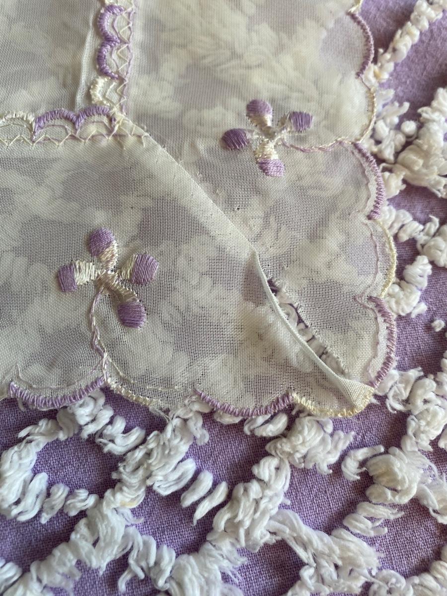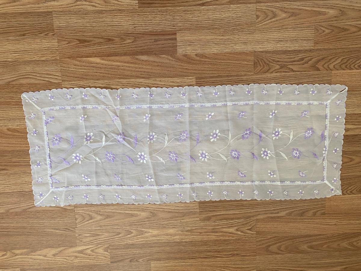 92x92 Purple and White Vintage bedspread. Bedspread is displayed on a queen size bed. Bedspread has marks and possible staining. Lot also includes two table doilies.