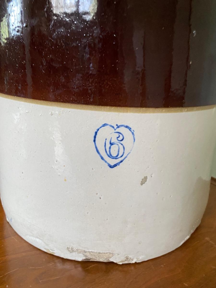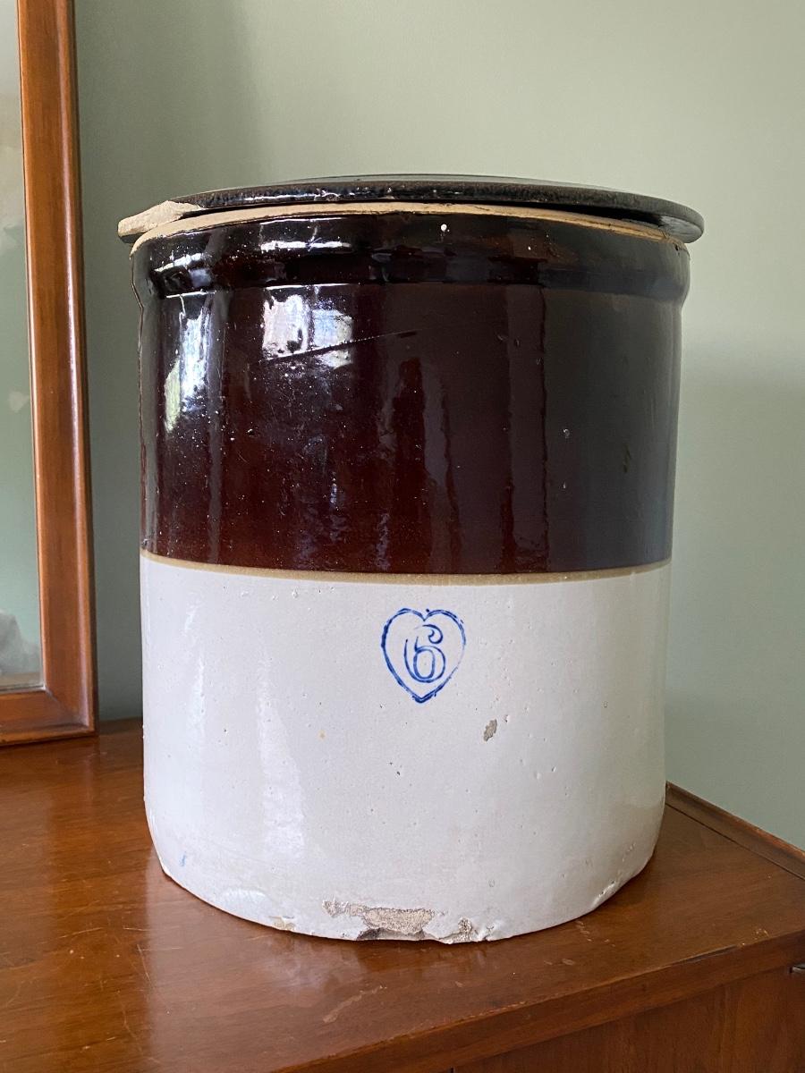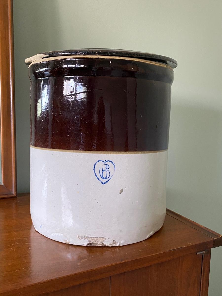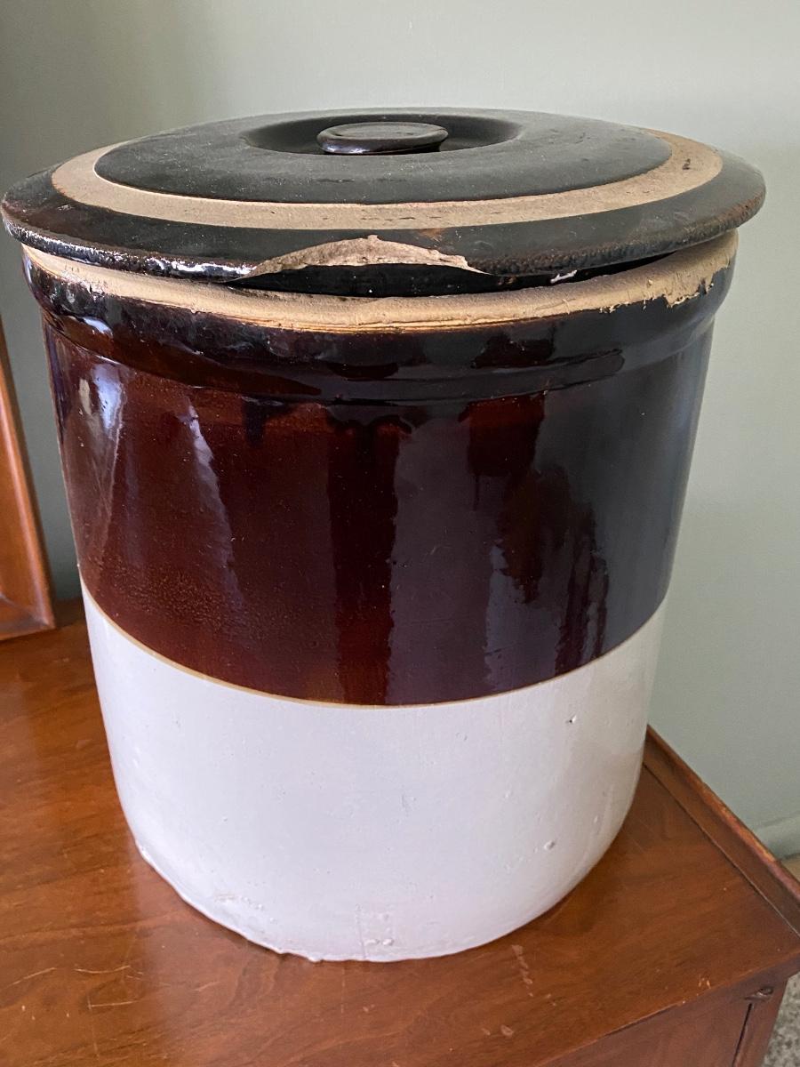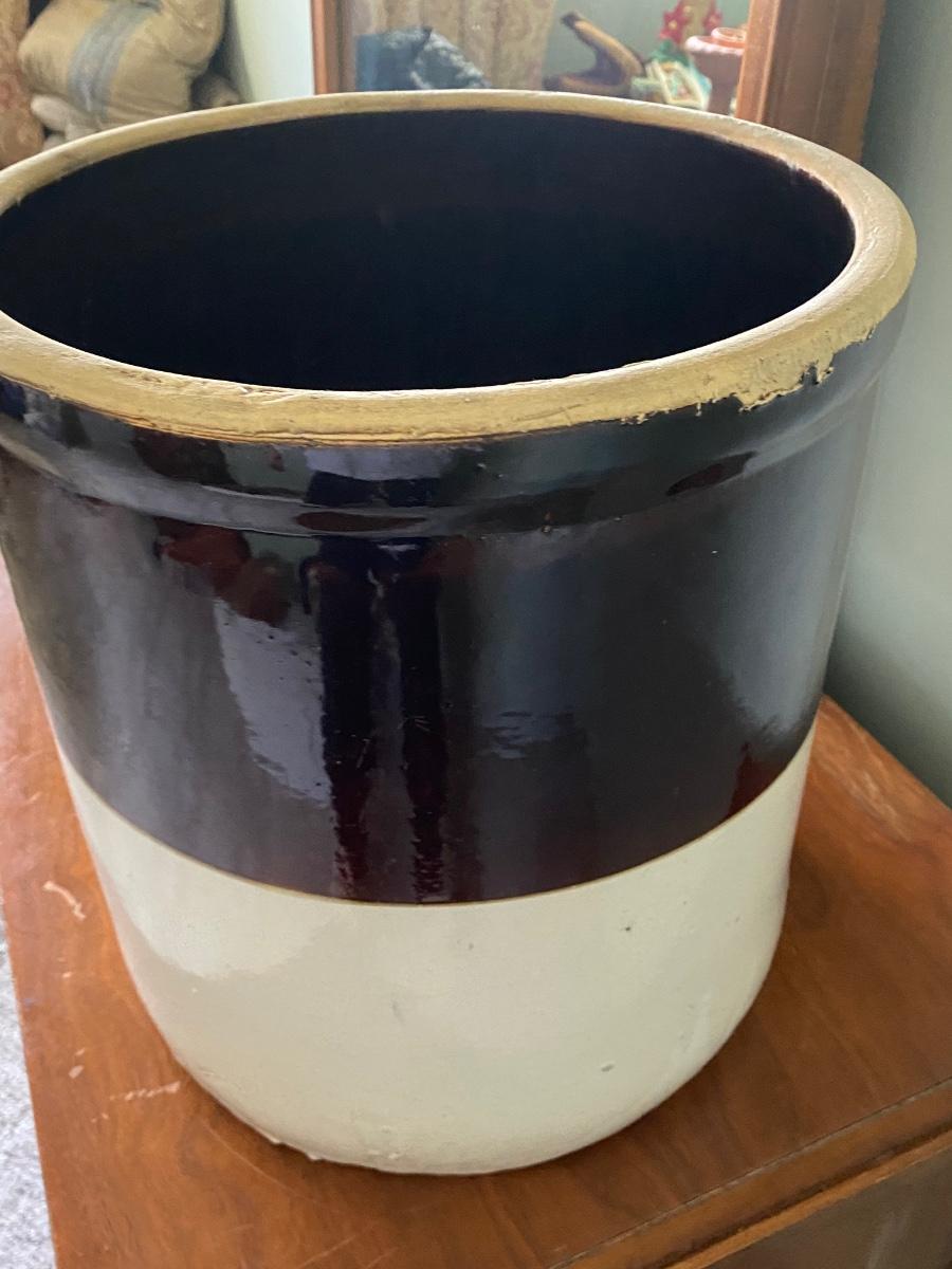 LOT 173C: #6 Stoneware Crock - 2 Tone Brown/Tan ... Great Porch Piece!