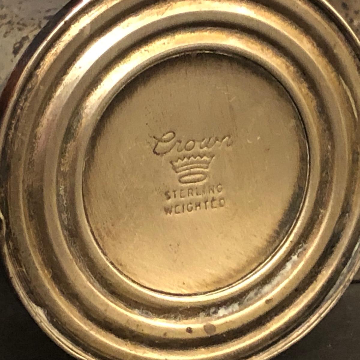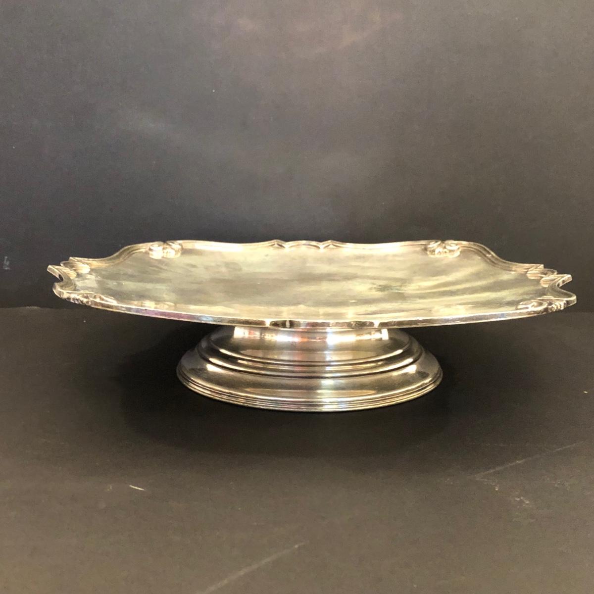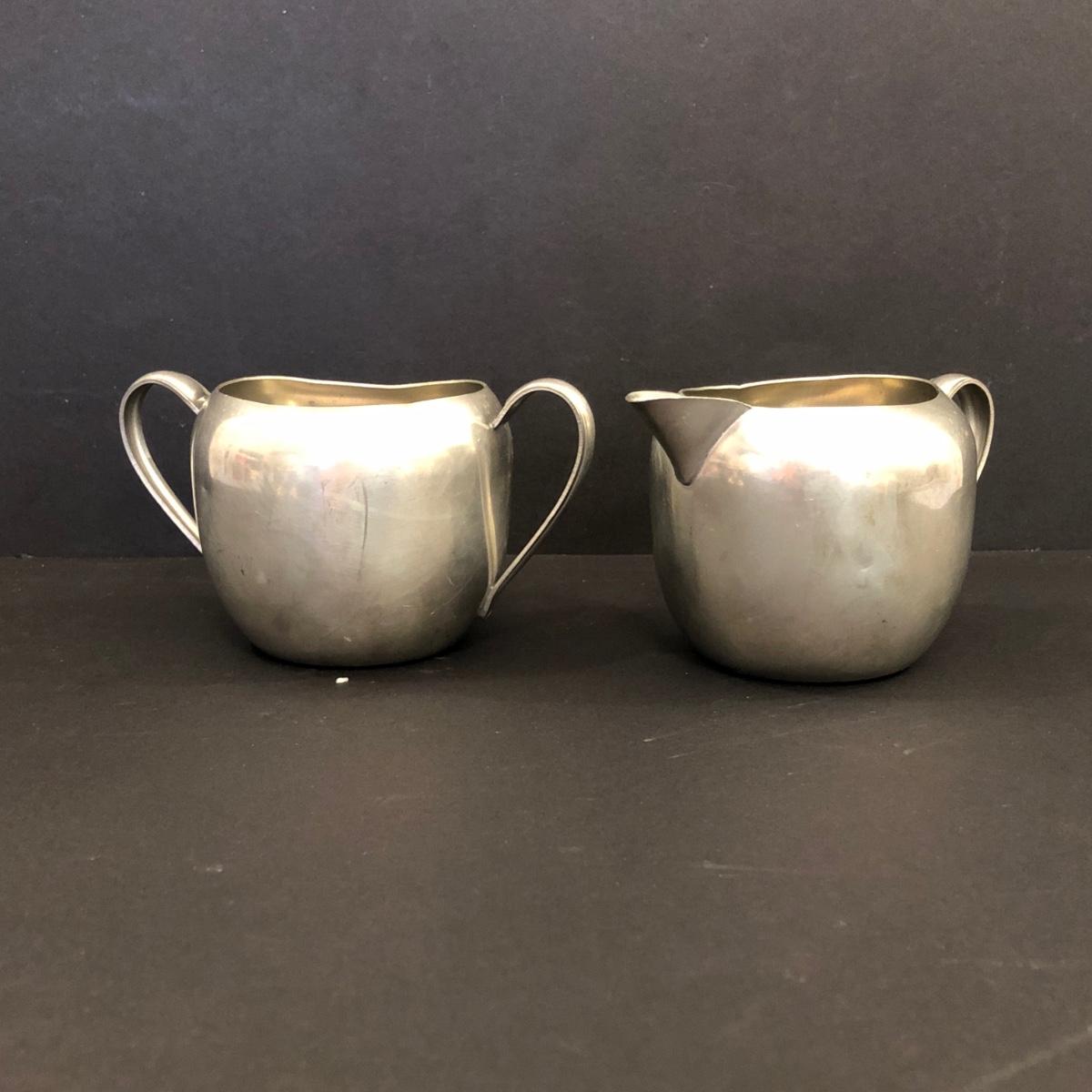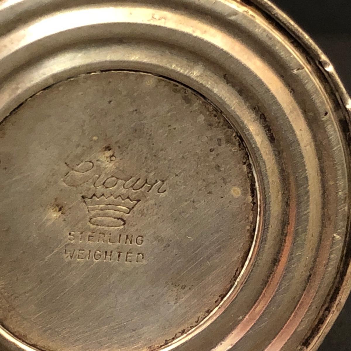 LOT 217M: Hogarth 18% Nickel Silver Cake Stand, Pewter Sugar Bowl w/ Creamer, Silver Plate Butter Dish, Crown Weighted Sterling S&P Shakers