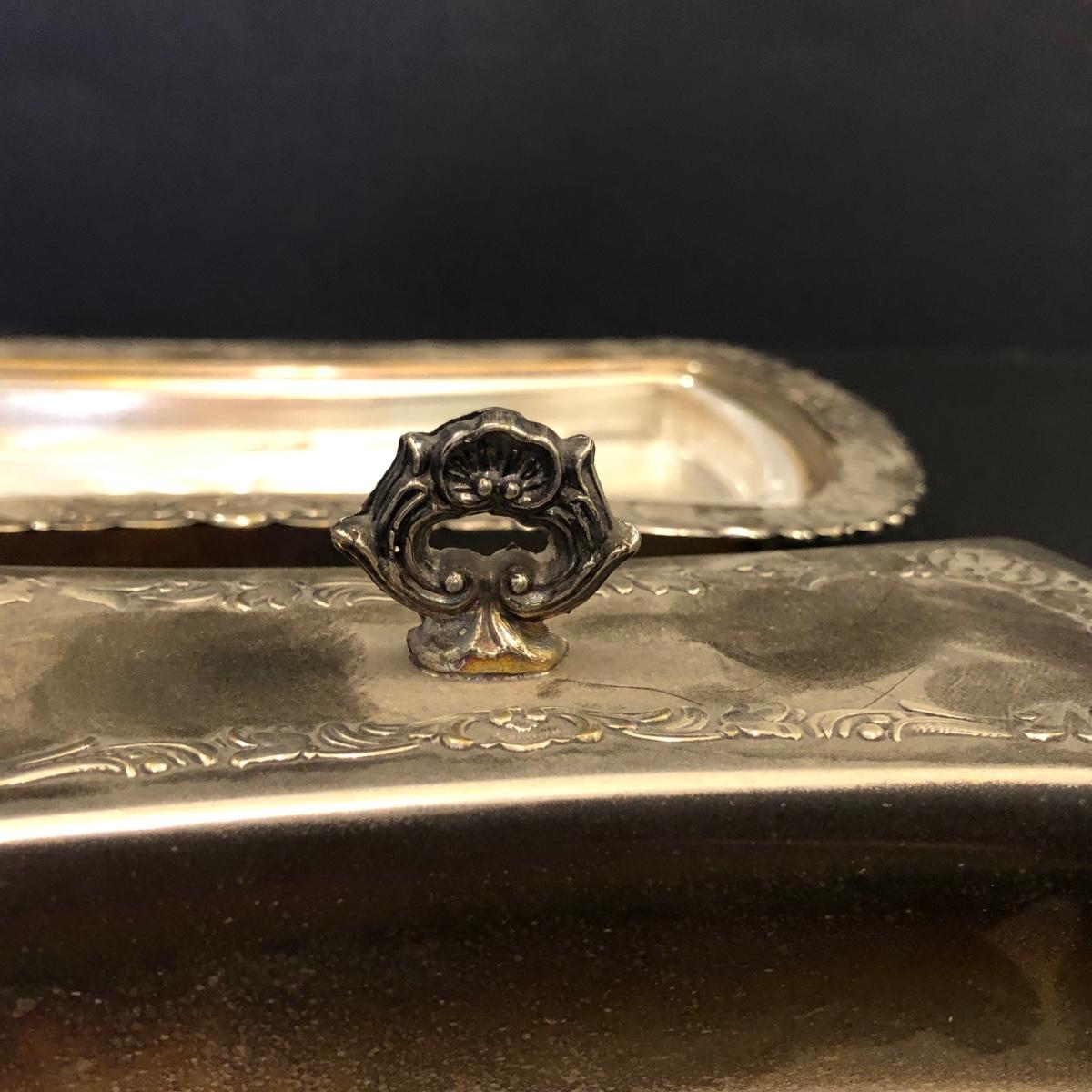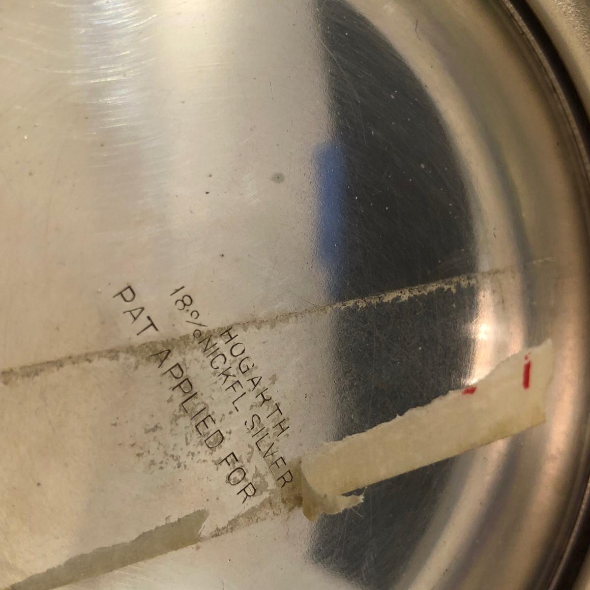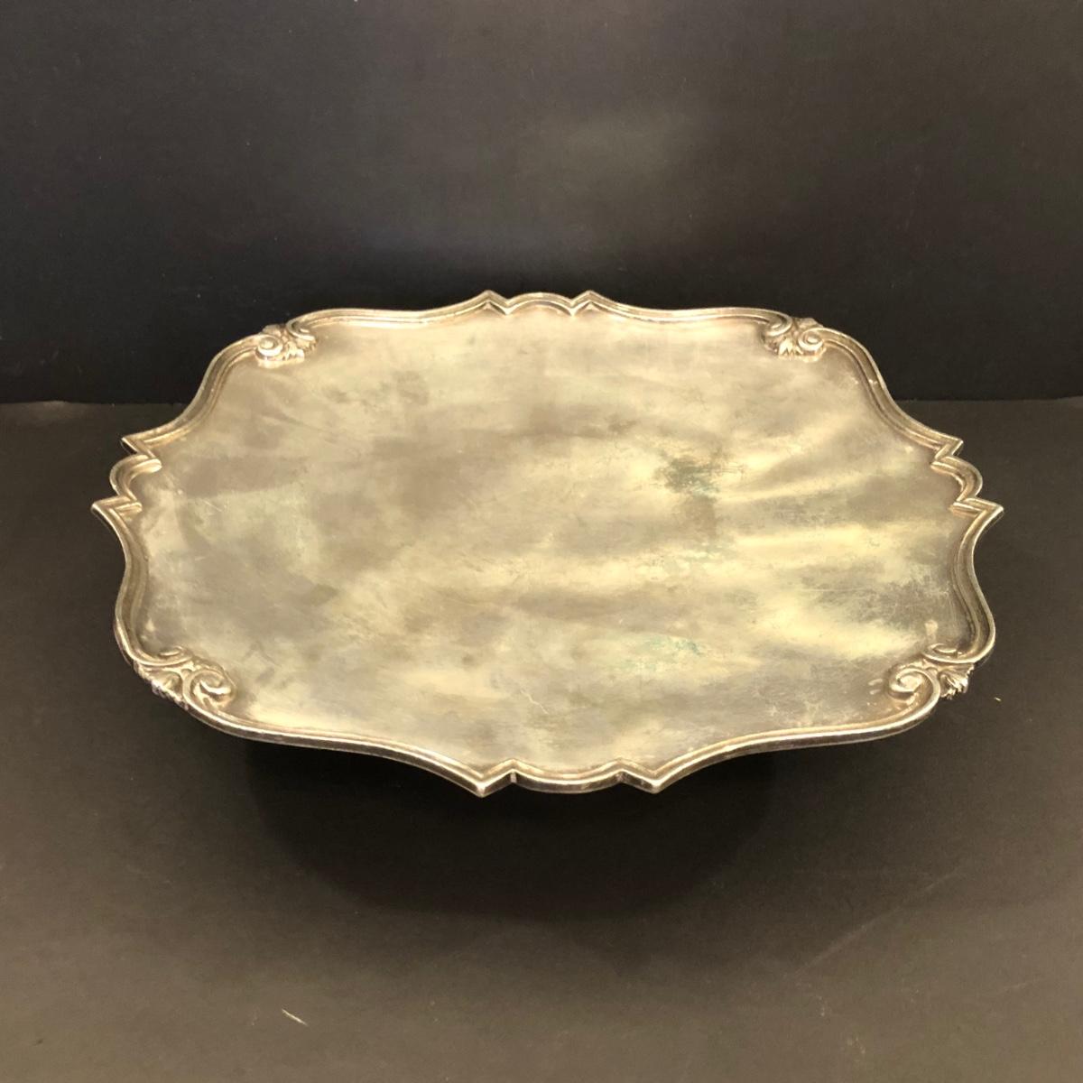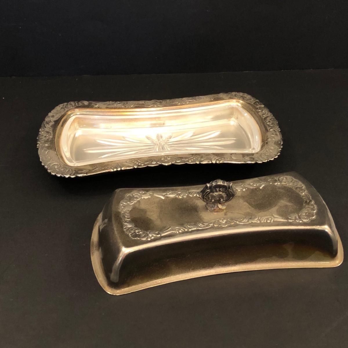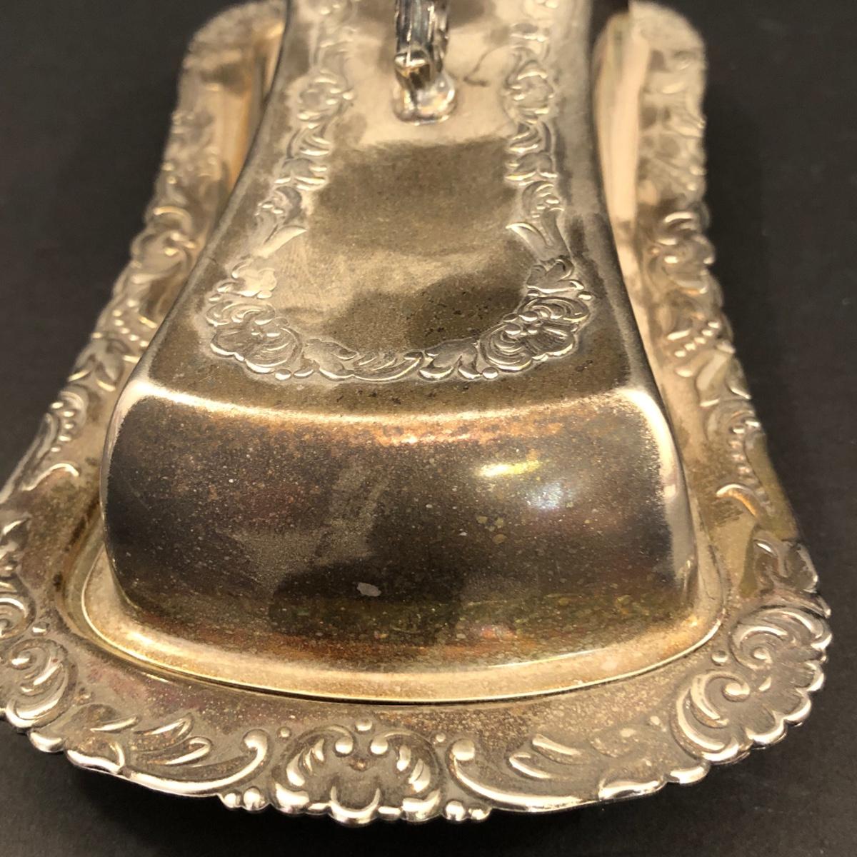 LOT 217M: Hogarth 18% Nickel Silver Cake Stand, Pewter Sugar Bowl w/ Creamer, Silver Plate Butter Dish, Crown Weighted Sterling S&P Shakers
