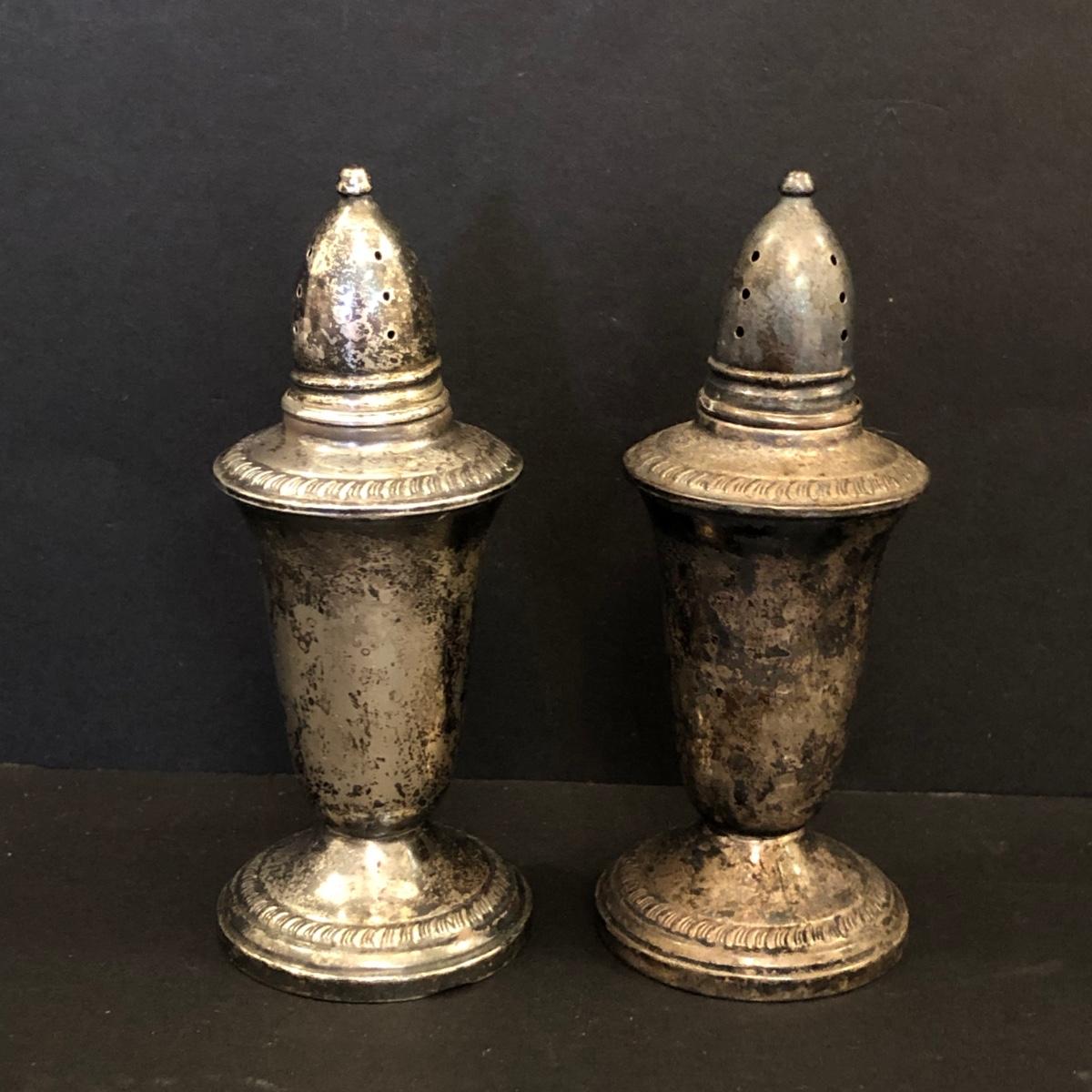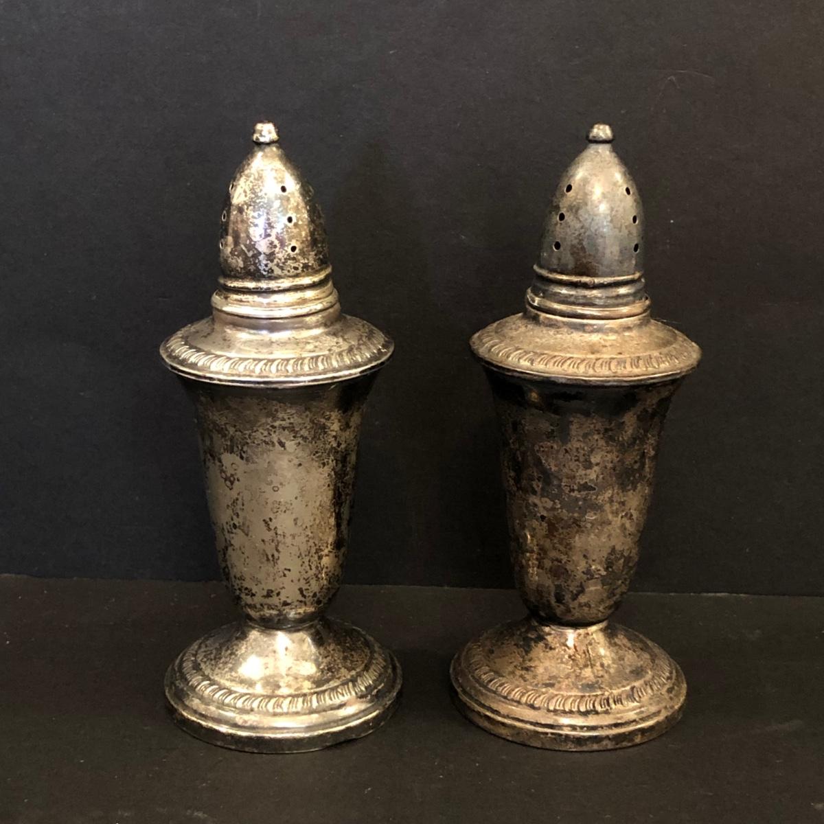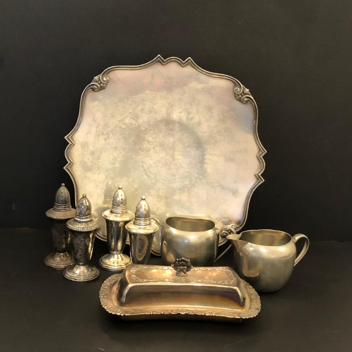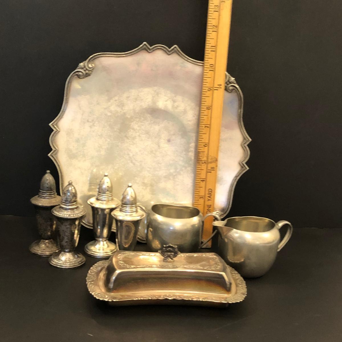 Includes a large cake stand, sugar bowl w/ creamer, butter dish and two sets of weighted sterling salt & pepper shakers.