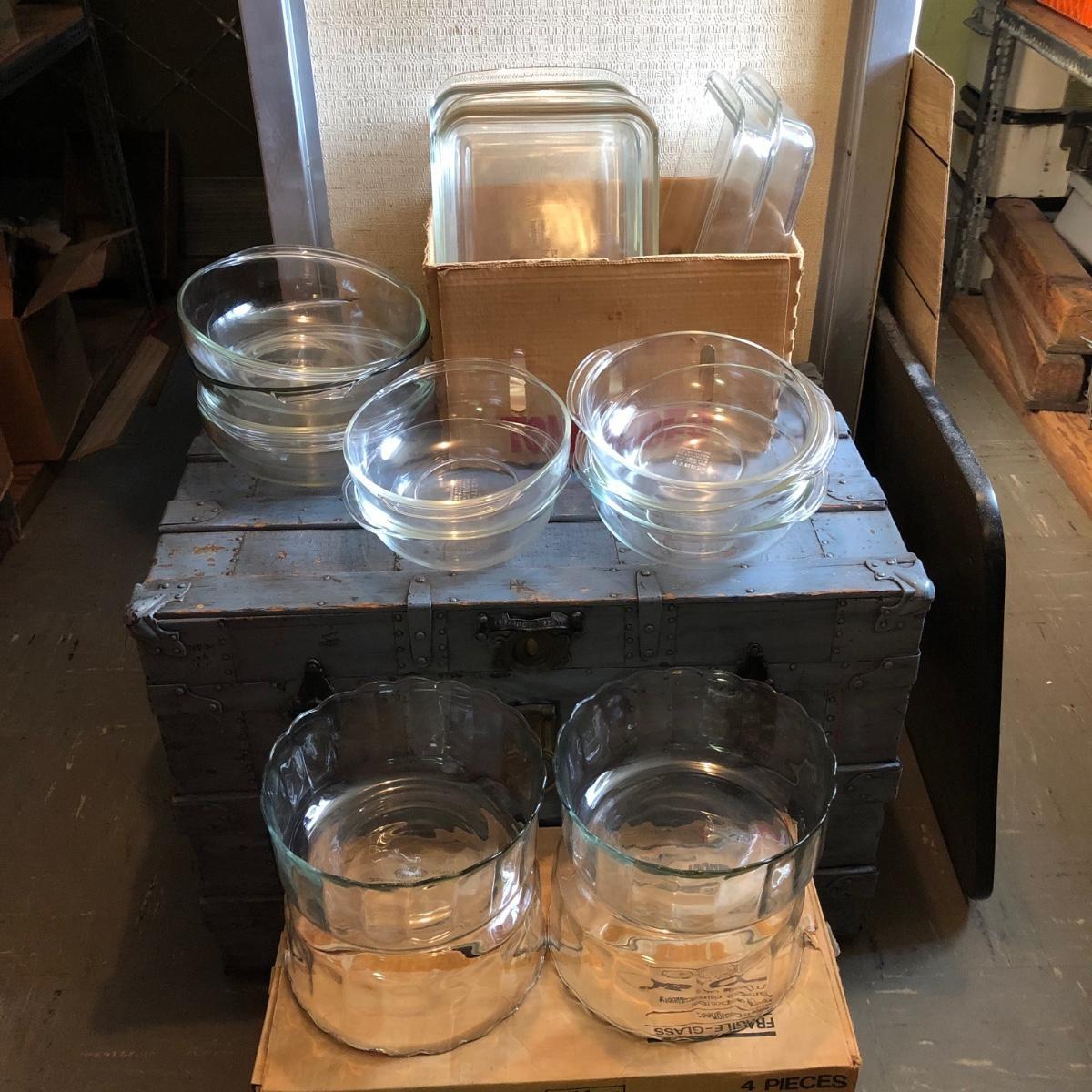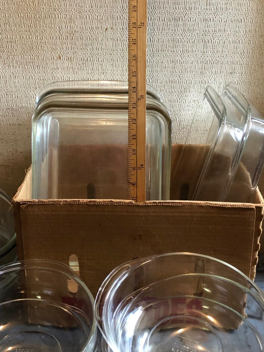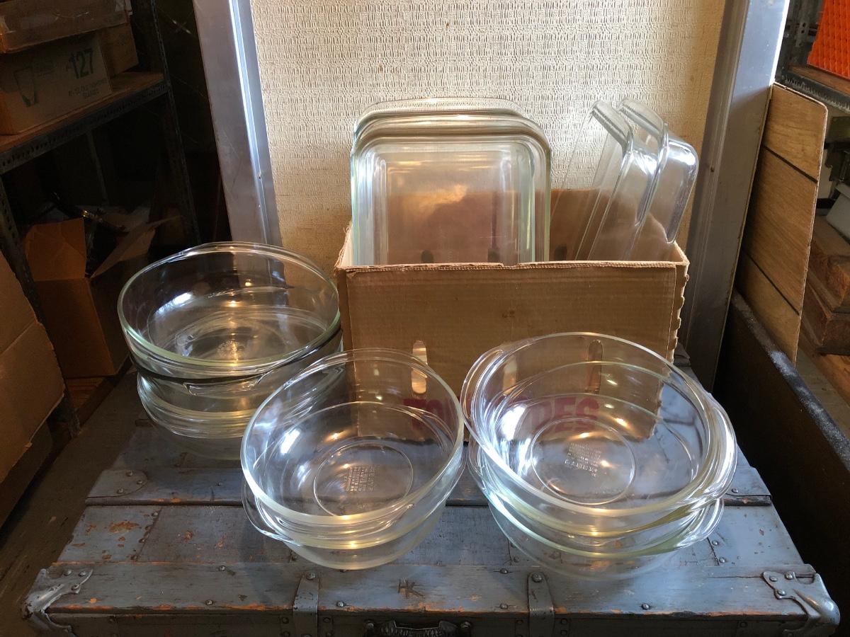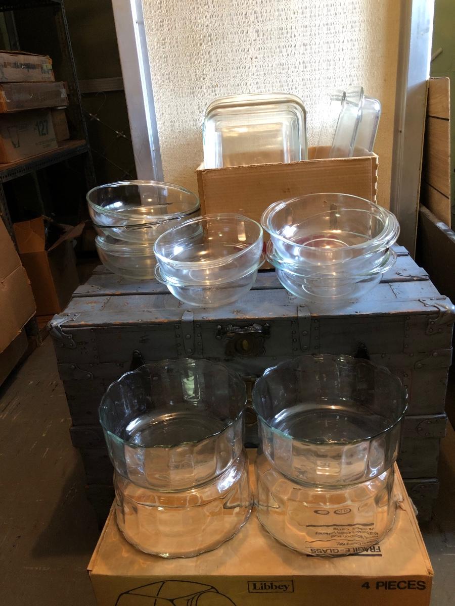 Includes several circular and rectangular glass Pyrex baking dishes and four glass trifle bowls.