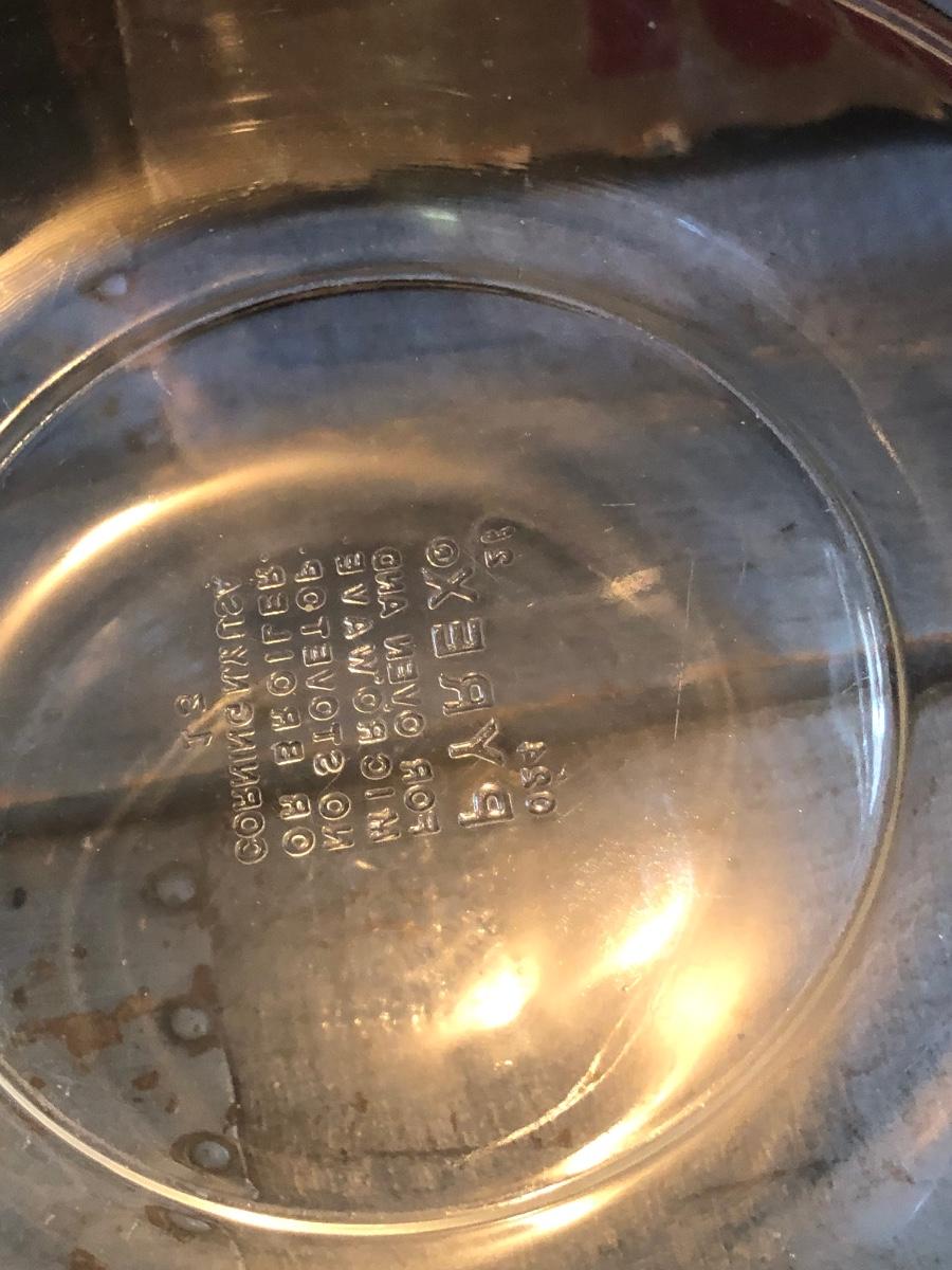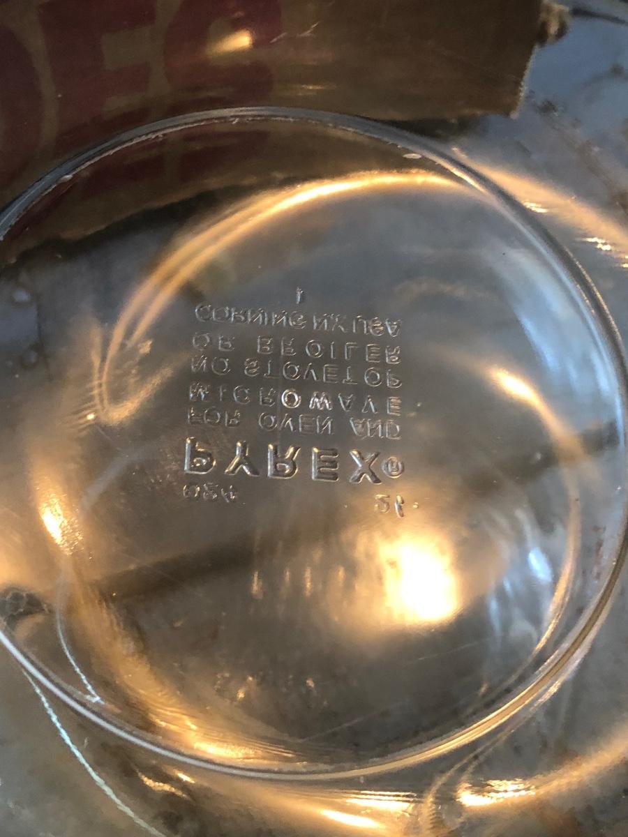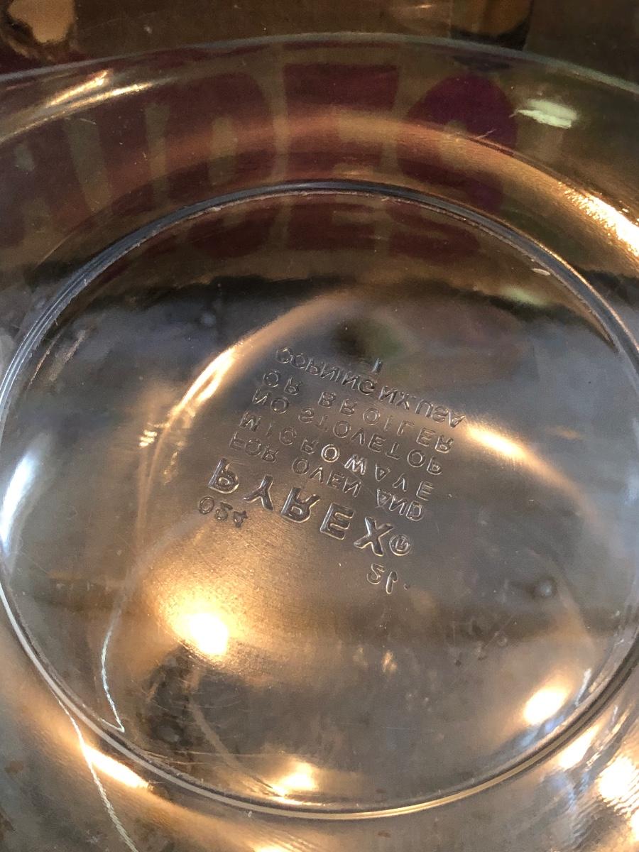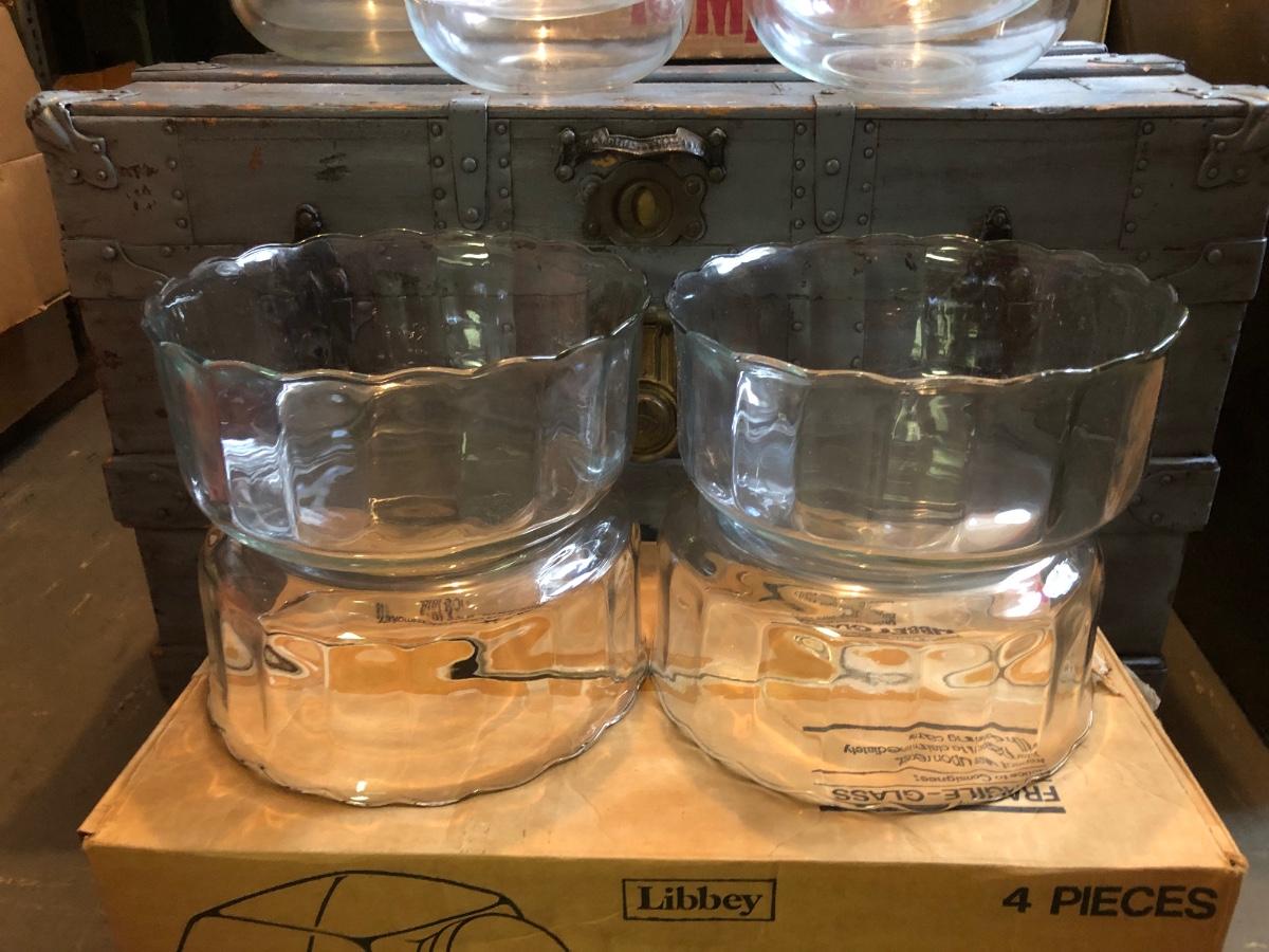 Includes several circular and rectangular glass Pyrex baking dishes and four glass trifle bowls.