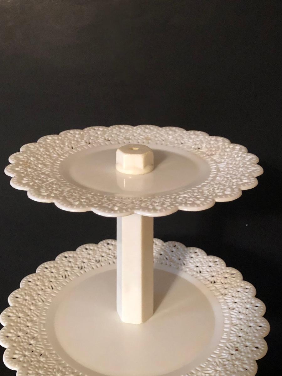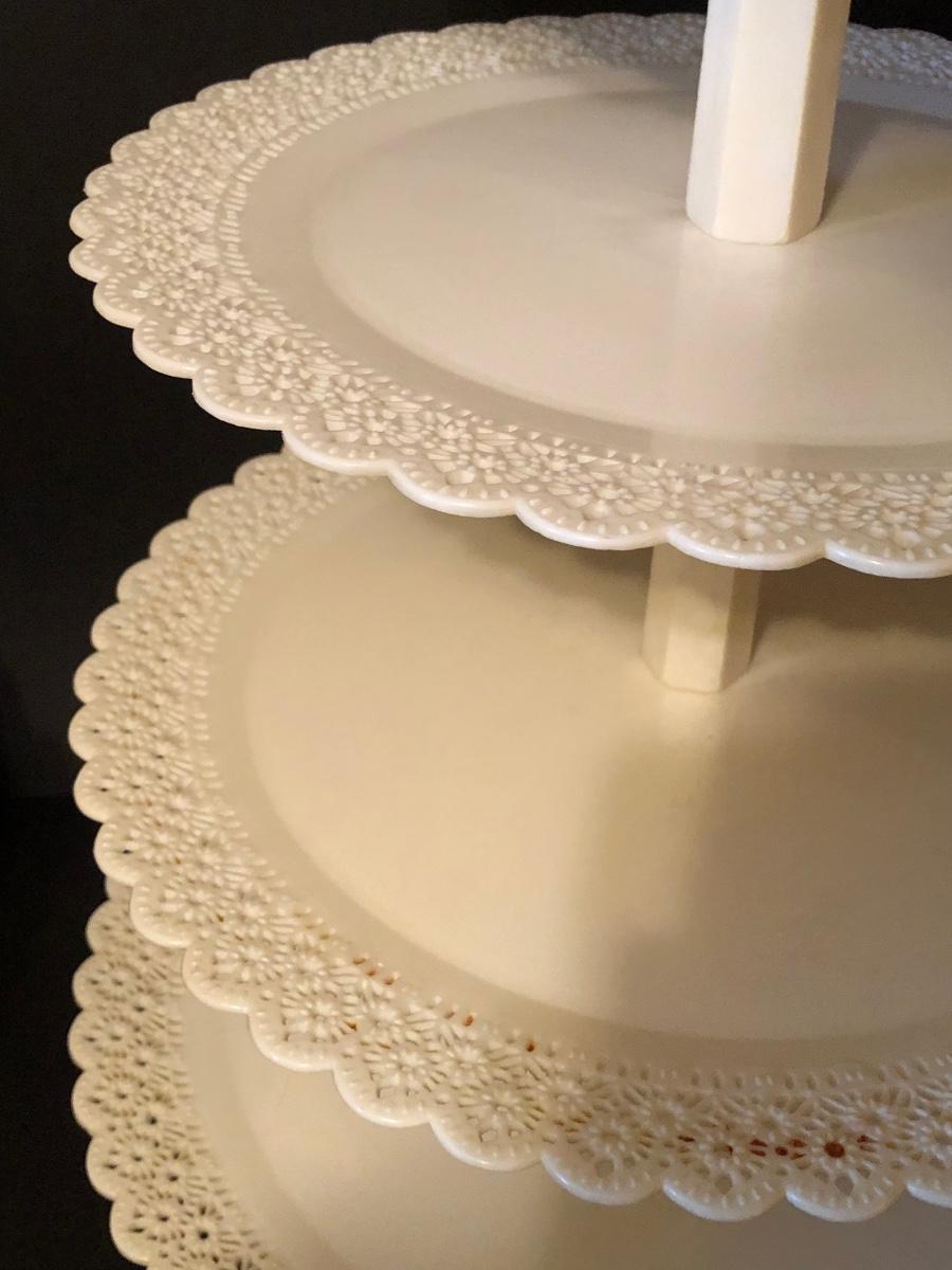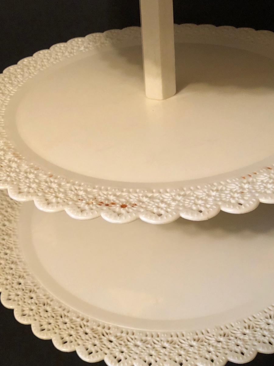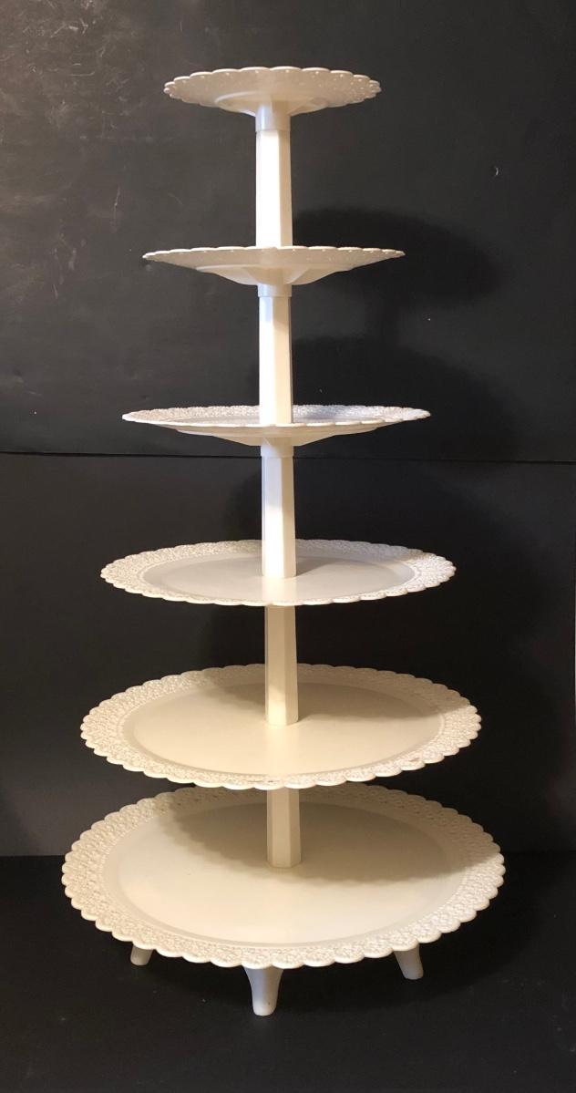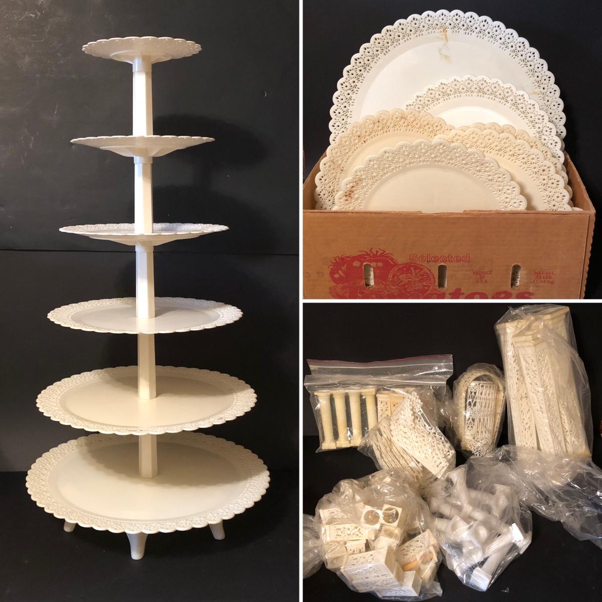 Includes at least one complete dessert stand measuring 34 inches tall, more pieces to make another, but not a complete set. Also includes pillars and other decorative elements. Condition is used.