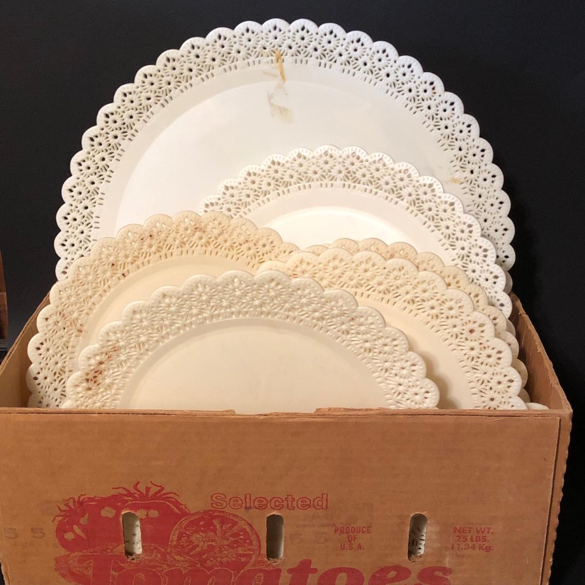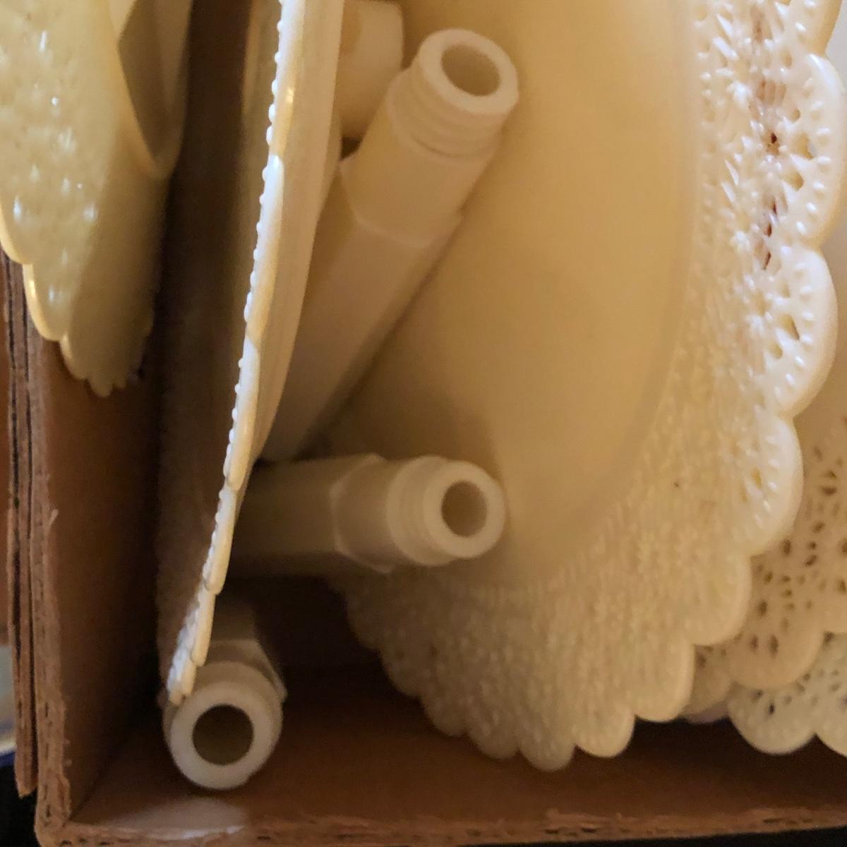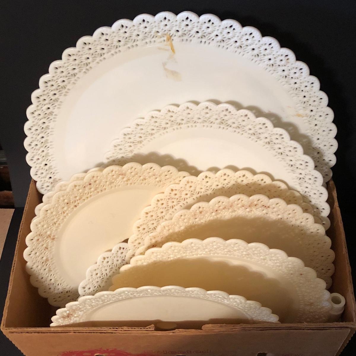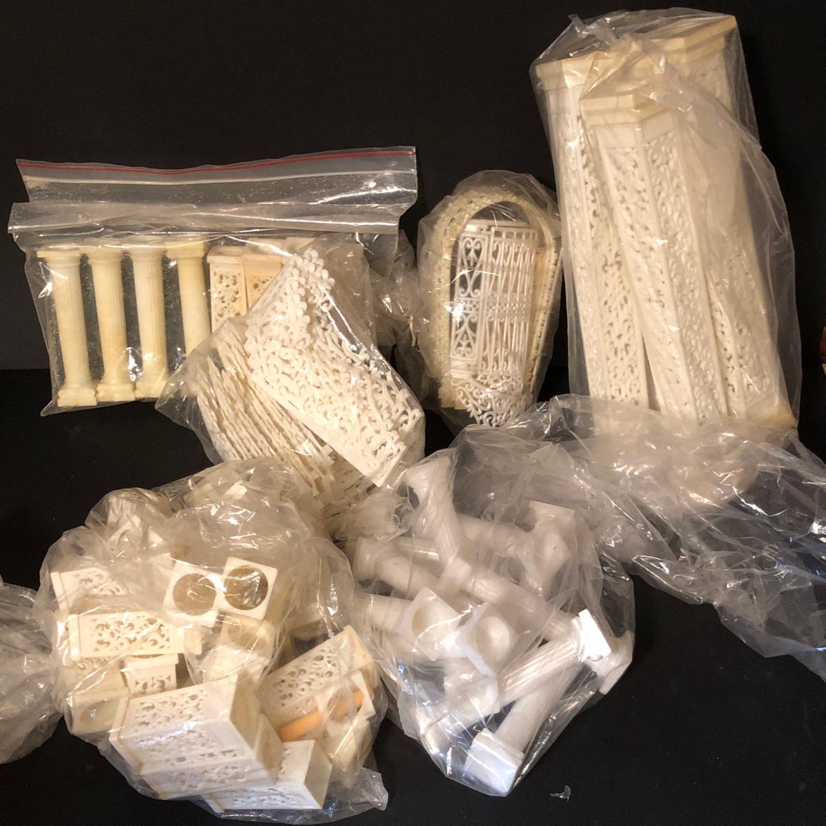 Includes at least one complete dessert stand measuring 34 inches tall, more pieces to make another, but not a complete set. Also includes pillars and other decorative elements. Condition is used.