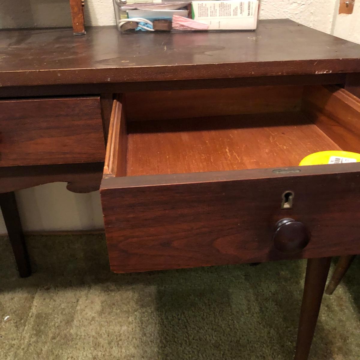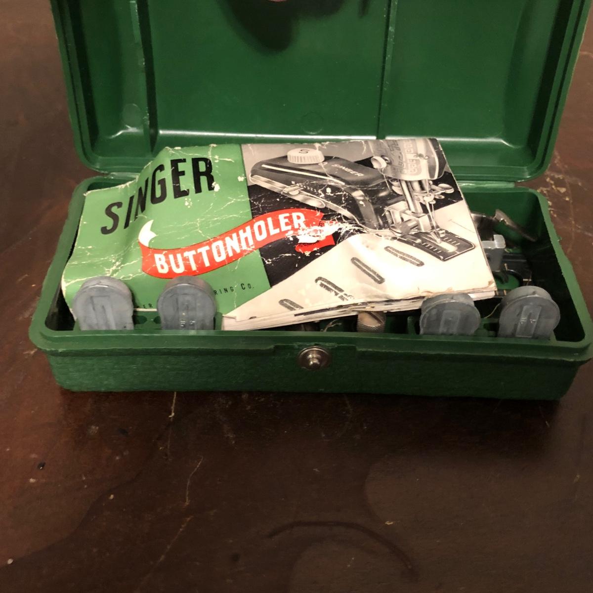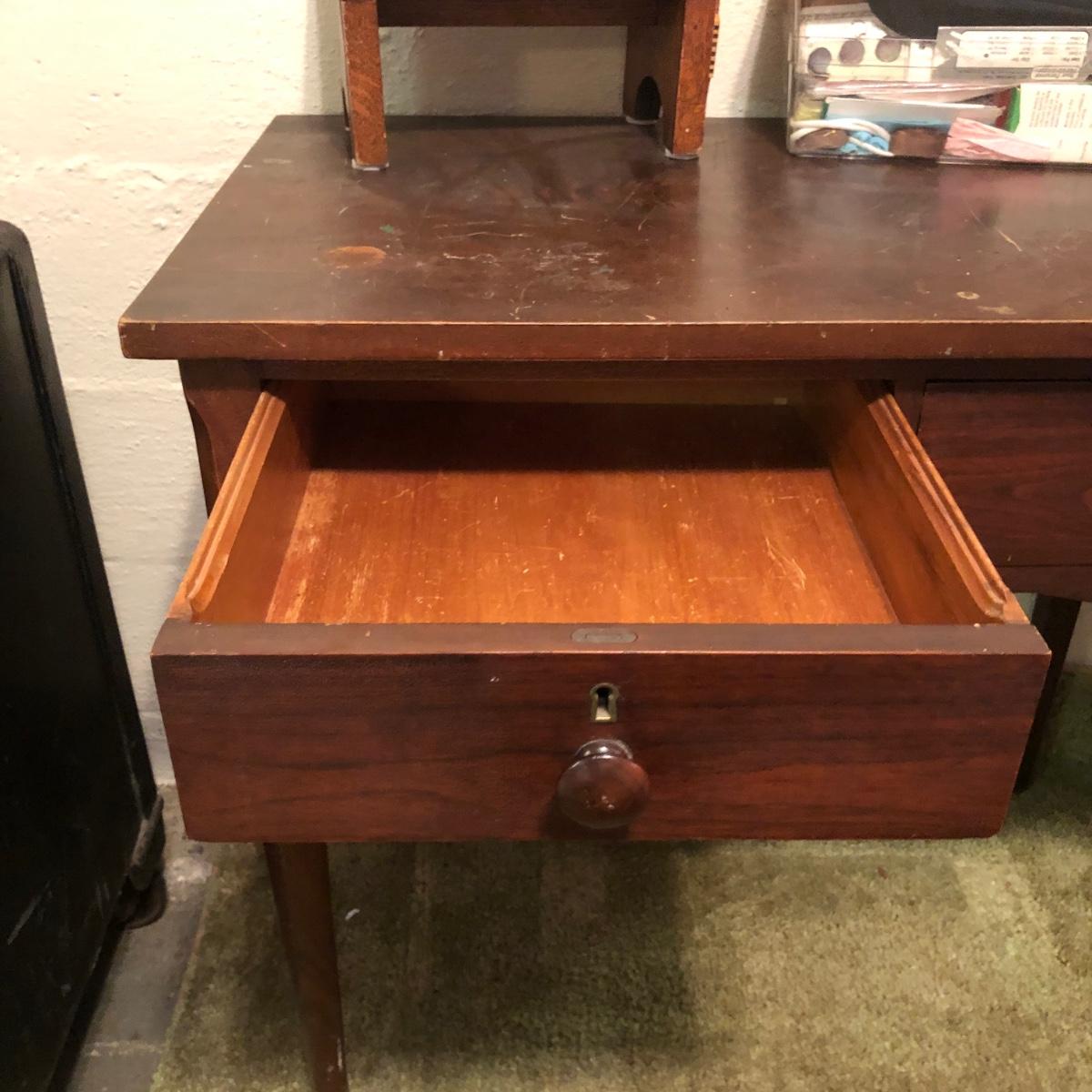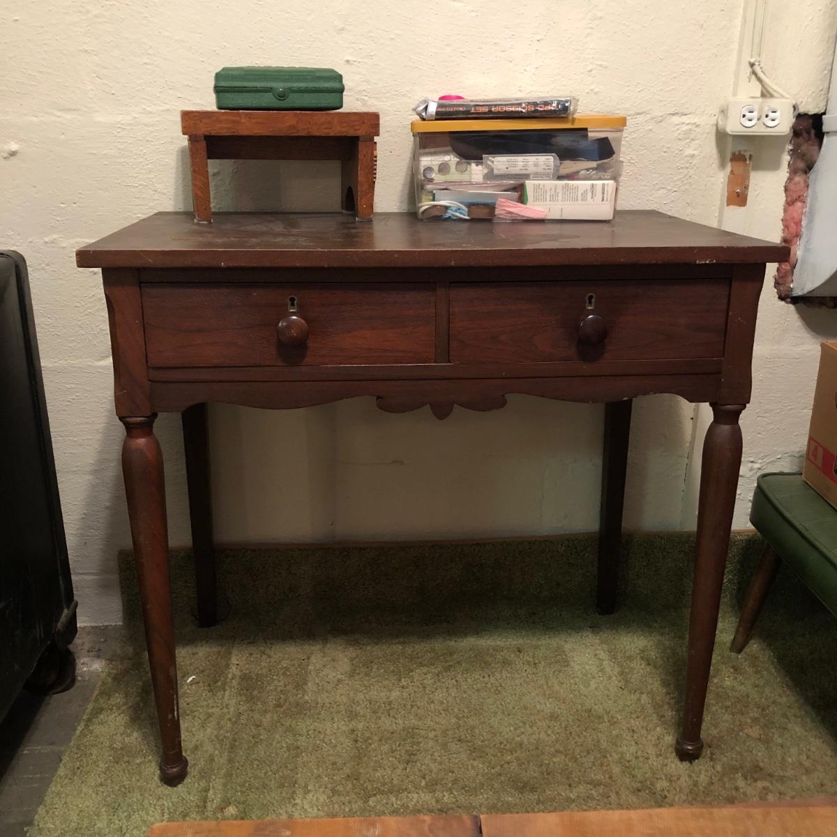 Desk measures 33W x 20D x 30H. Includes sewing and craft supplies shown in photos. Also includes button hole maker by Singer in its case and a small wooden bench.