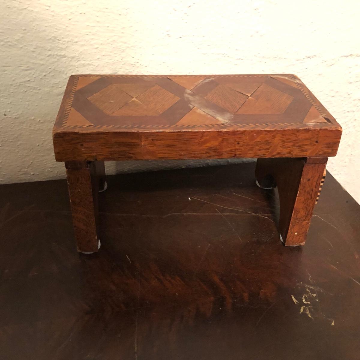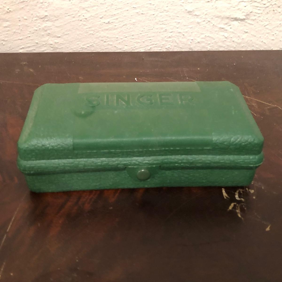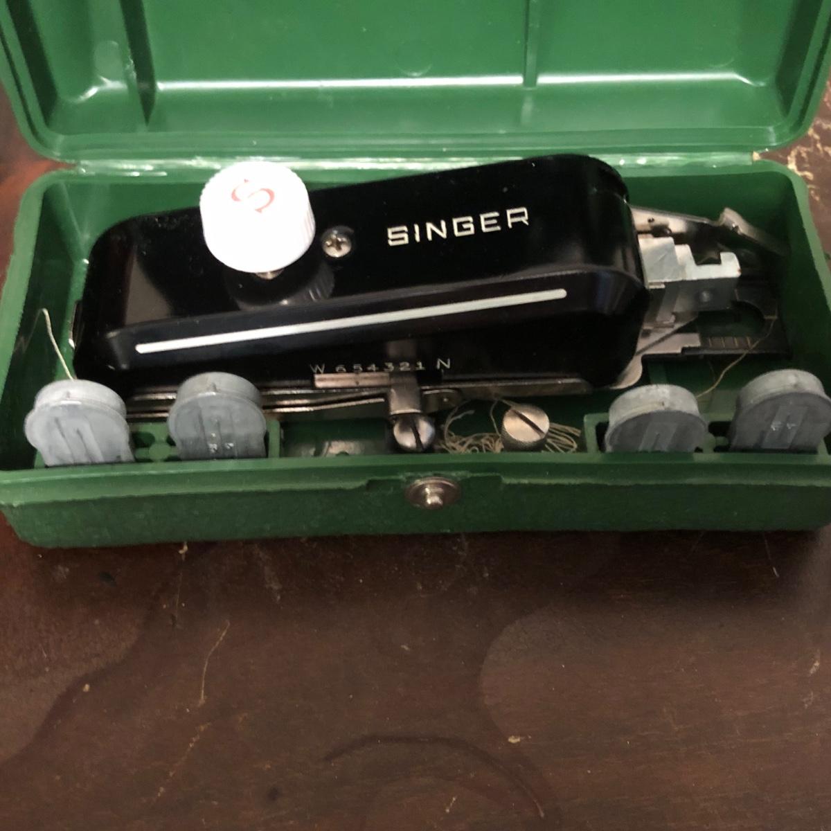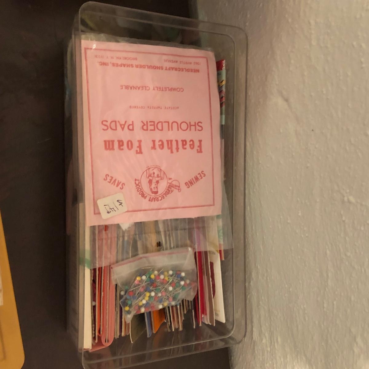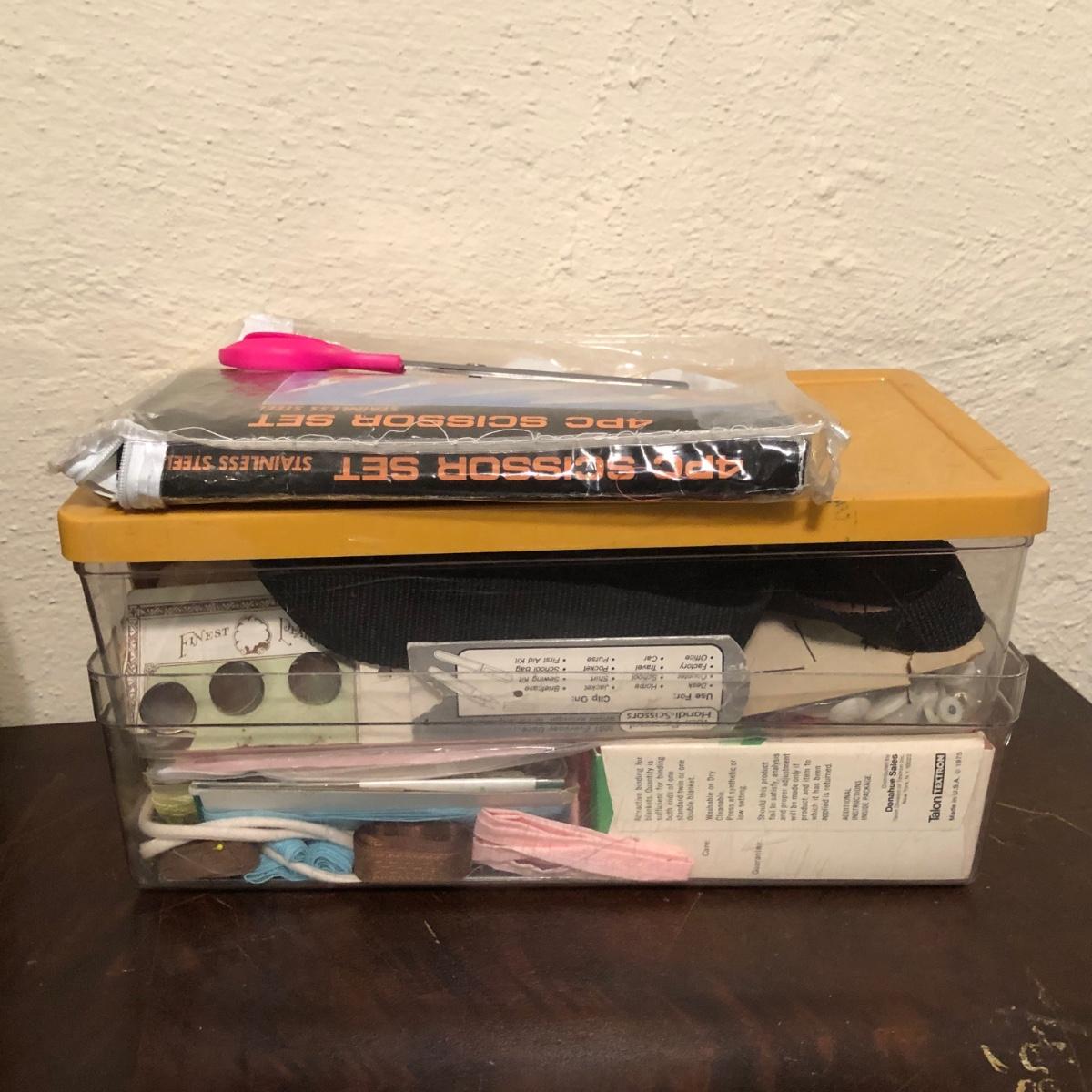 Desk measures 33W x 20D x 30H. Includes sewing and craft supplies shown in photos. Also includes button hole maker by Singer in its case and a small wooden bench.