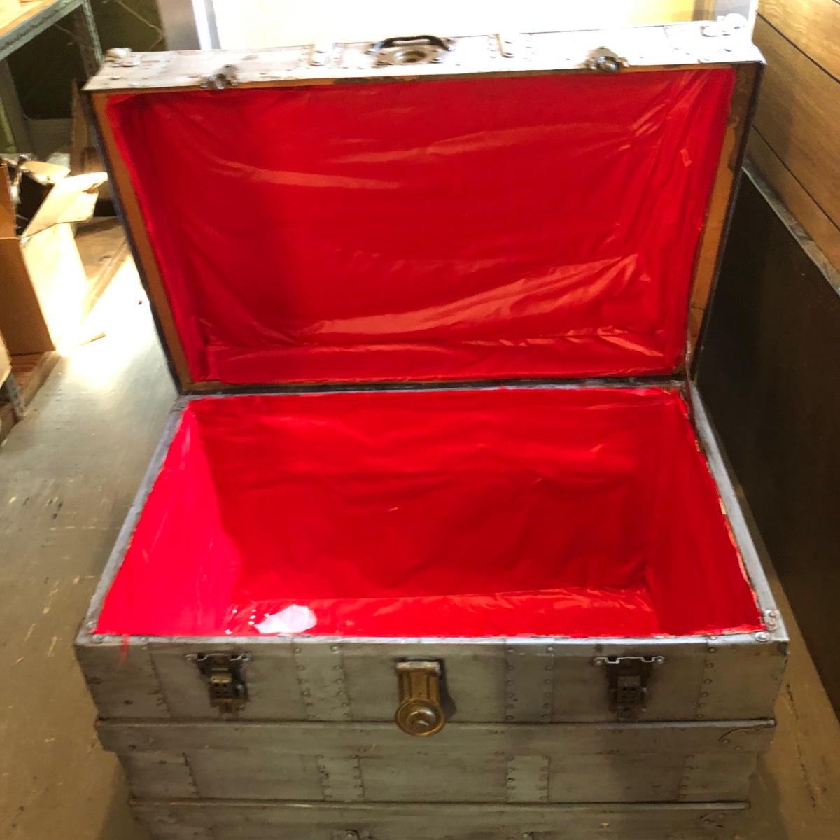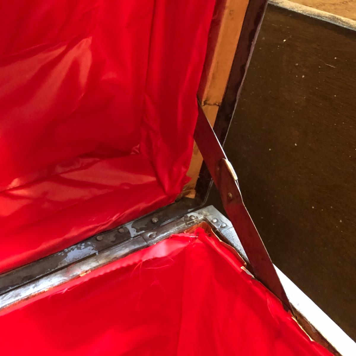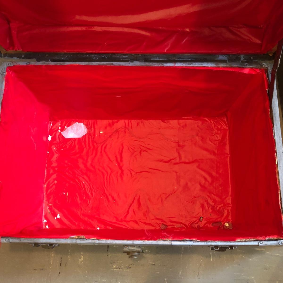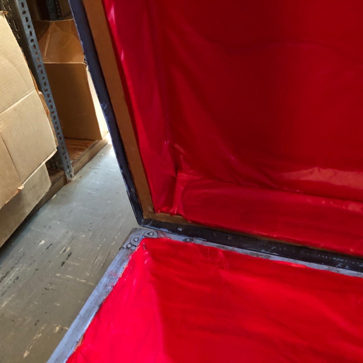 Chest is in the basement of the home and measures 30W x 19D x 22H. Inside it is lined with red fabric. Does not have any handles.