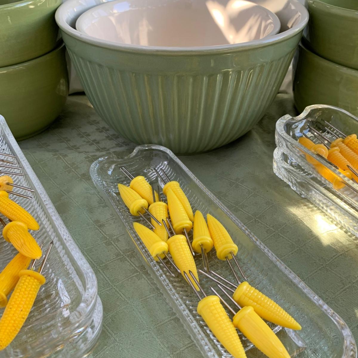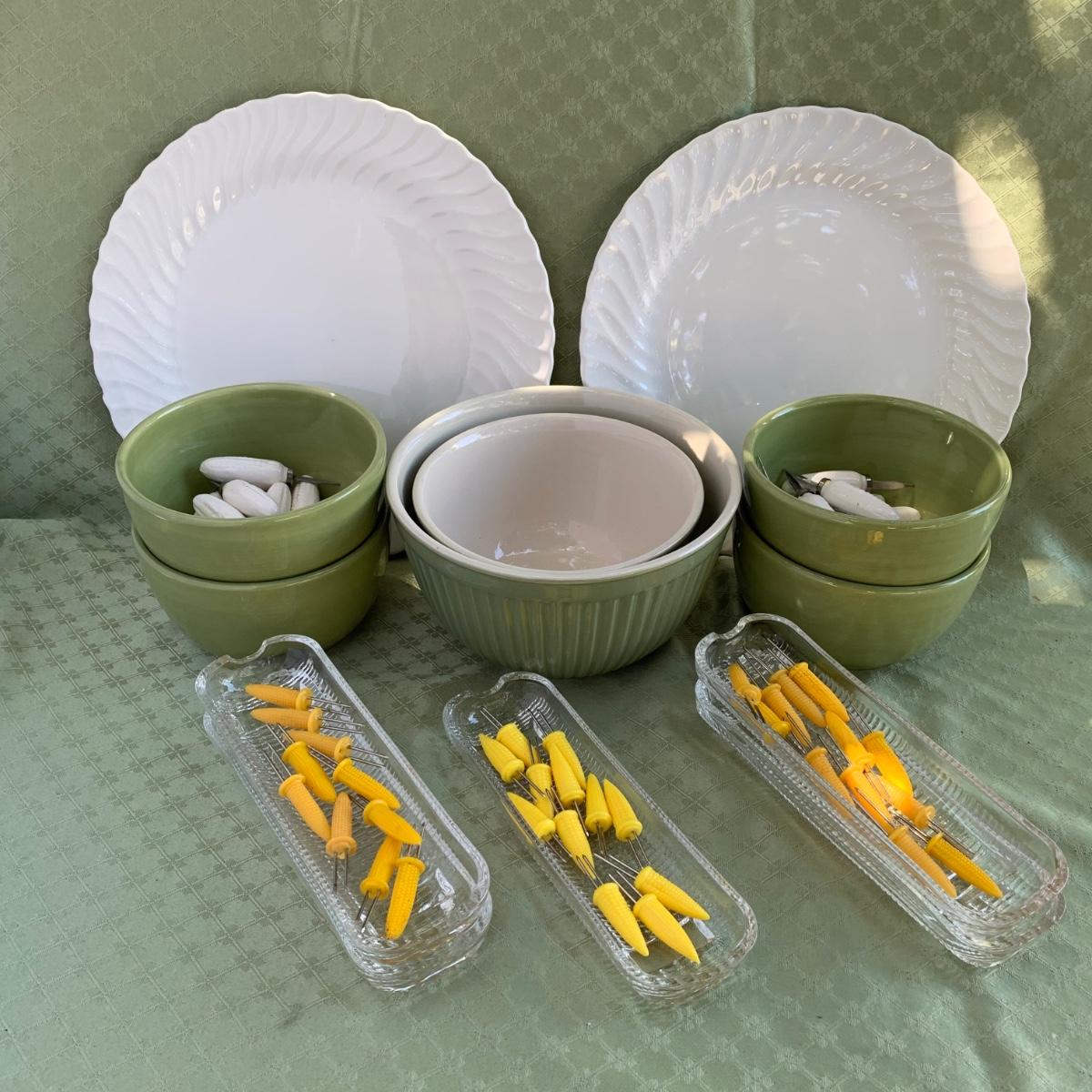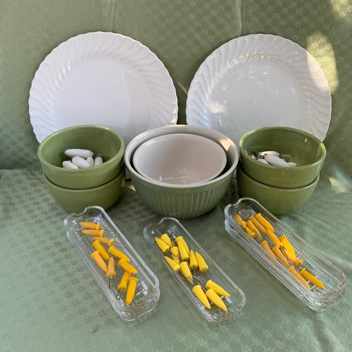 LOT 365R: Serving Collection: White Platters, Espana Green Bowls, Glass Corn Dishes, Corn Holders,