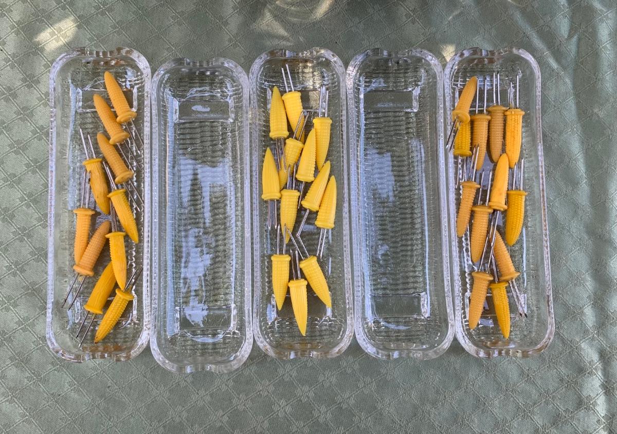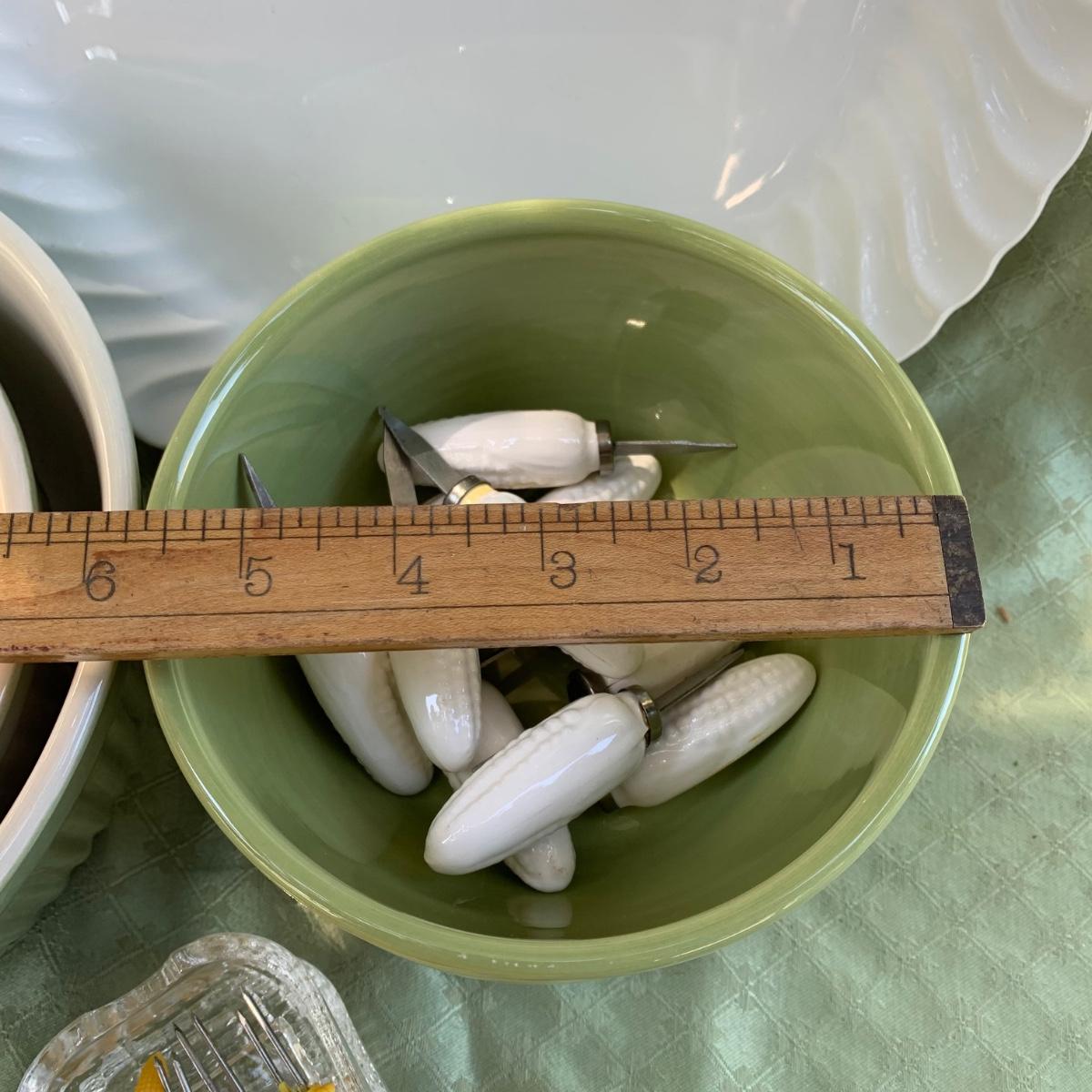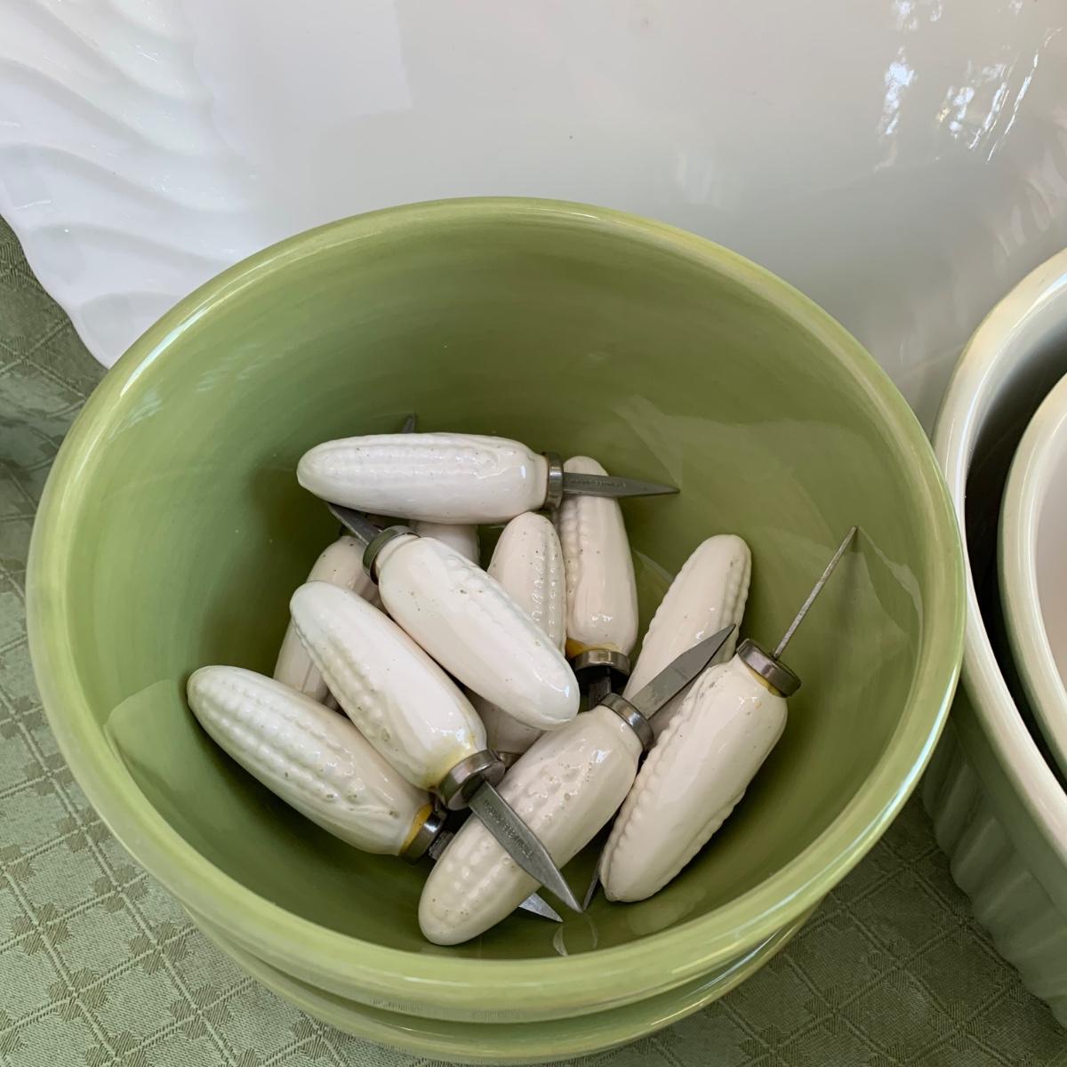 LOT 365R: Serving Collection: White Platters, Espana Green Bowls, Glass Corn Dishes, Corn Holders,