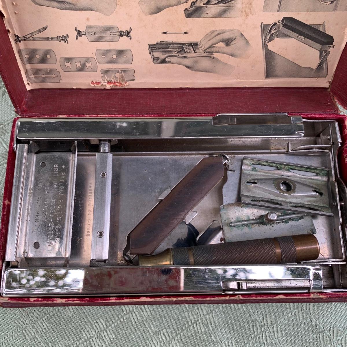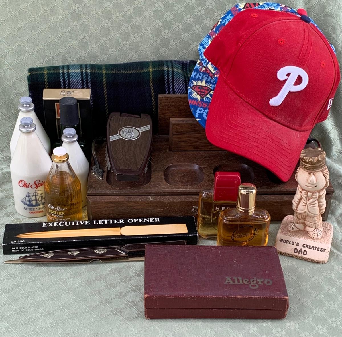 LOT 368R: Men's Collection: Vtg Allegro Razor Blade Sharpener, World's Best Dad Wooden Sculpture, After     /Cologne, Superman & Phillies Hats, Wooden Men's Valet Organizer, Letter Openers & More