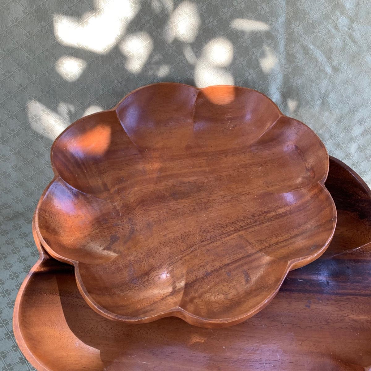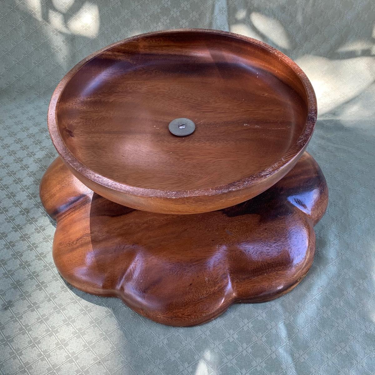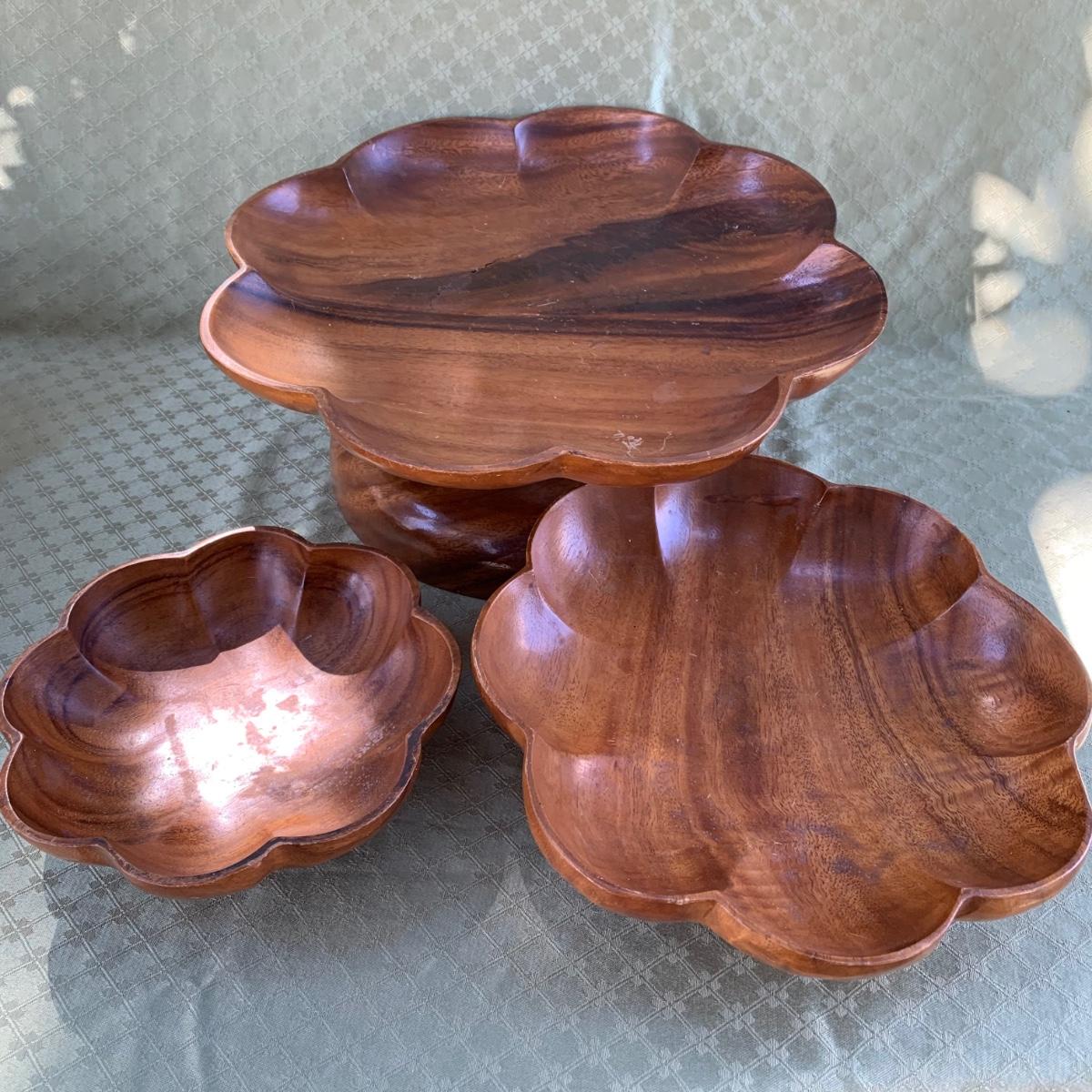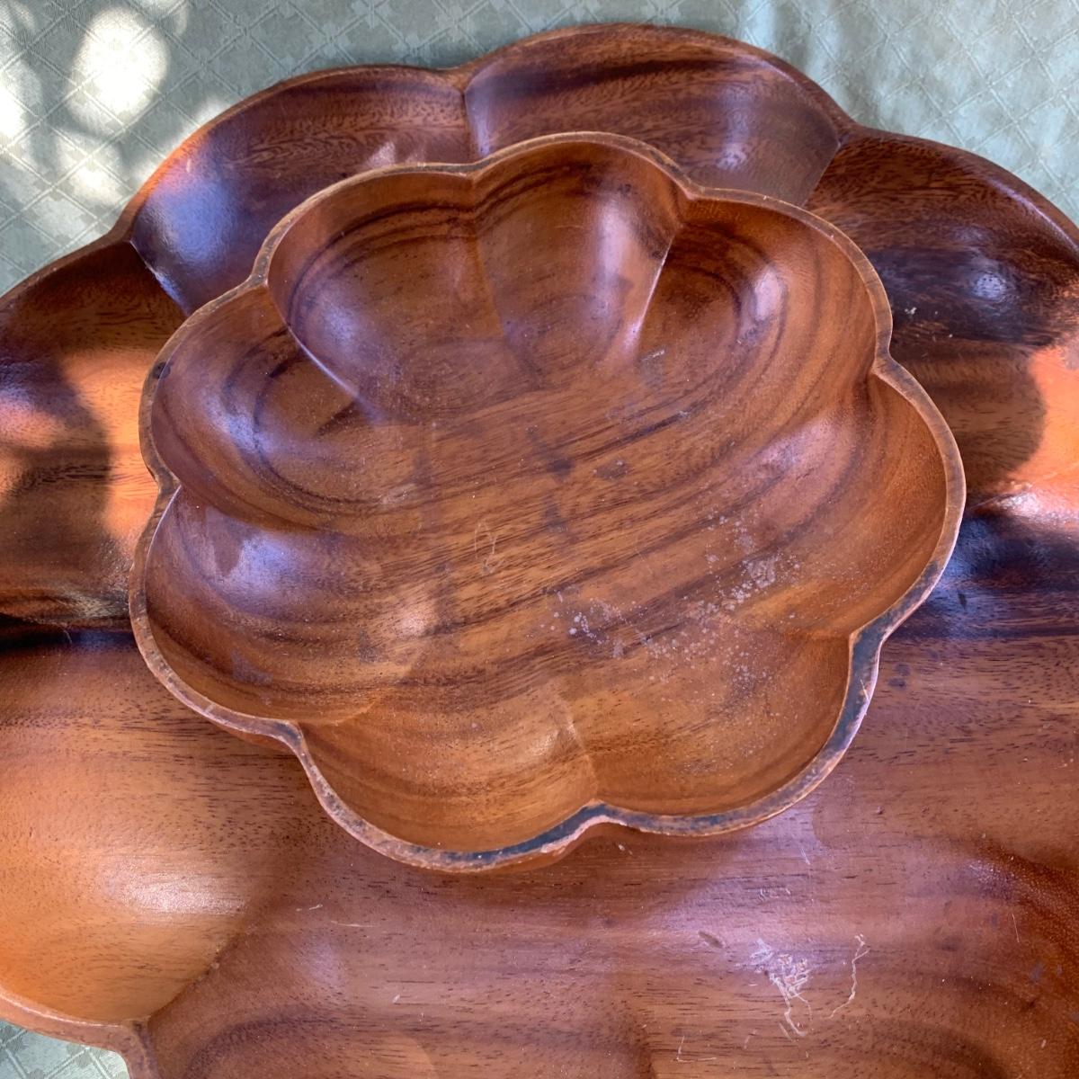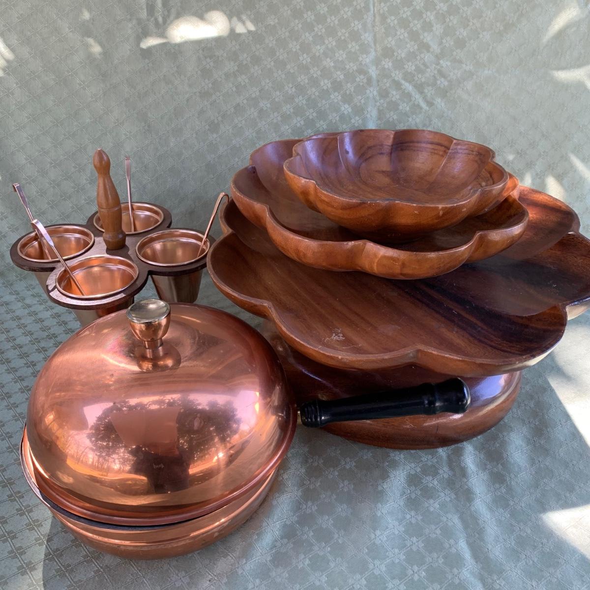 LOT 371R: Floral Shaped "Monkey Pod" Wood Lazy Susan w/Serving Bowls, Art Wood Quadruple Server, & Unmarked Copper Lidded Pot