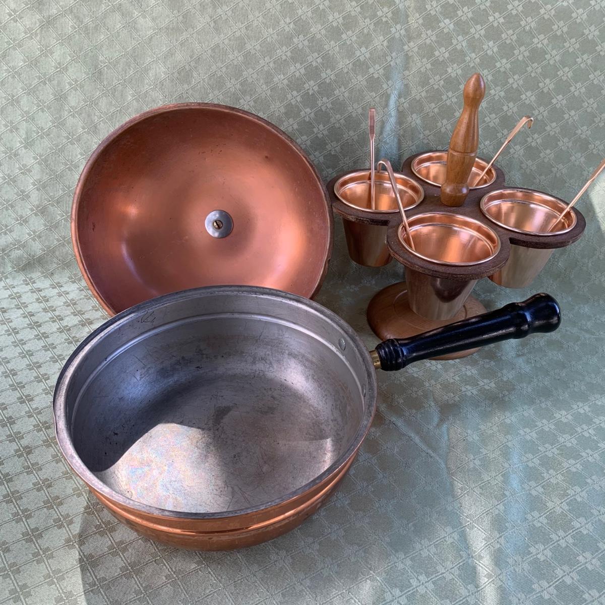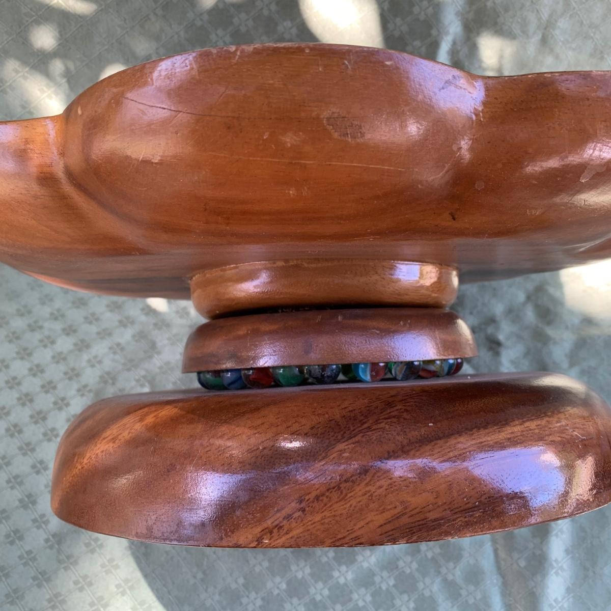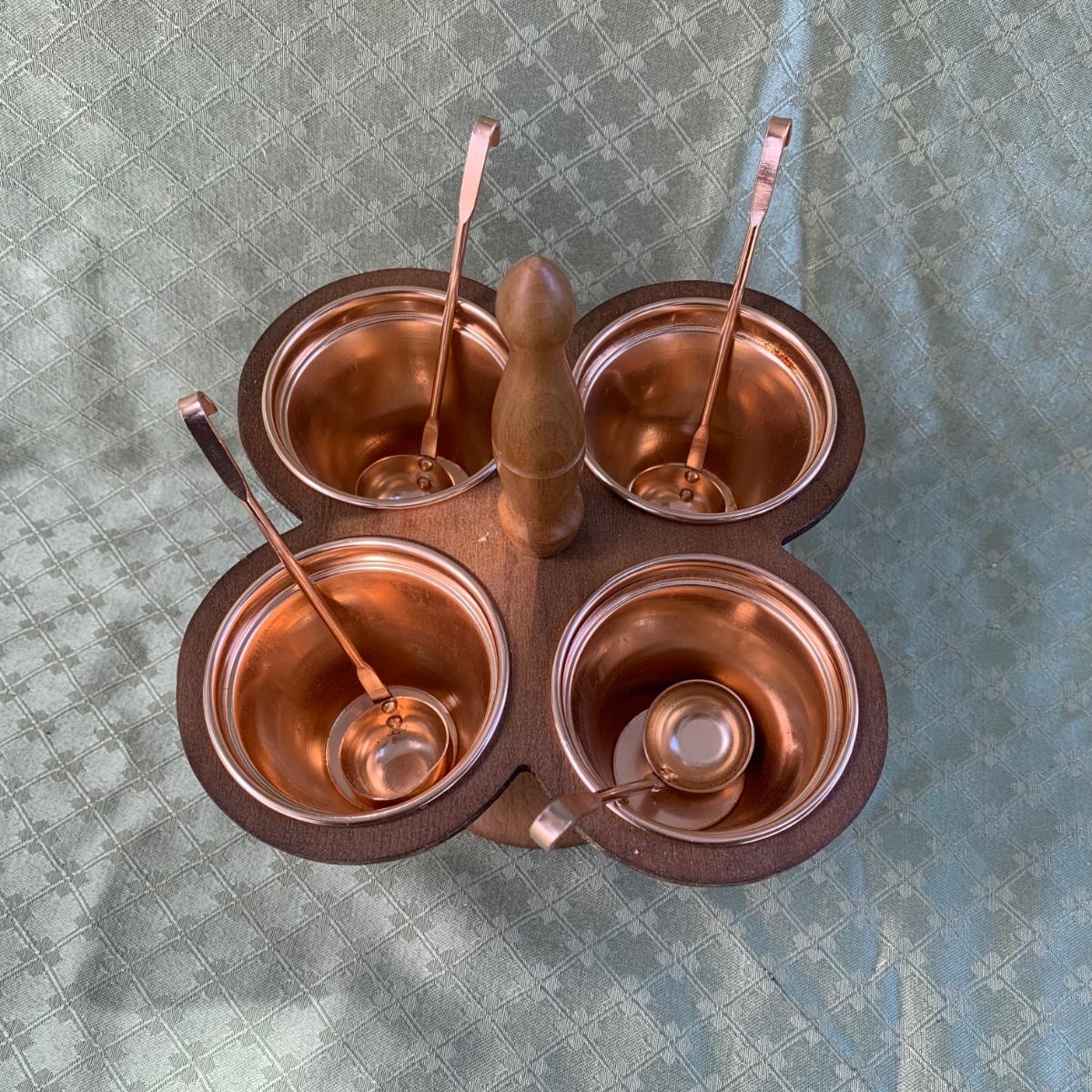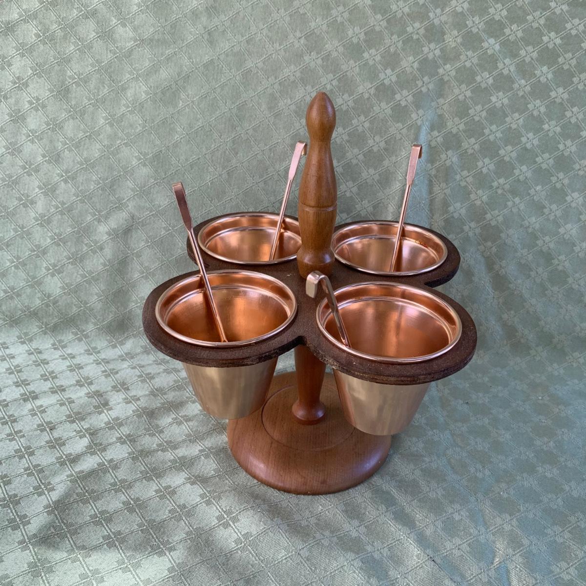 LOT 371R: Floral Shaped "Monkey Pod" Wood Lazy Susan w/Serving Bowls, Art Wood Quadruple Server, & Unmarked Copper Lidded Pot