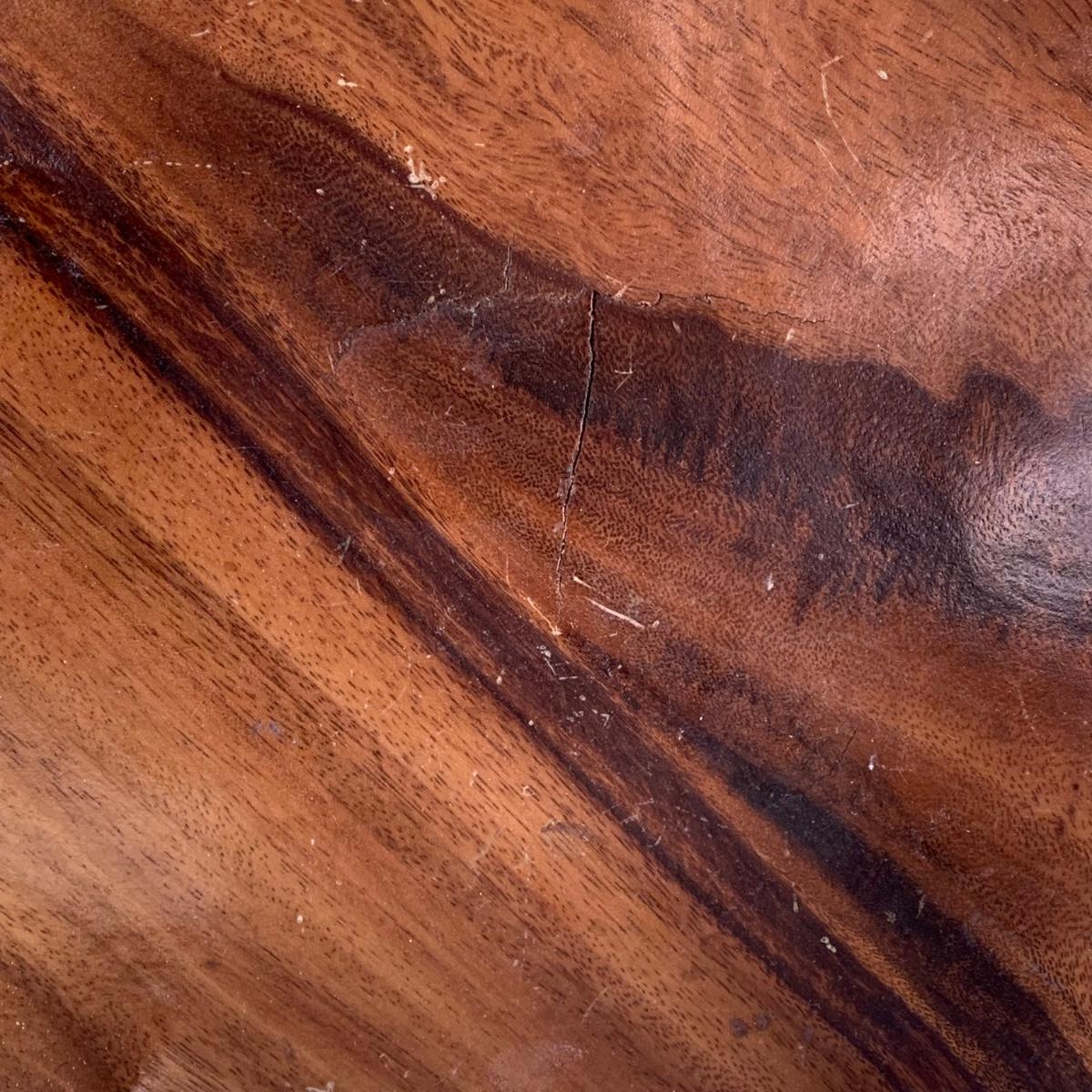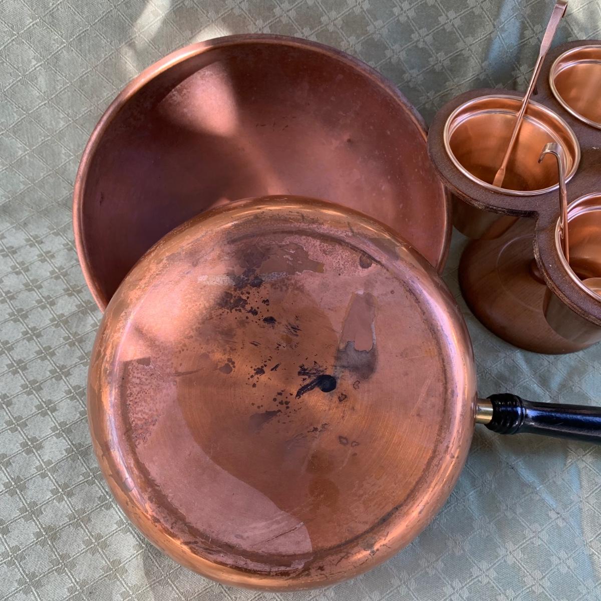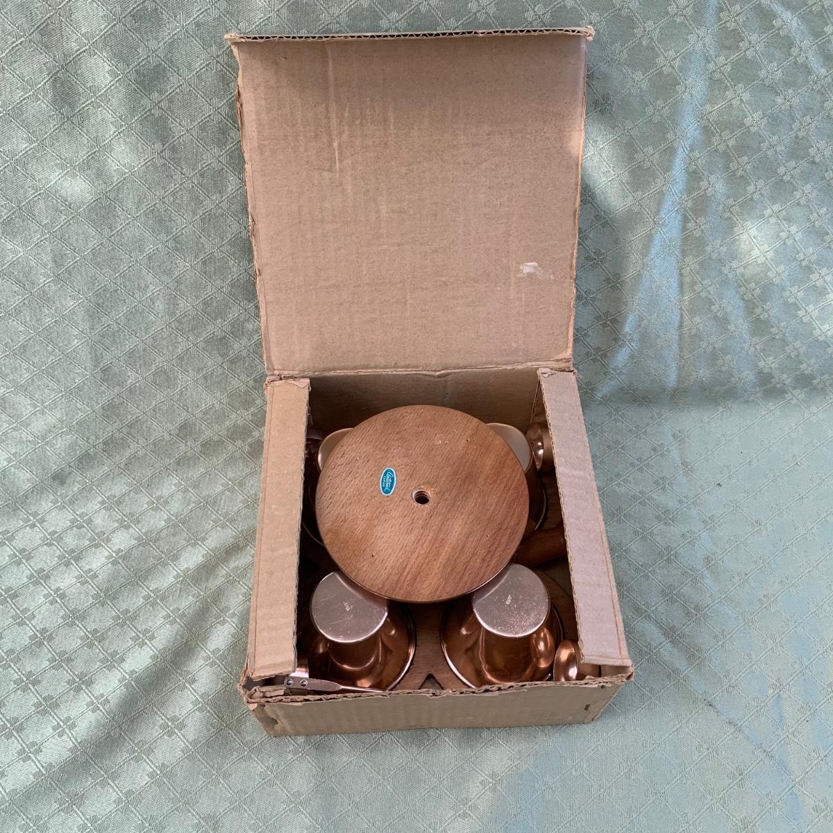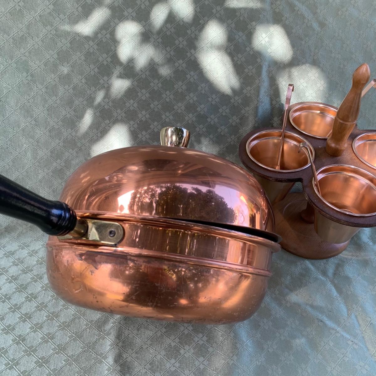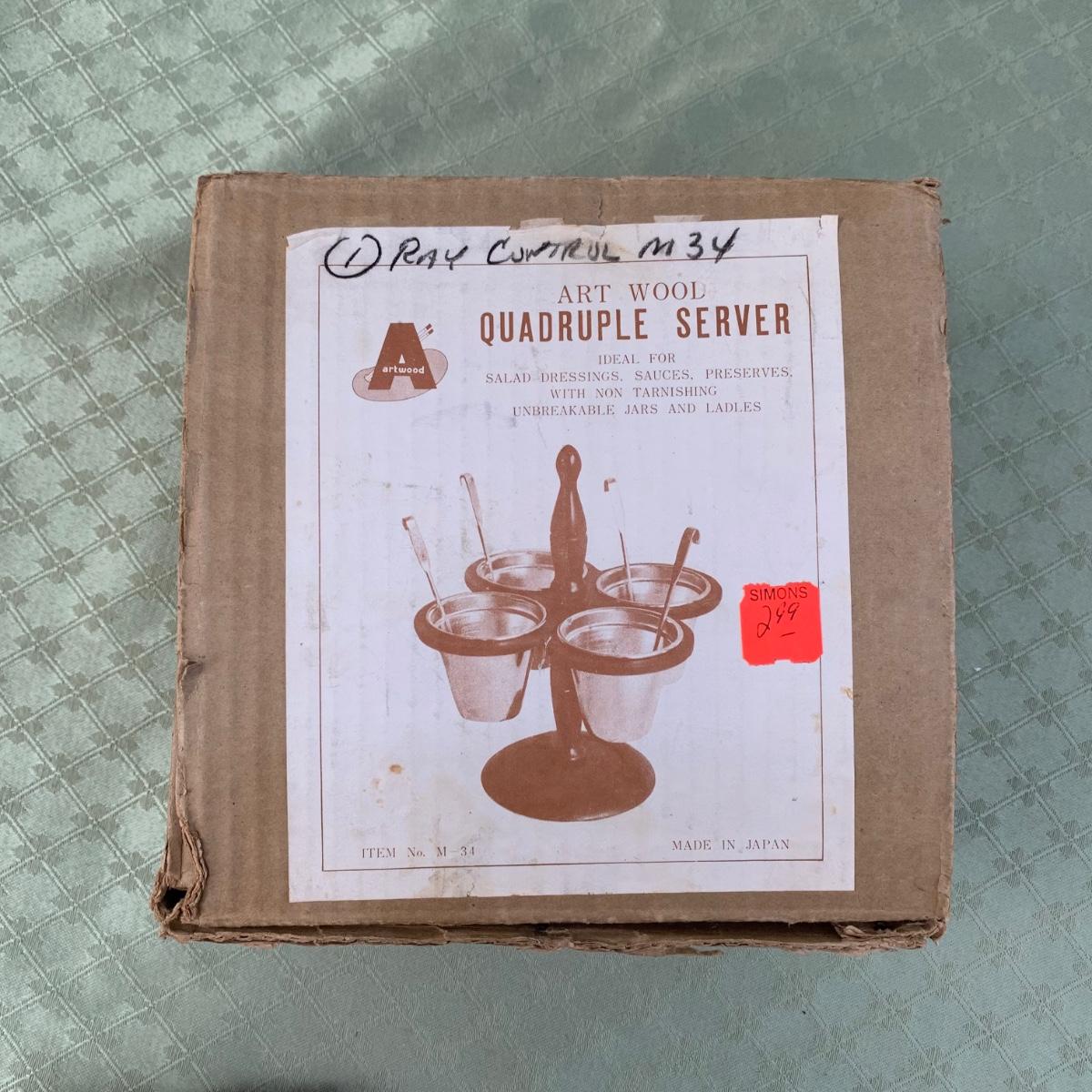 LOT 371R: Floral Shaped "Monkey Pod" Wood Lazy Susan w/Serving Bowls, Art Wood Quadruple Server, & Unmarked Copper Lidded Pot