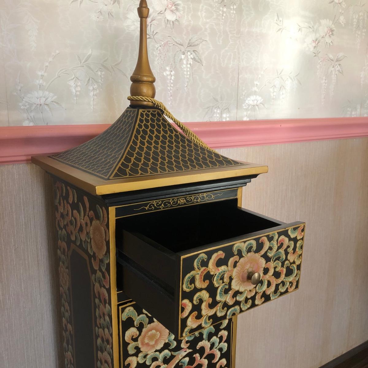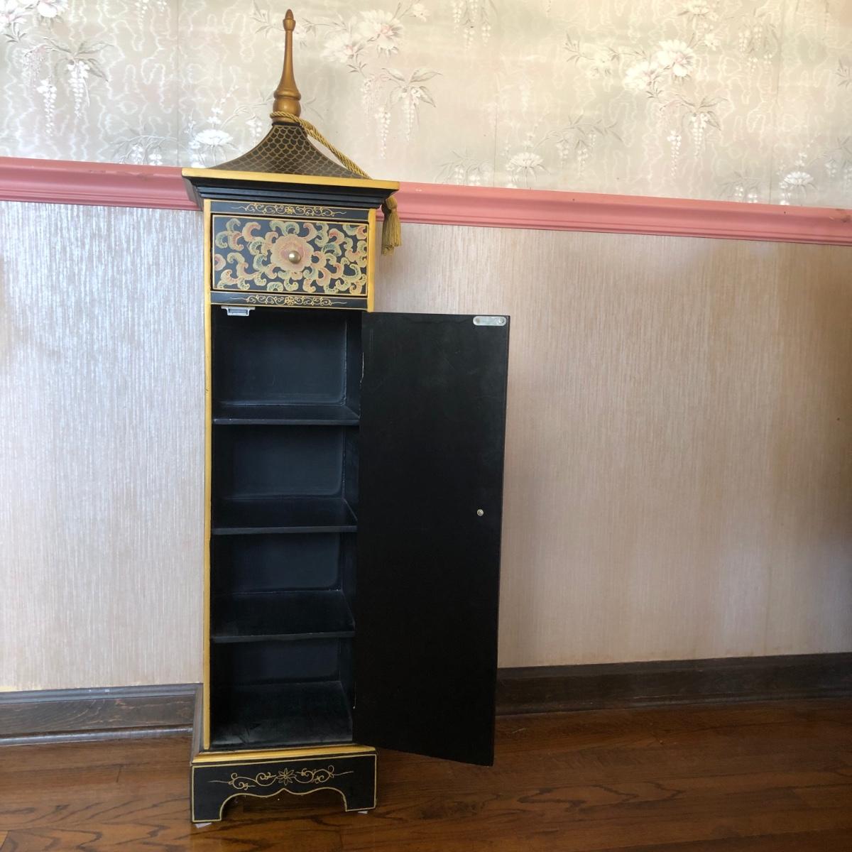 Stand measures 11W x 11D x 48H. Has one drawer and a cabinet with four shelves. Ornate pattern printed on the outside, with a gold colored tassel attached to the peak.