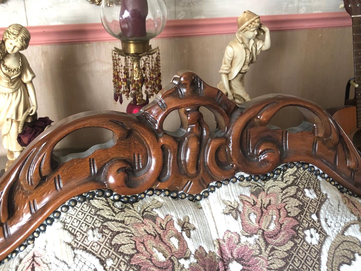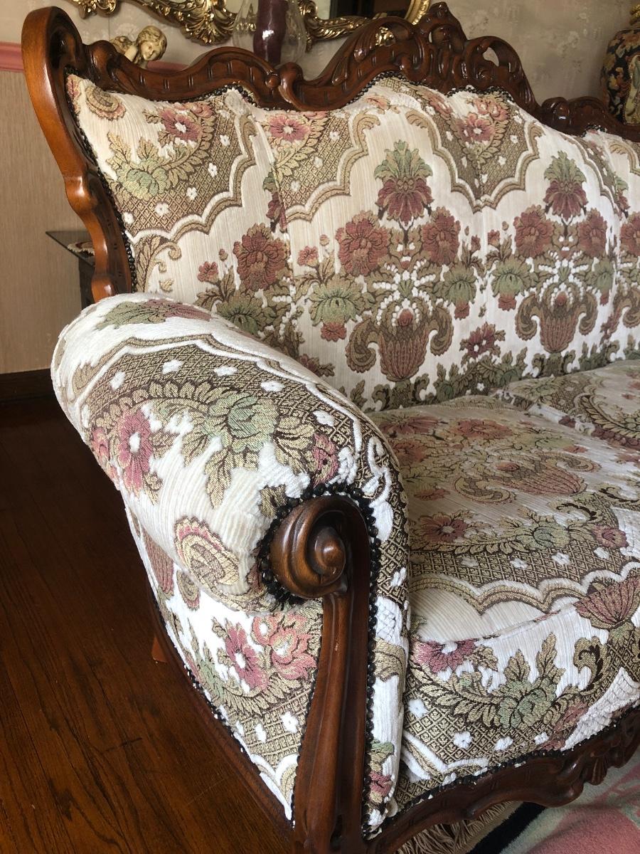 Loveseat has carved details. Measures 60W x 28D x 41H.