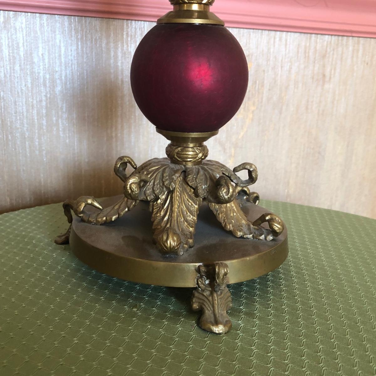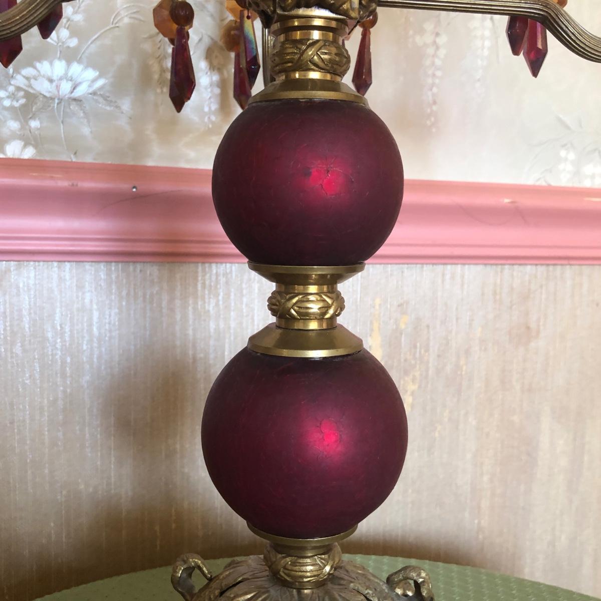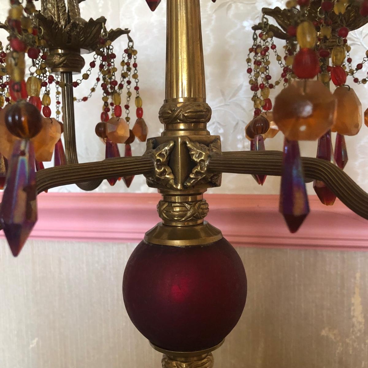 Candelabra has red and amber colored accents with a brass base. Measures 24 inches tall.