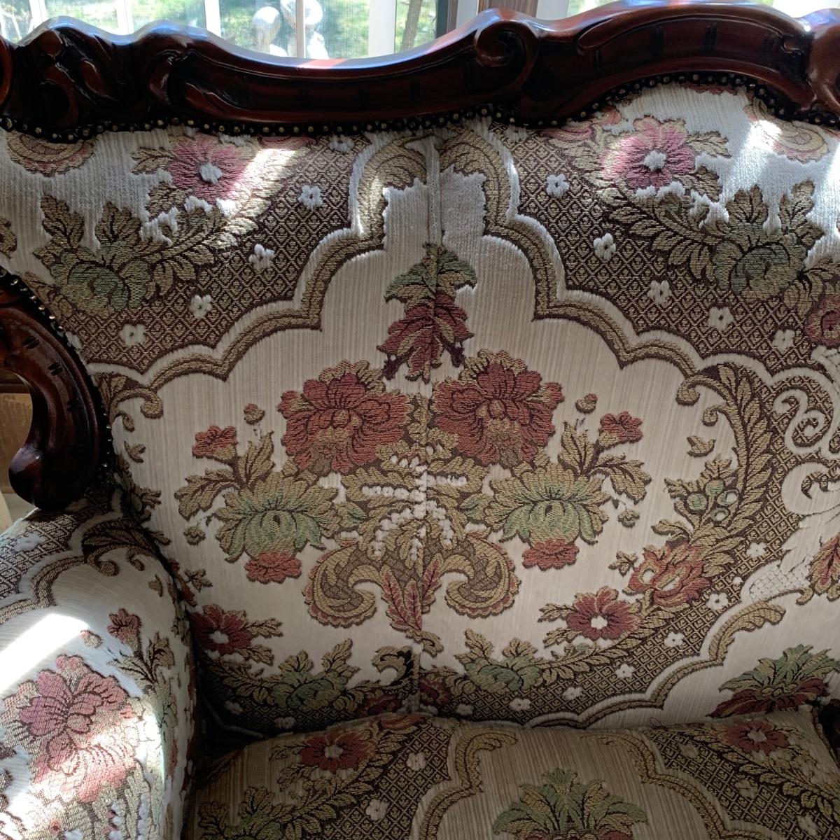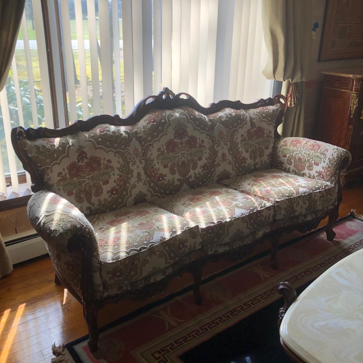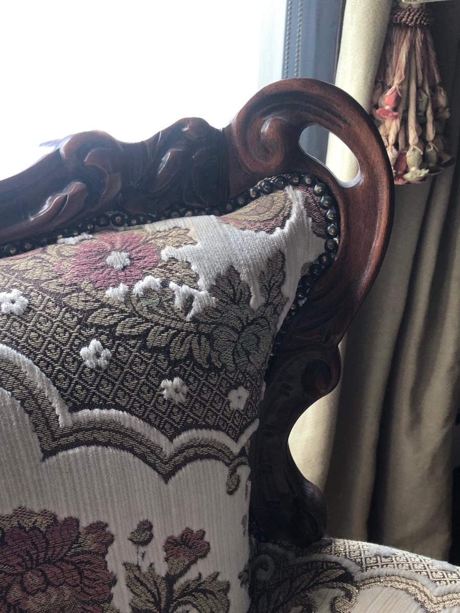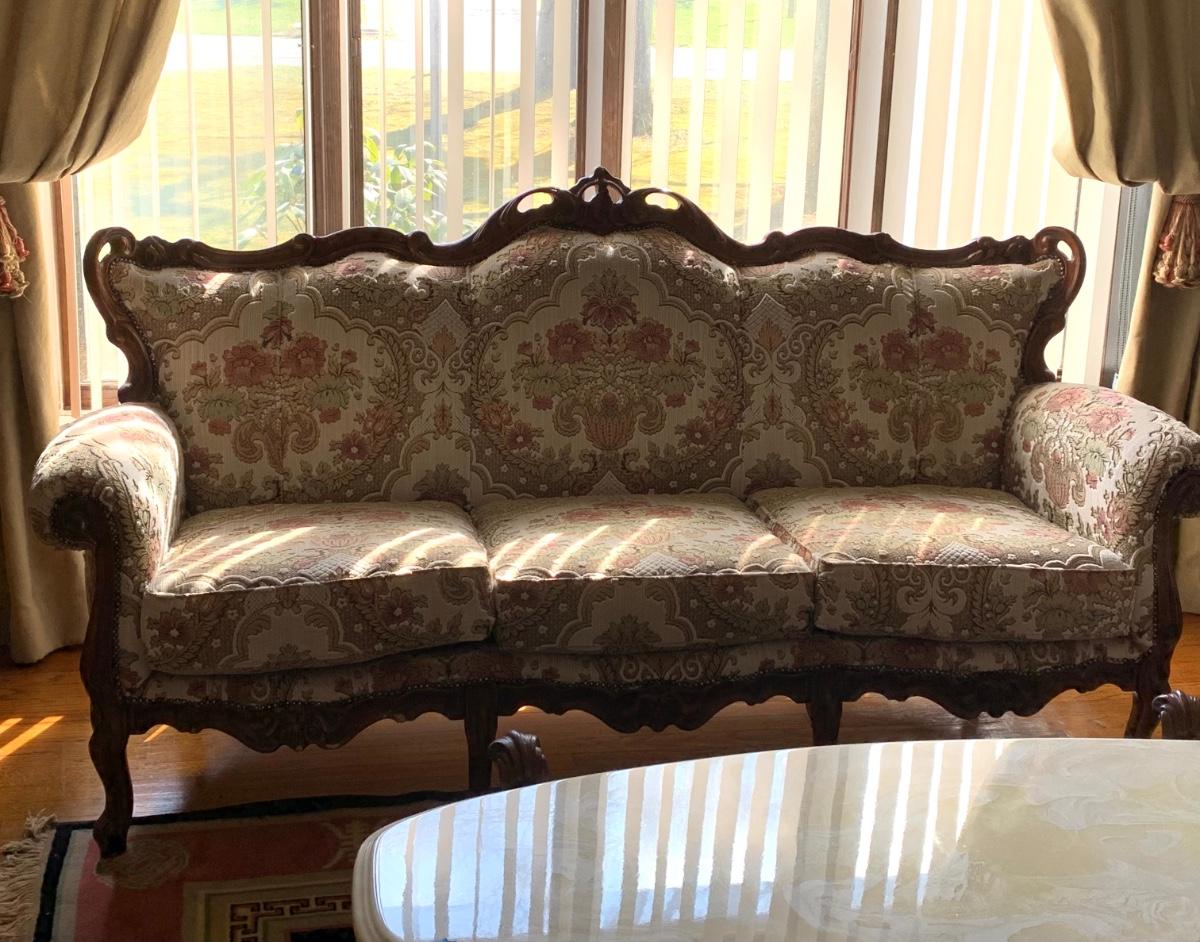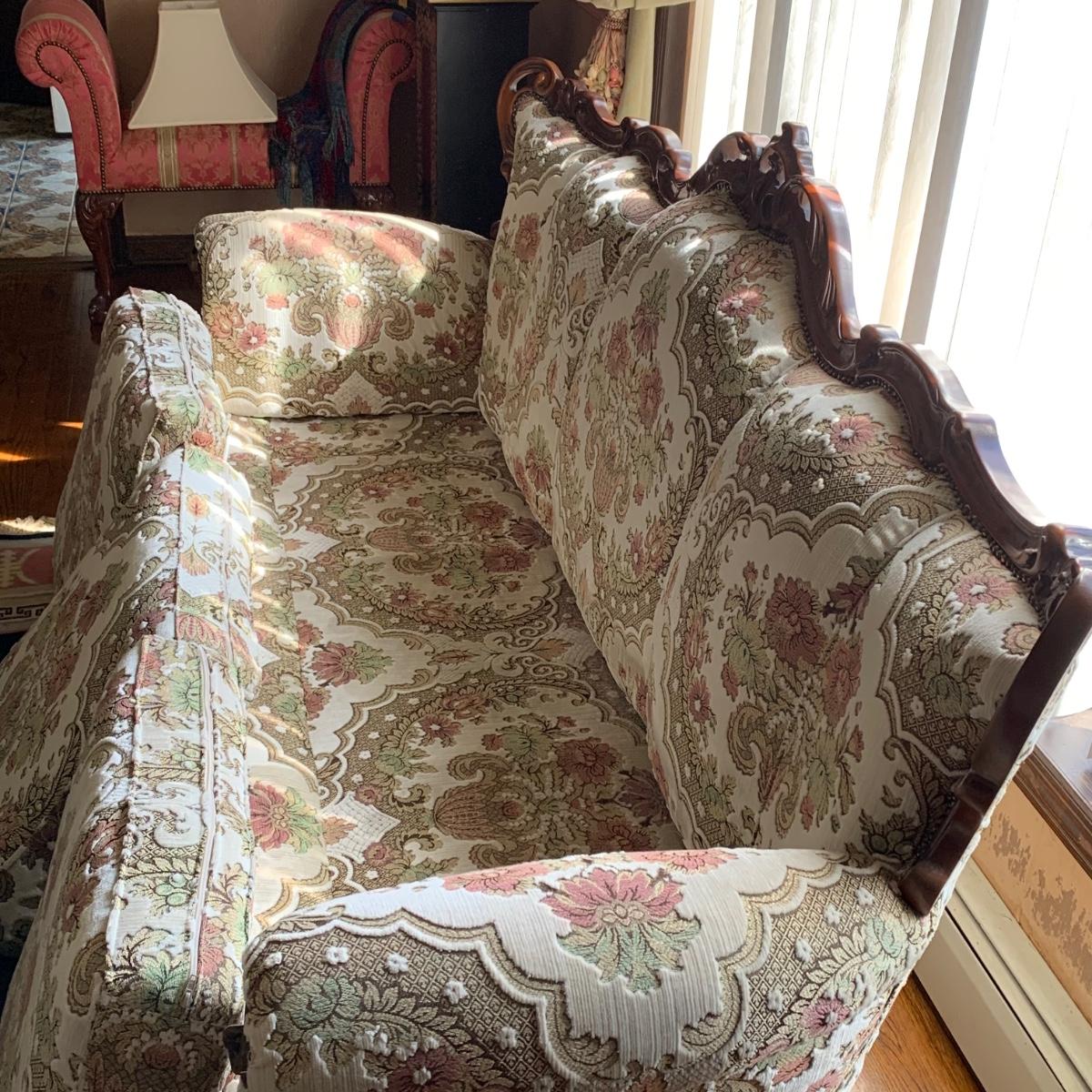Couch has an ornate fabric design with a carved wooden frame. Measures 79W x 28D x 41H.