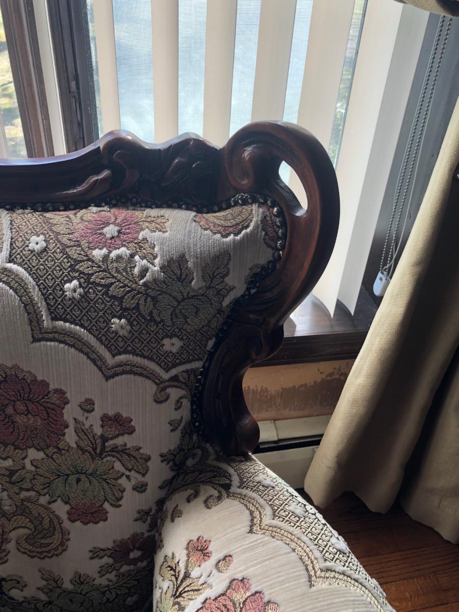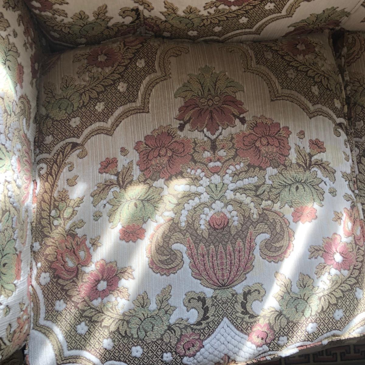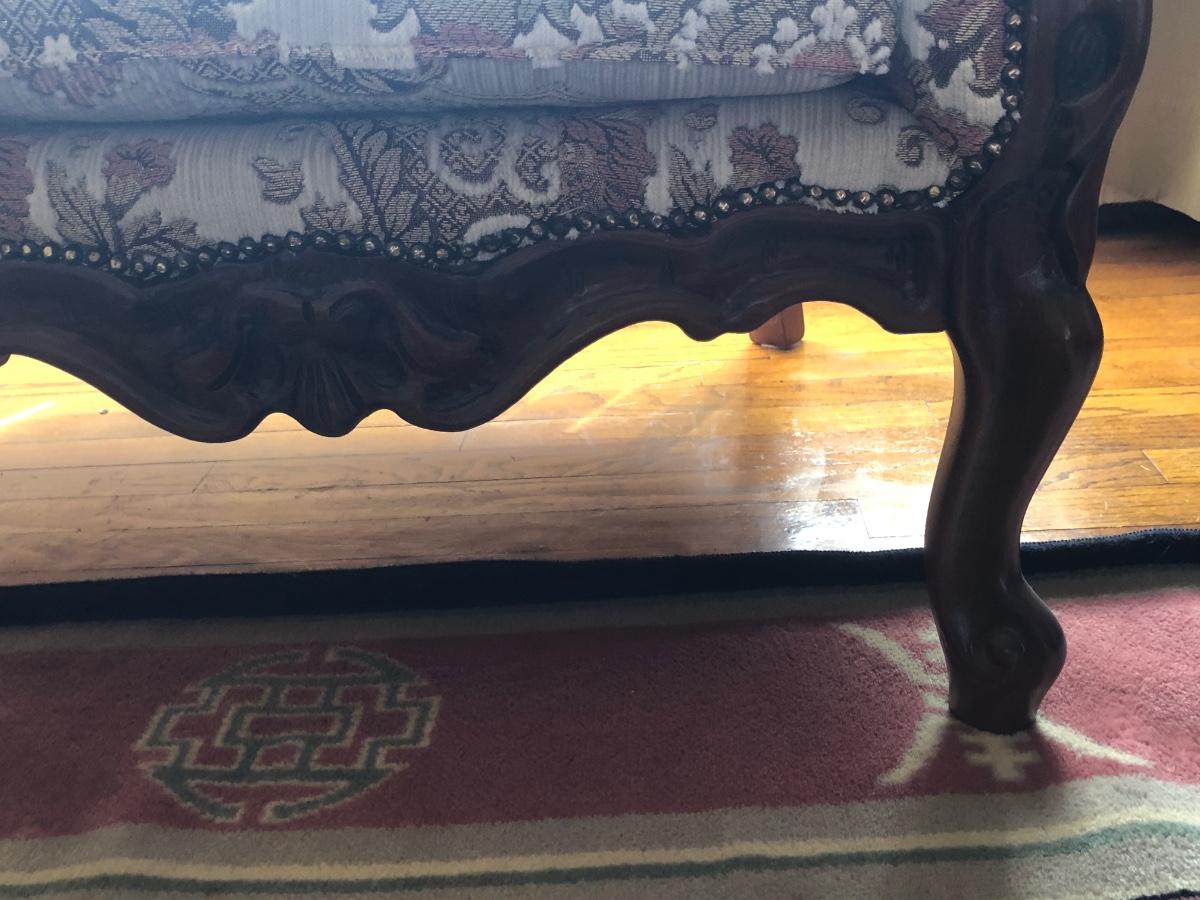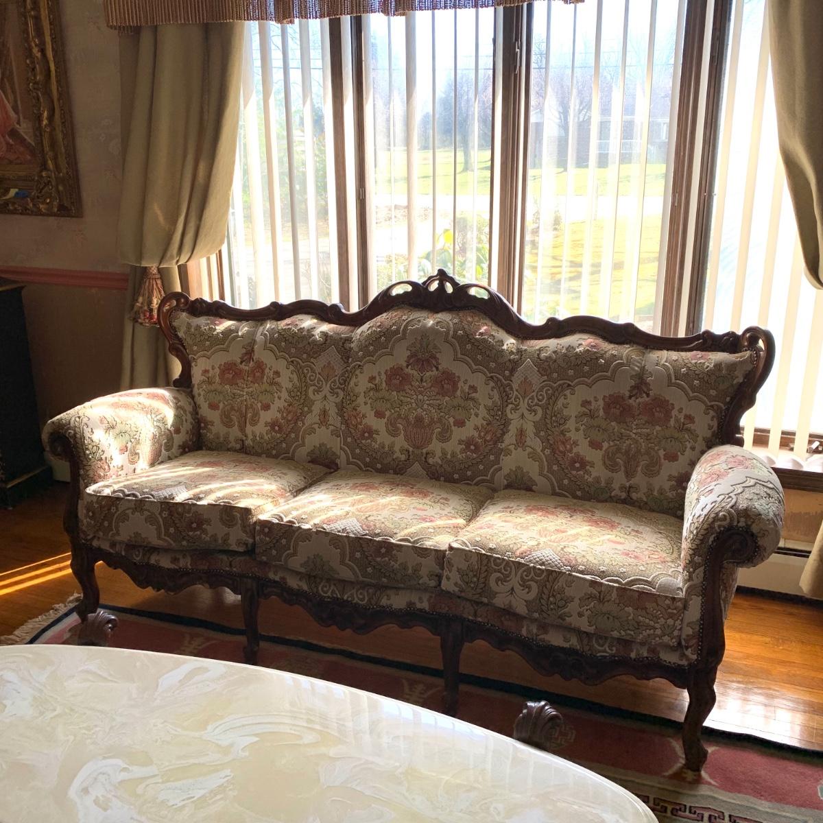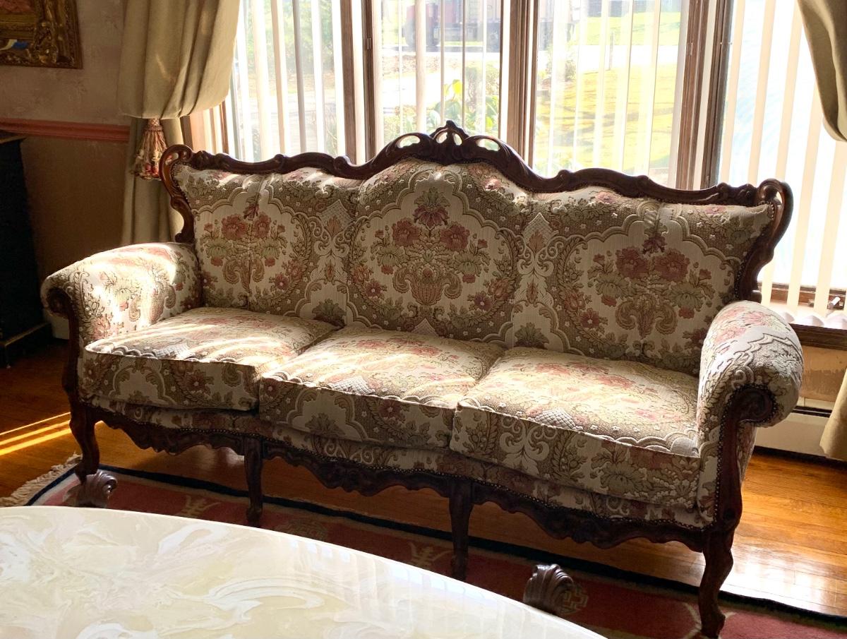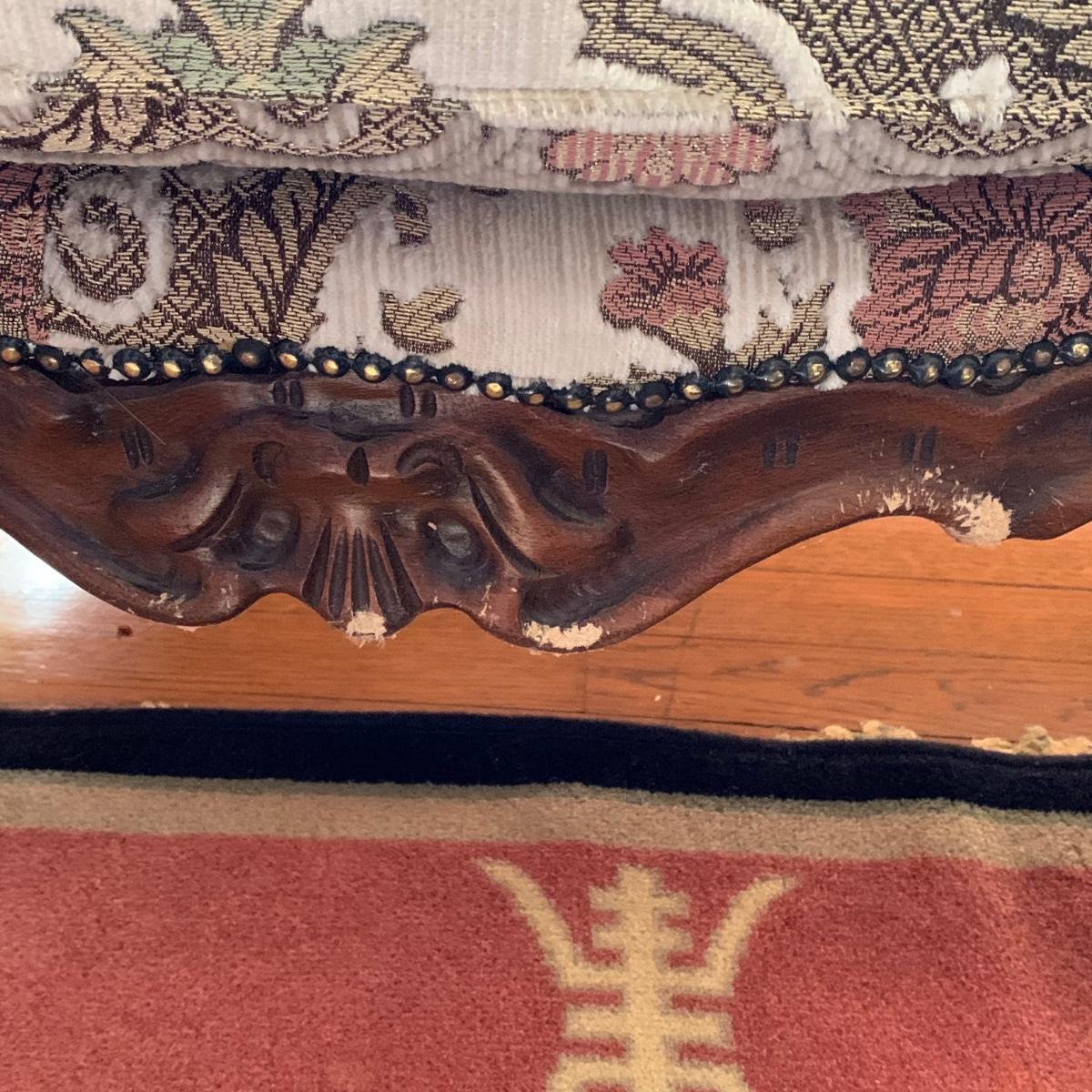 Couch has an ornate fabric design with a carved wooden frame. Measures 79W x 28D x 41H.