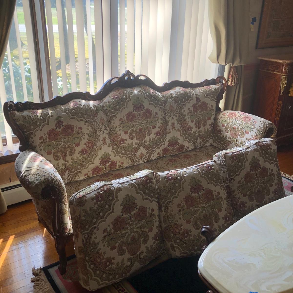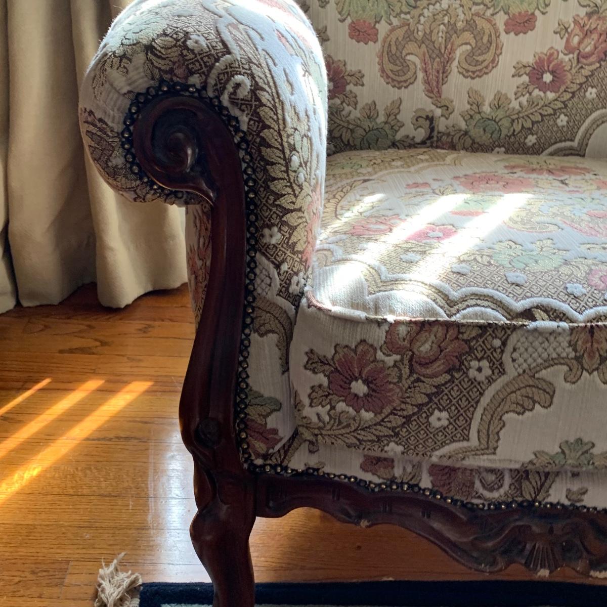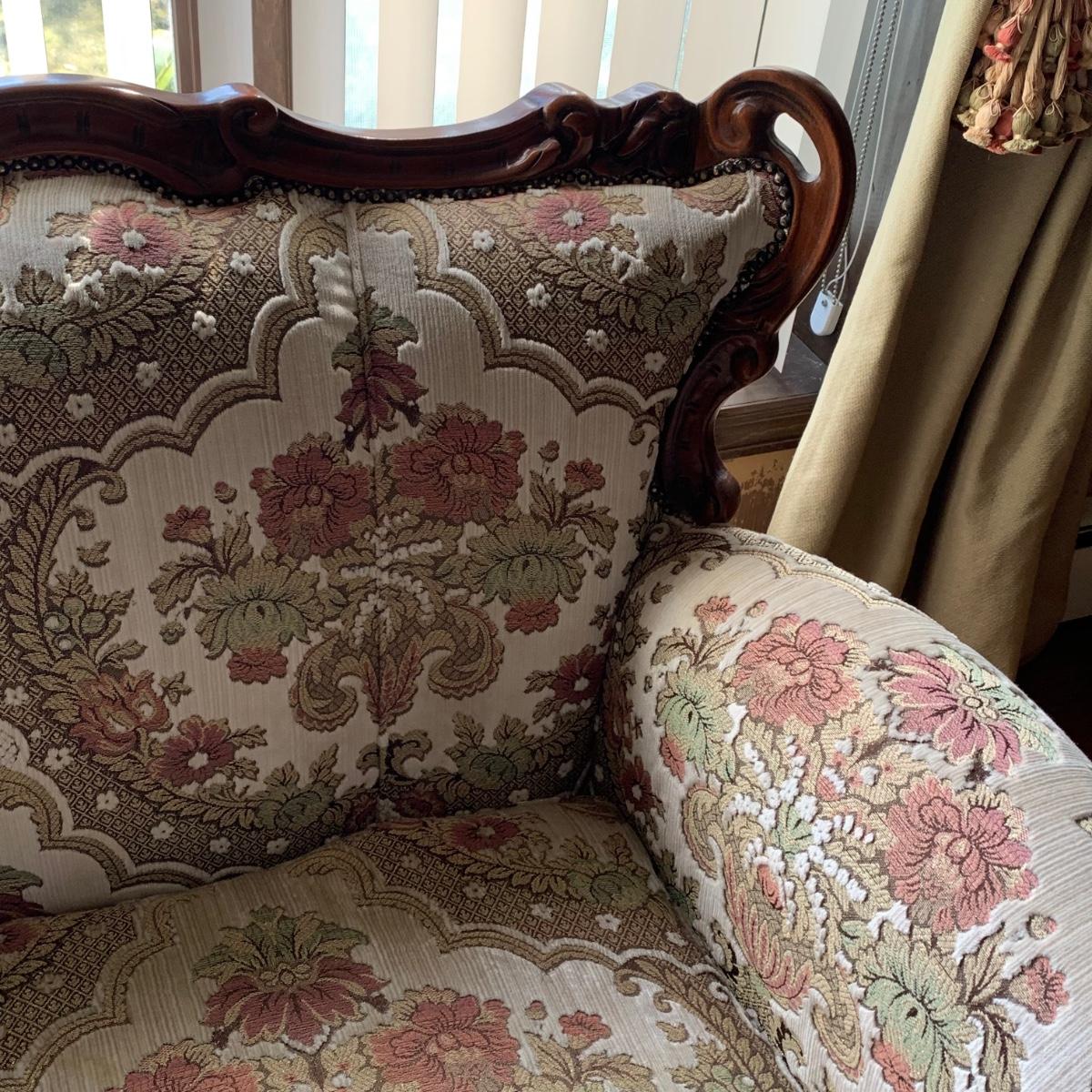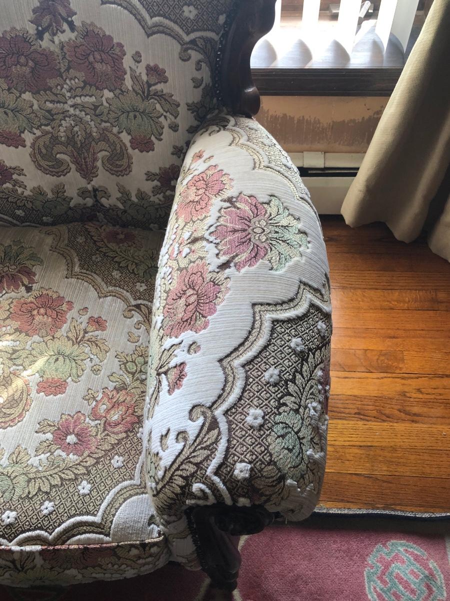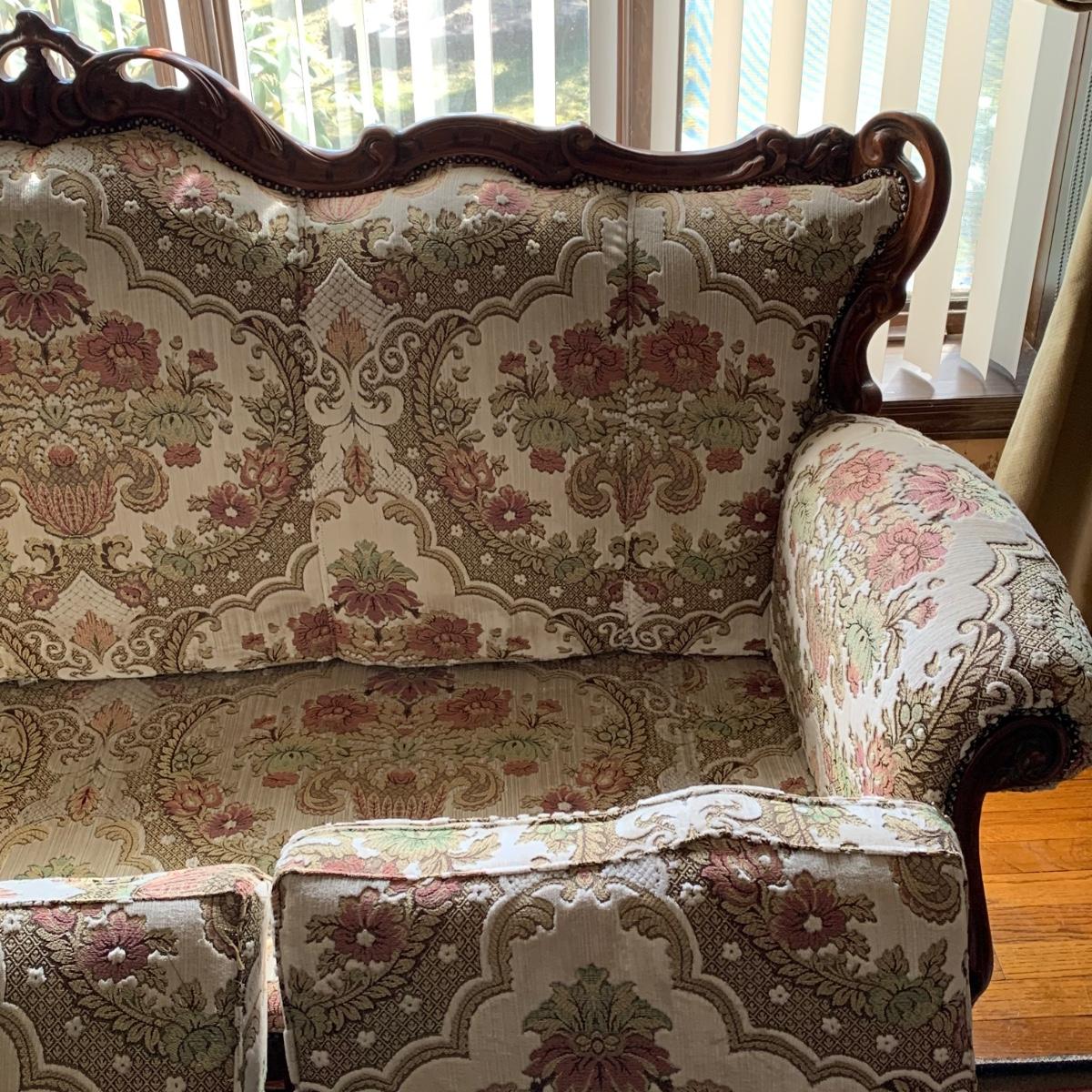 Couch has an ornate fabric design with a carved wooden frame. Measures 79W x 28D x 41H.