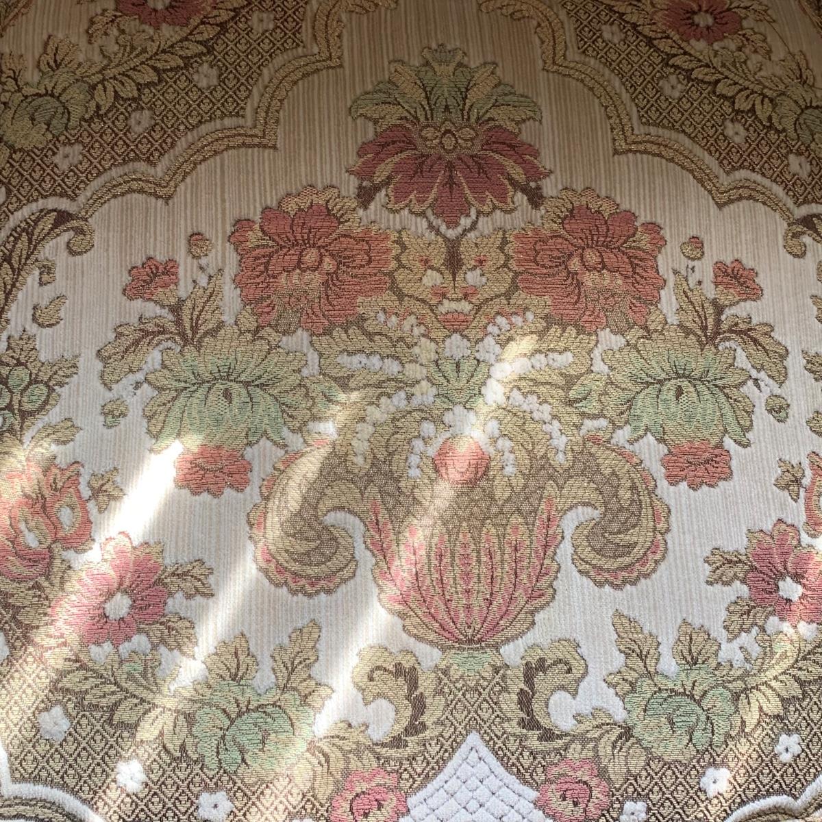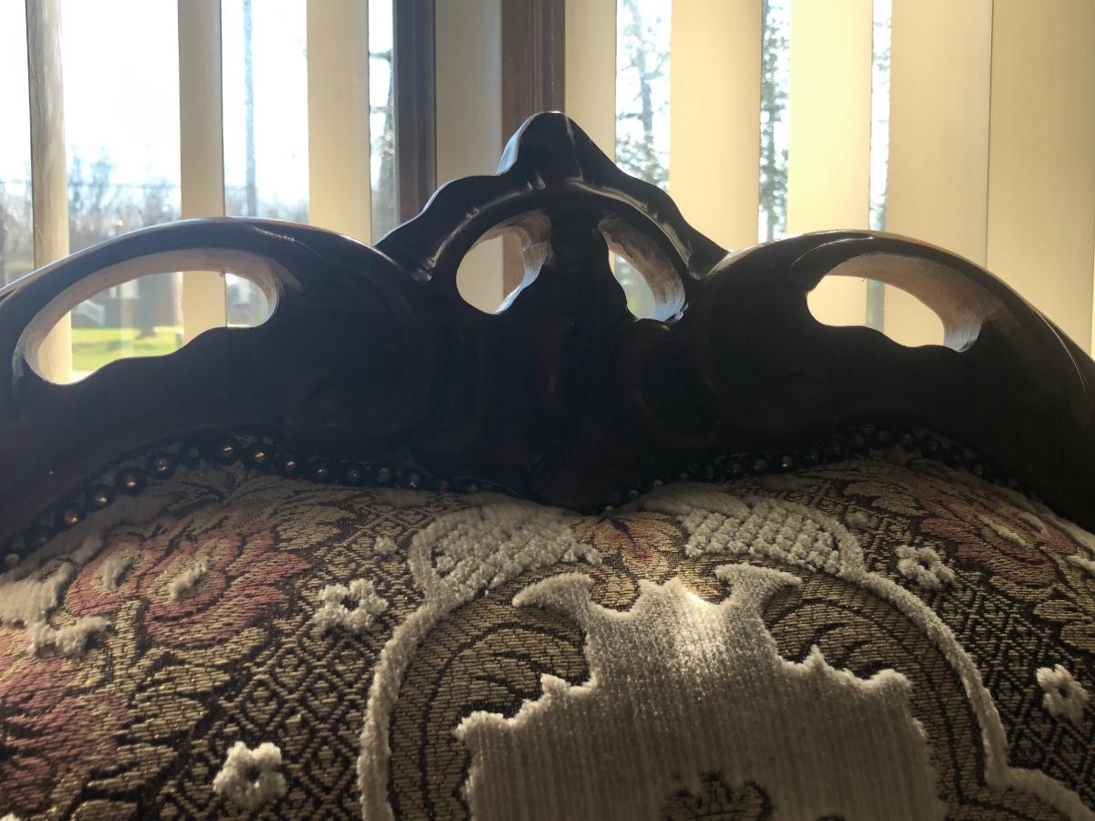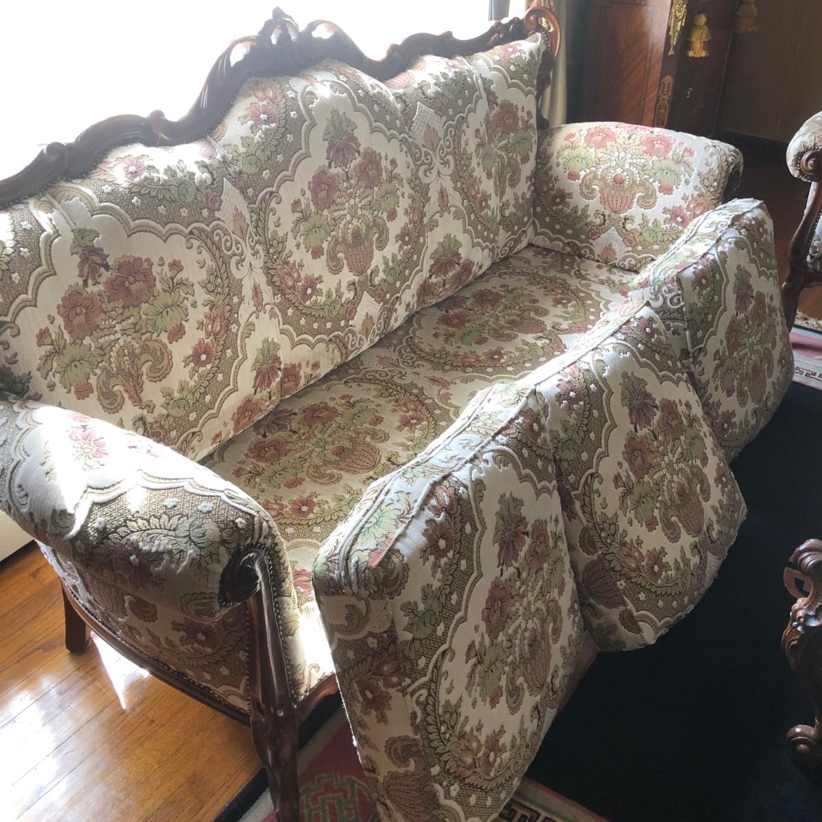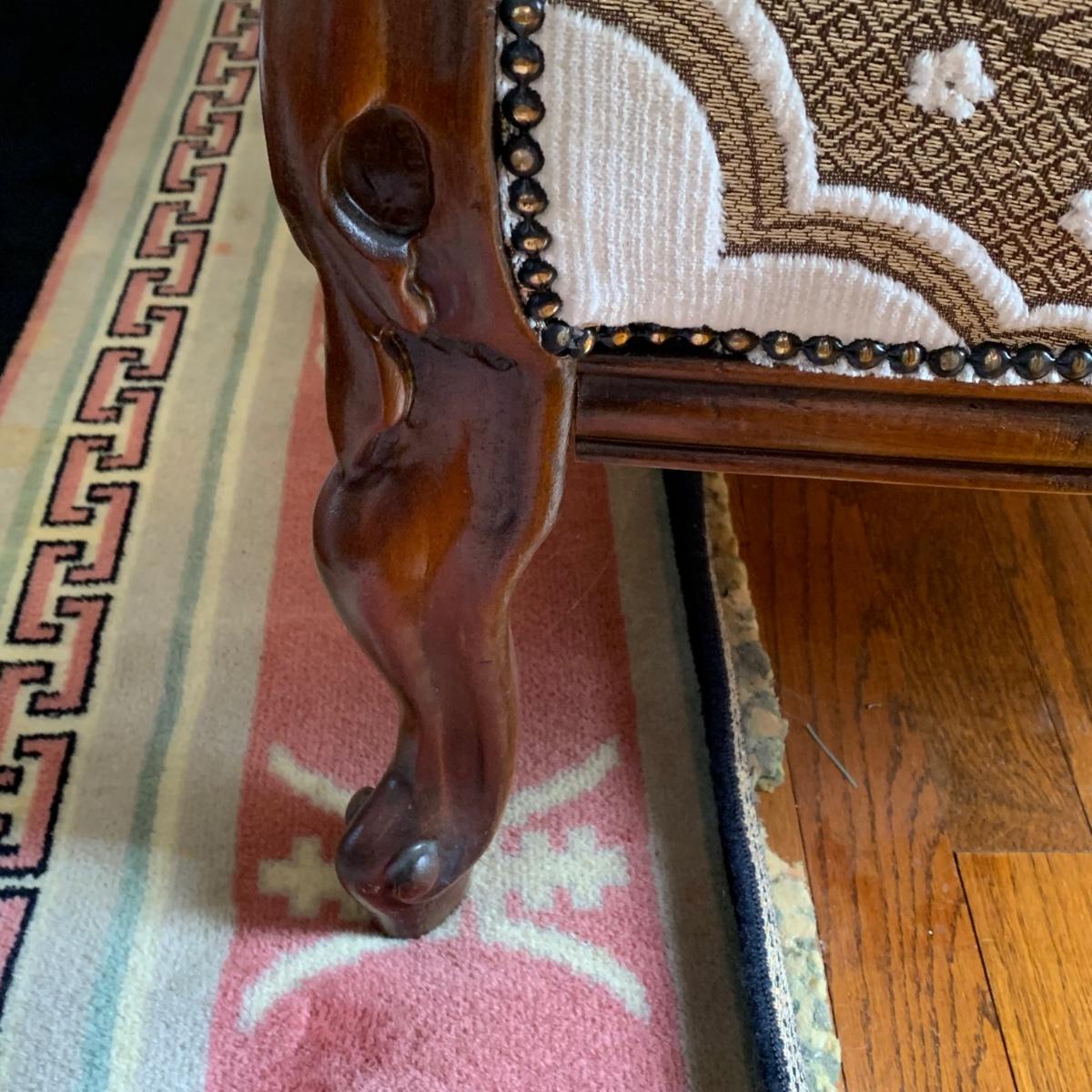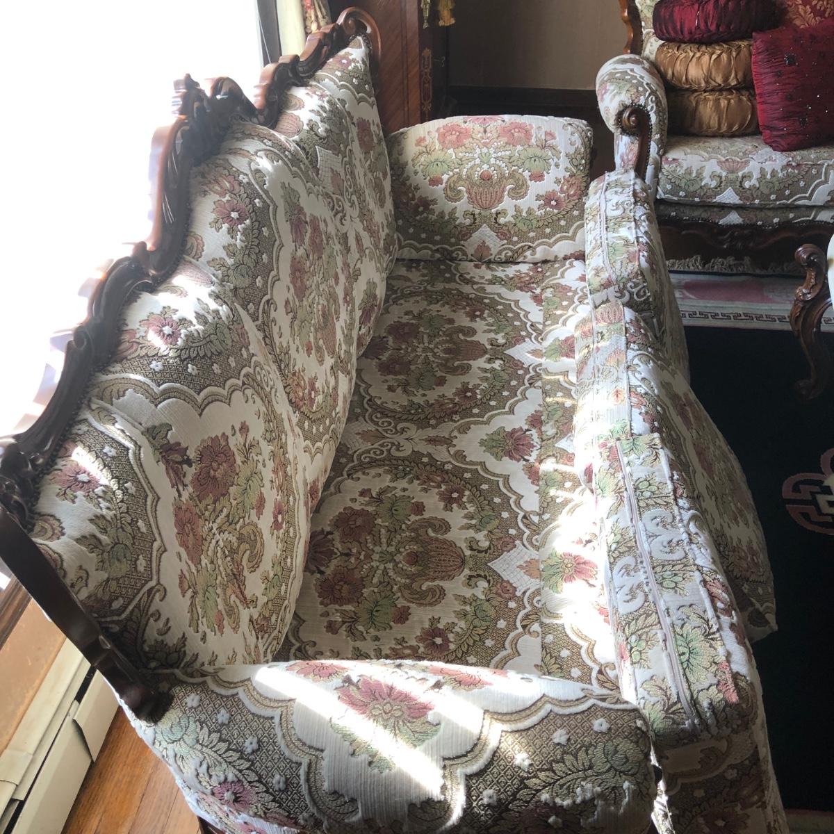 Couch has an ornate fabric design with a carved wooden frame. Measures 79W x 28D x 41H.
