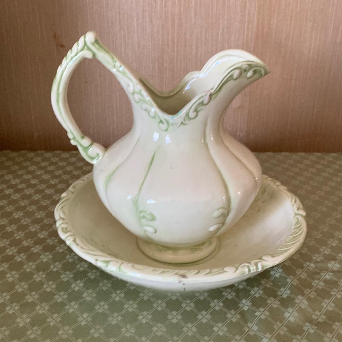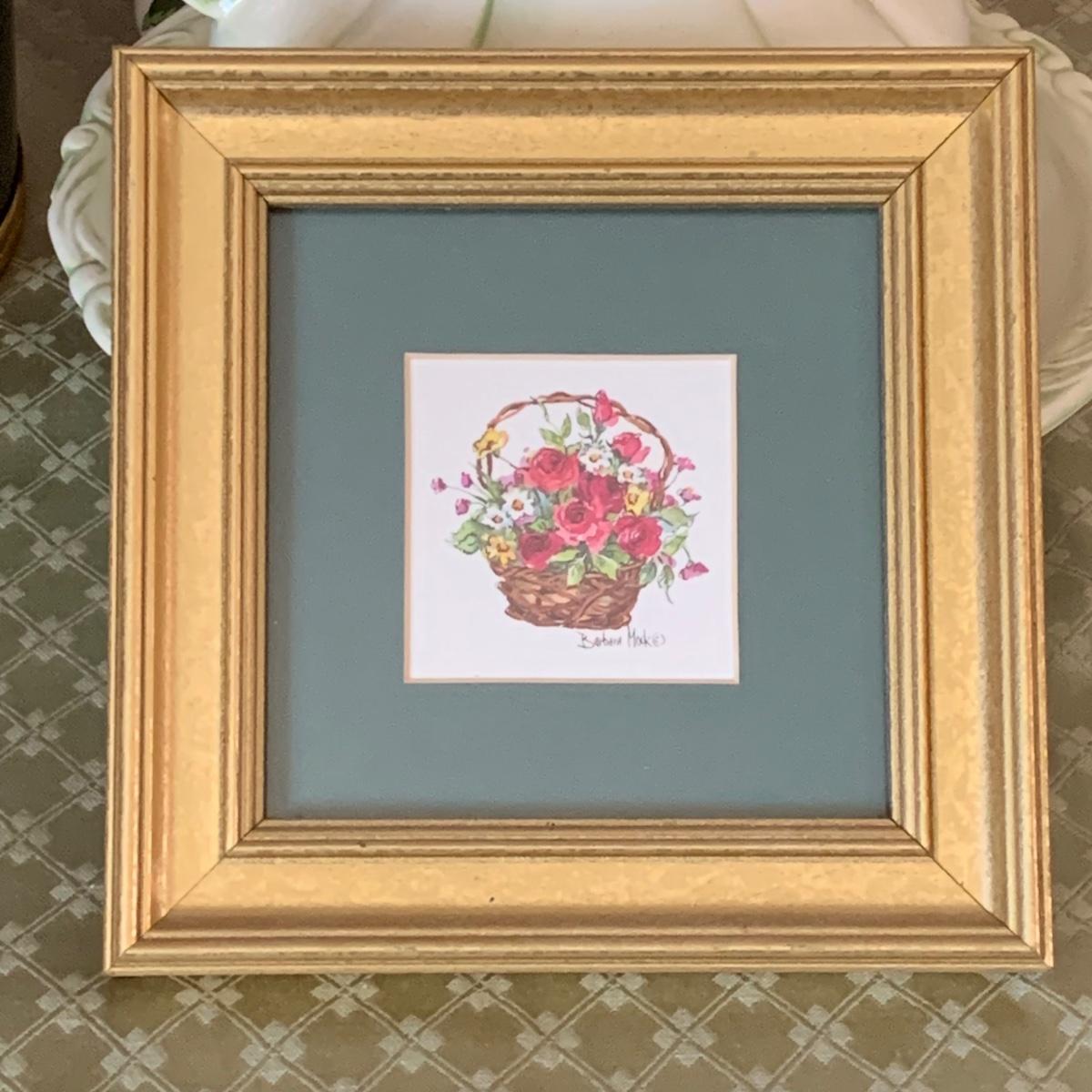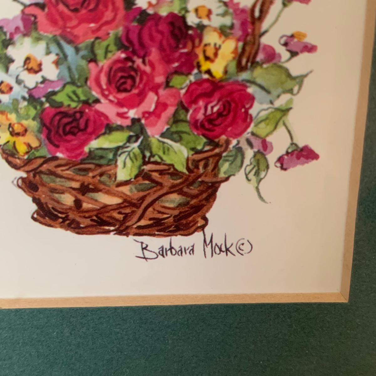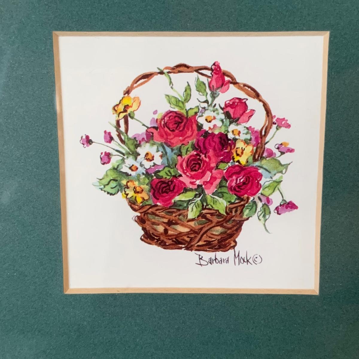 LOT 33R: Signed Barbara Mock "Mini Baskets" Print, Mint Green Pitcher & Bowl, Porcelain Rose Photo Frame & More