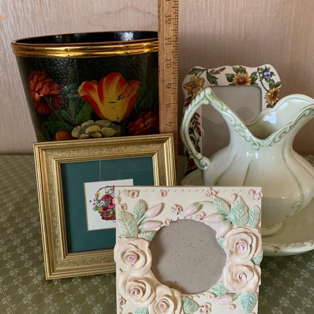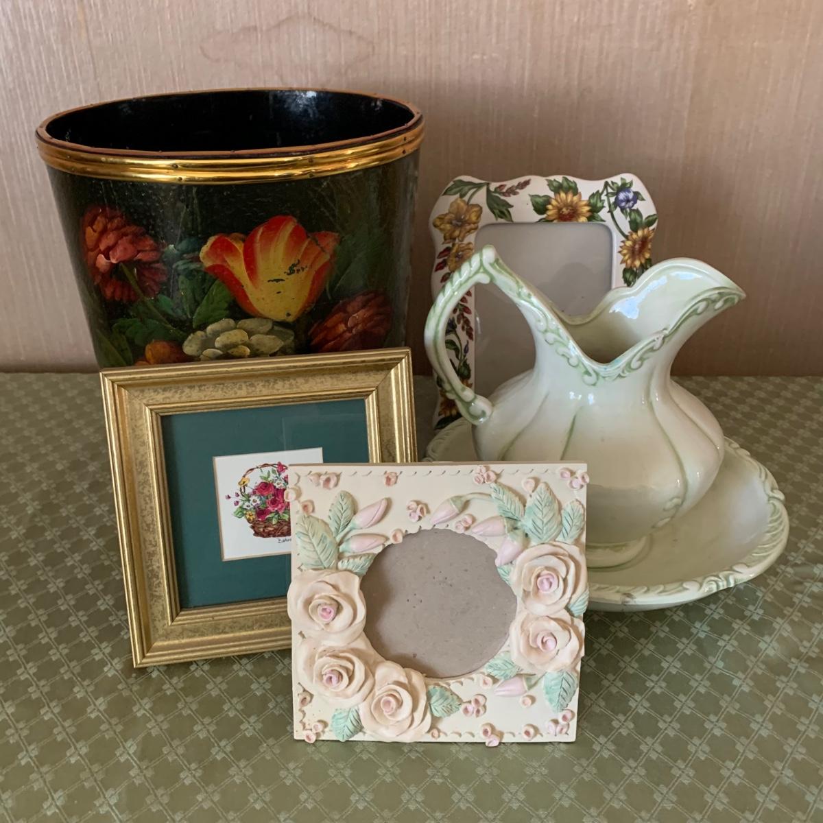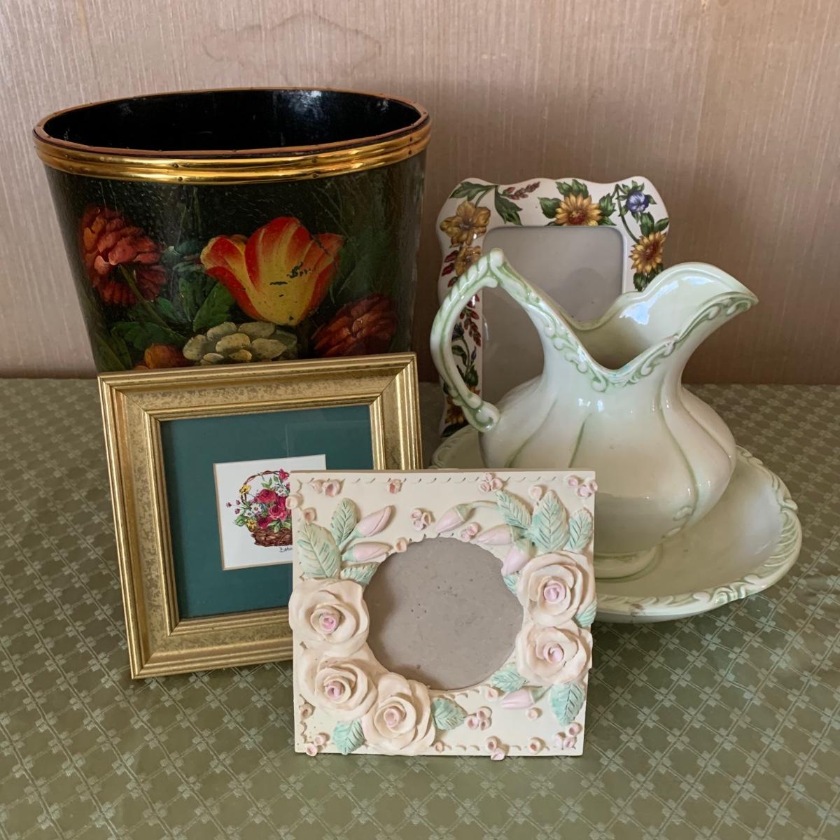 Also includes decorative floral waste basket, and another ceramic floral photo frame. Waste basket is worn.