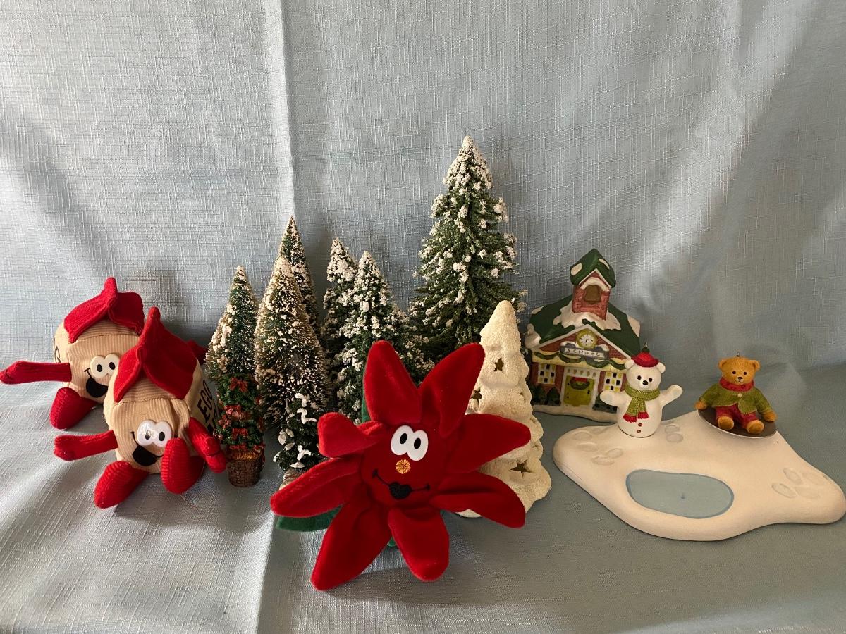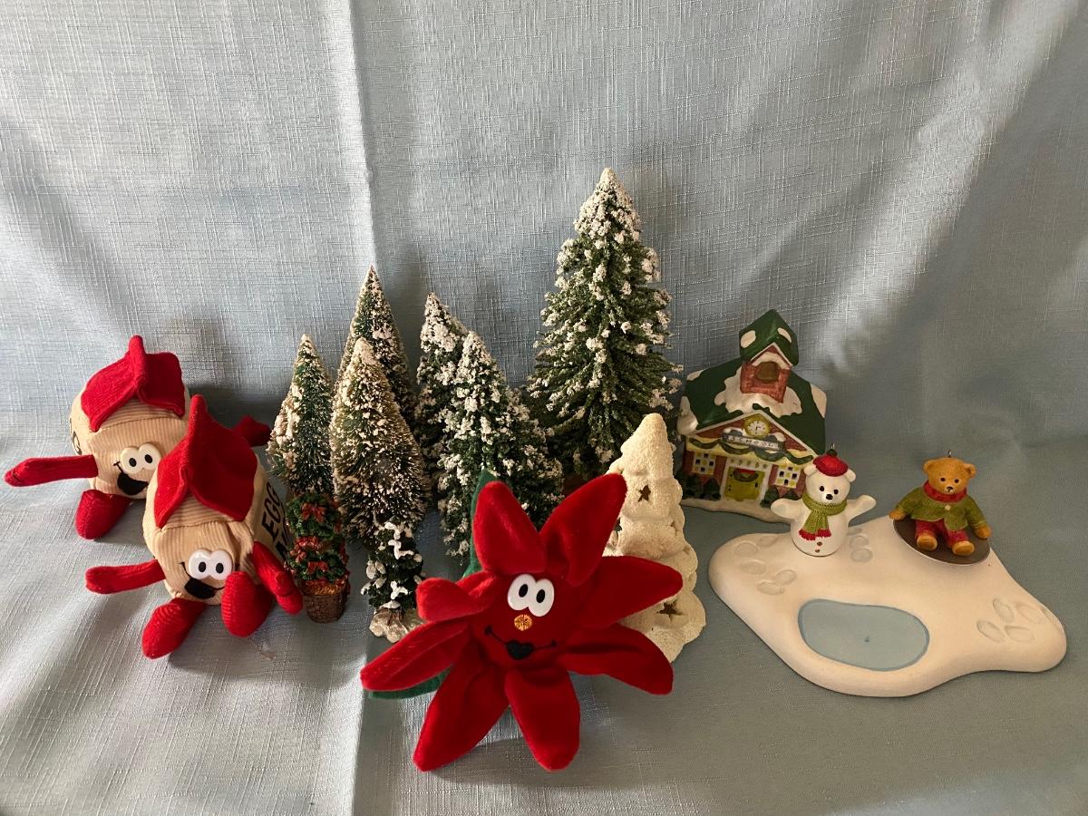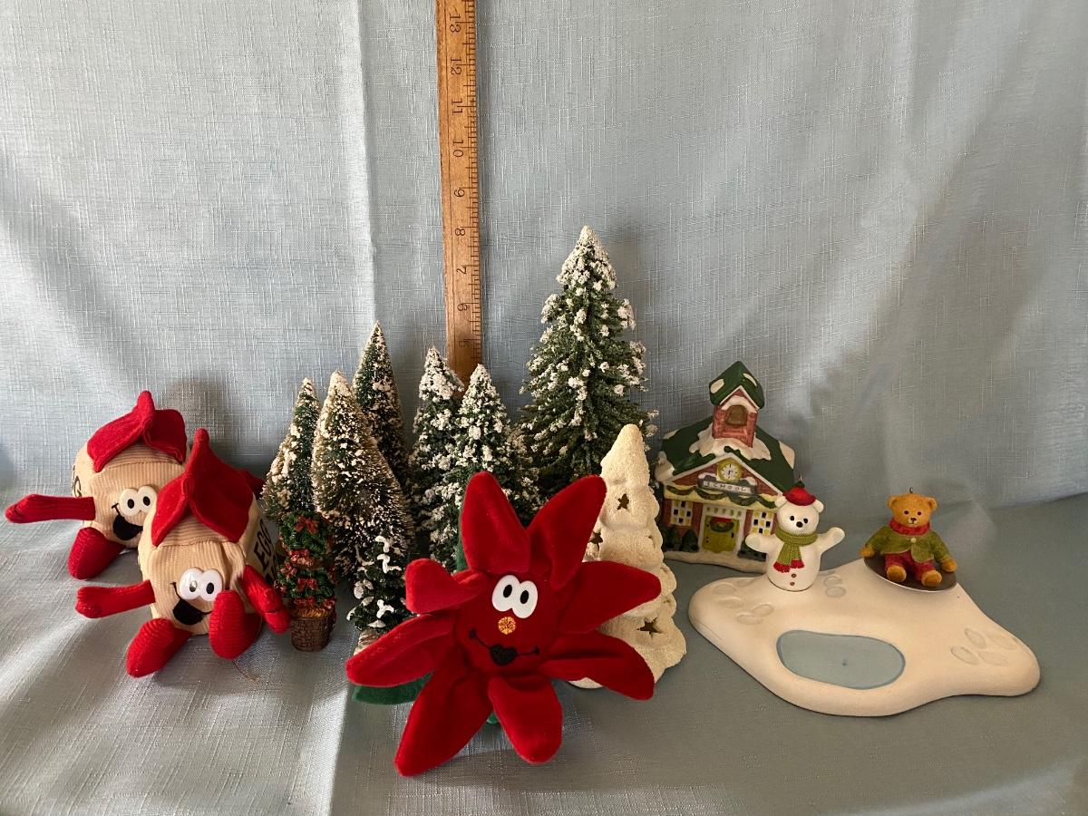 LOT 39C: Christmas Decor: Snowy Trees, Hallmark Keepsake Ornament Hollyday Hill & More