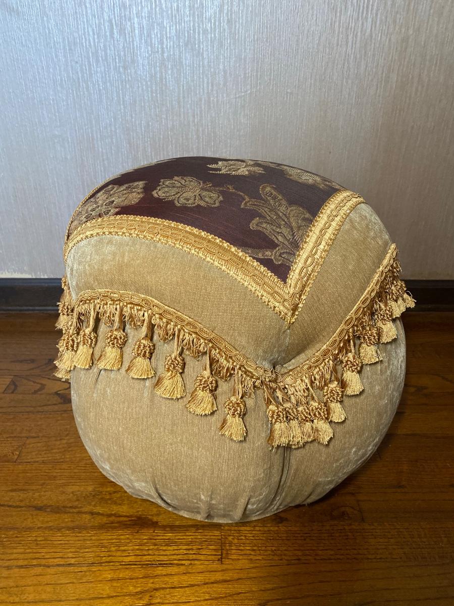 Includes two decorative ottoman poufs with ornate fabric and tassels. Each measure 16W x 16D x 18H.