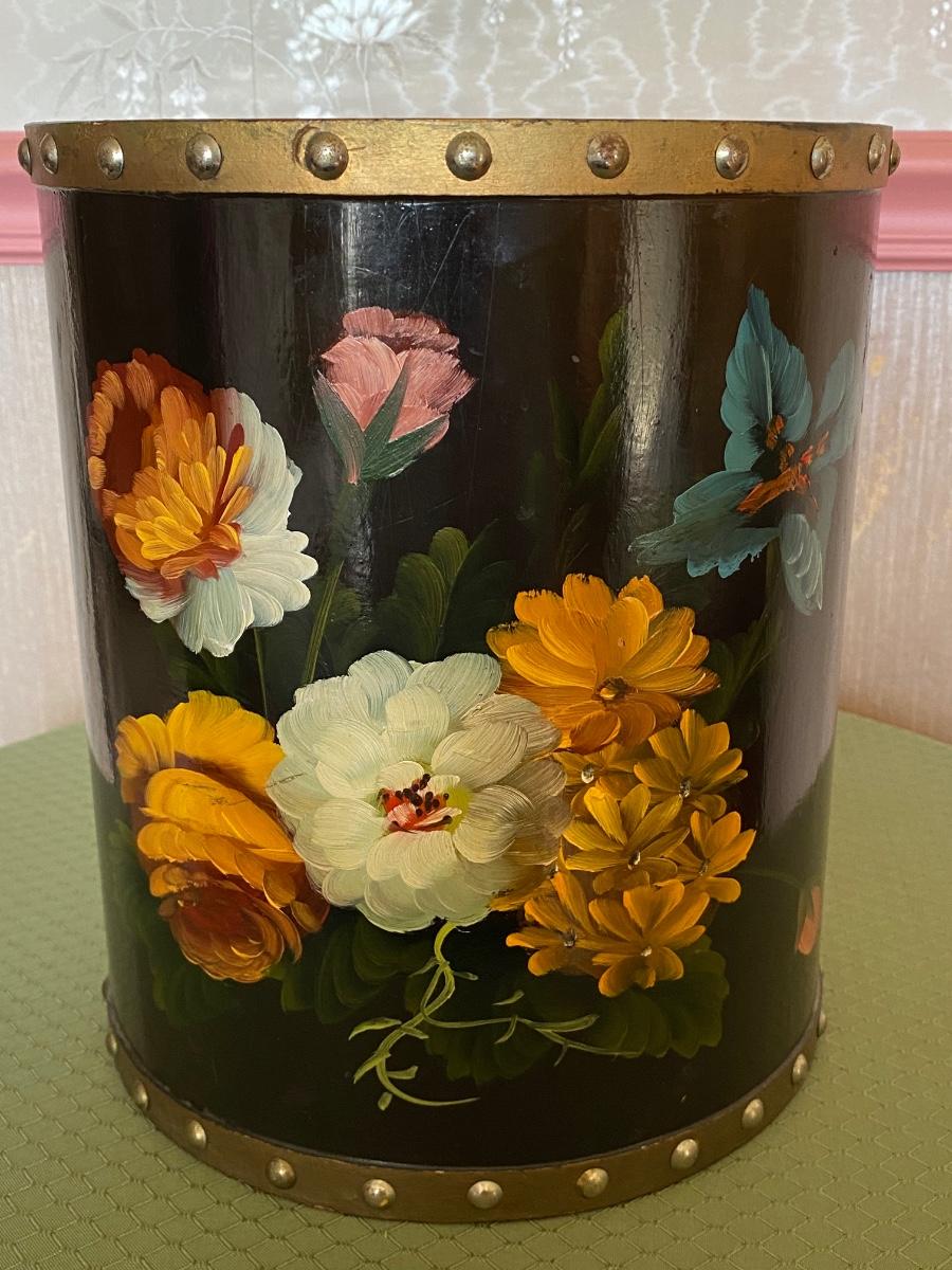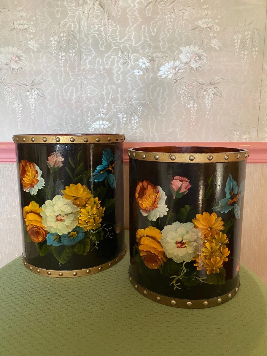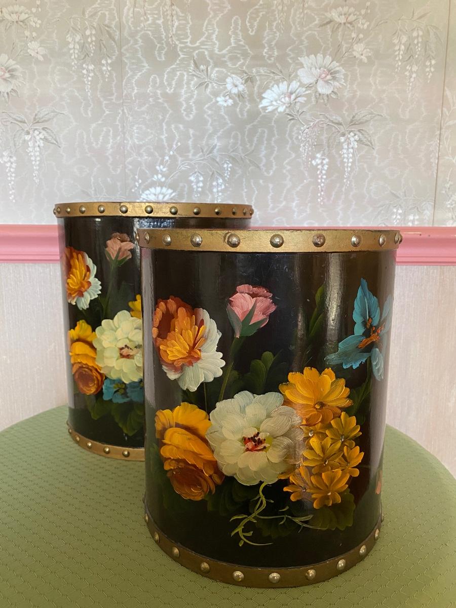 Includes two matching bins with floral designs. They measure about 10 and 11 inches tall.
