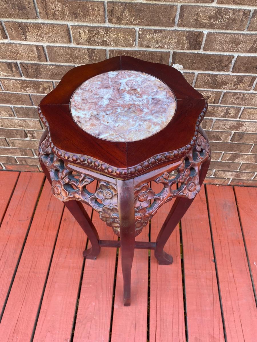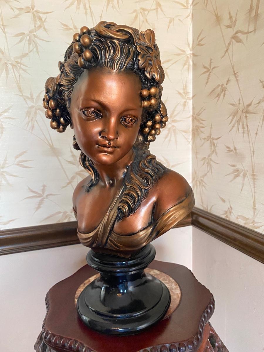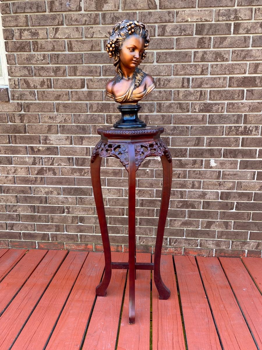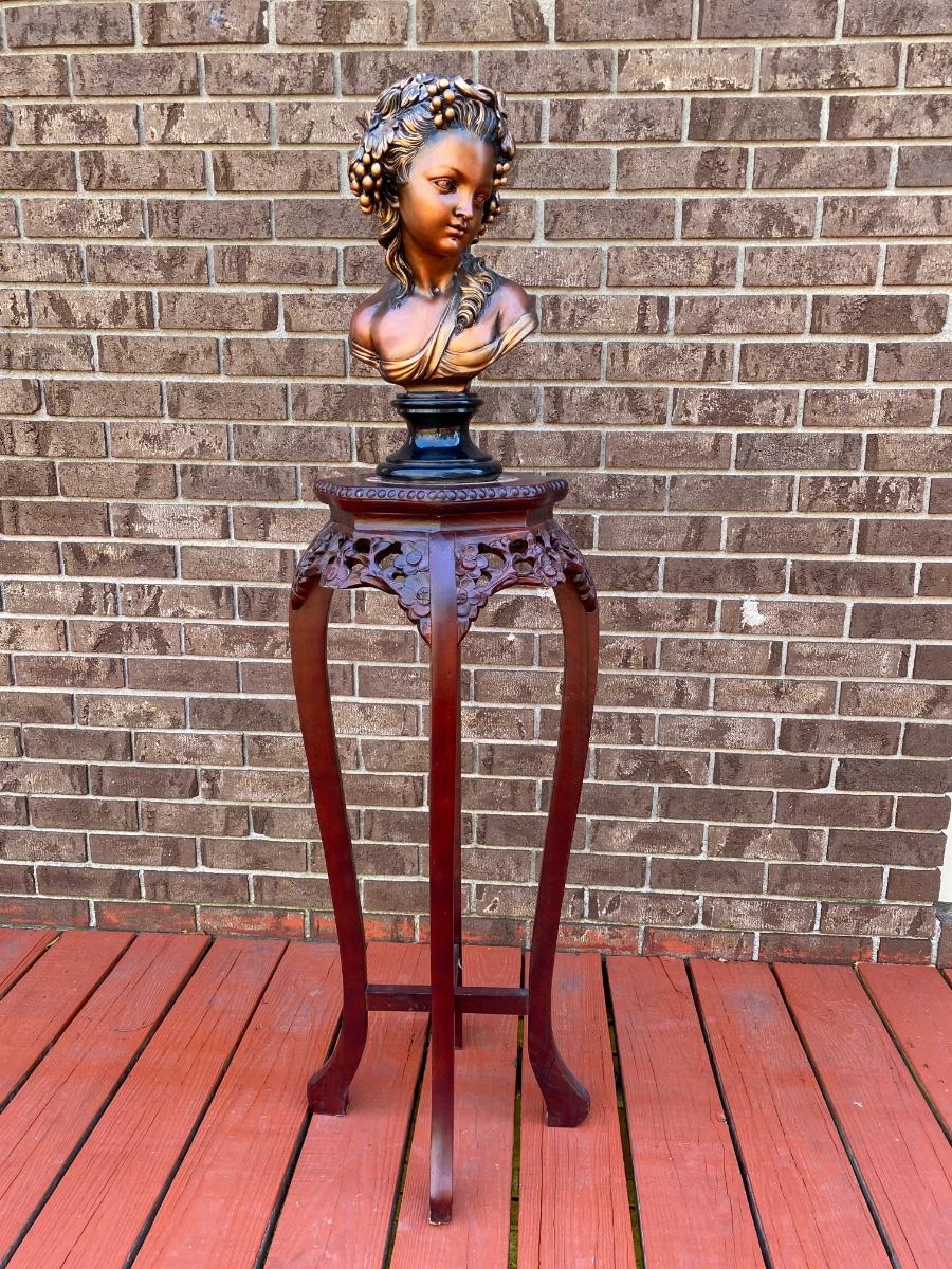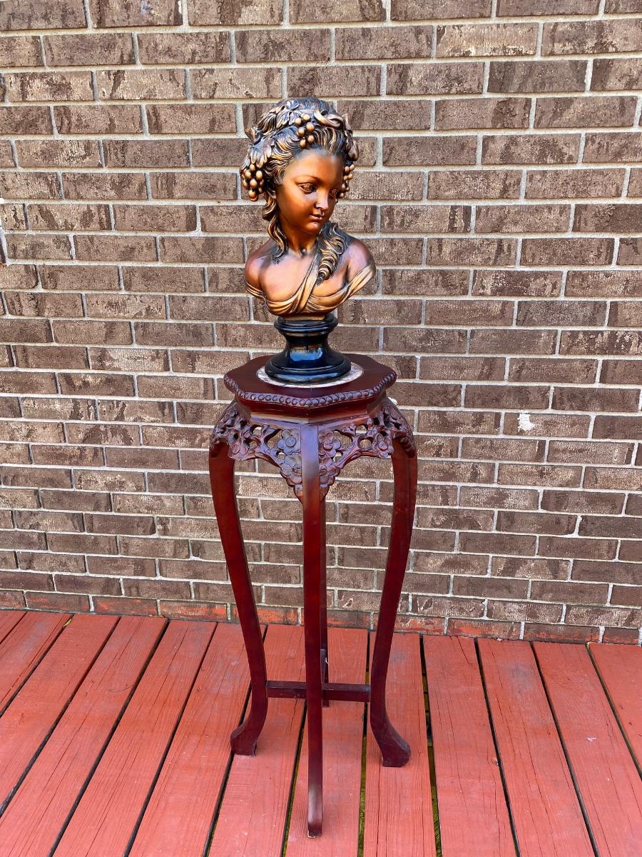 LOT 45C: Home Decor Bronze Bust & Marble Inlaid Carved Plant Stand