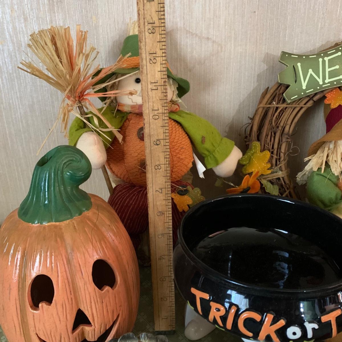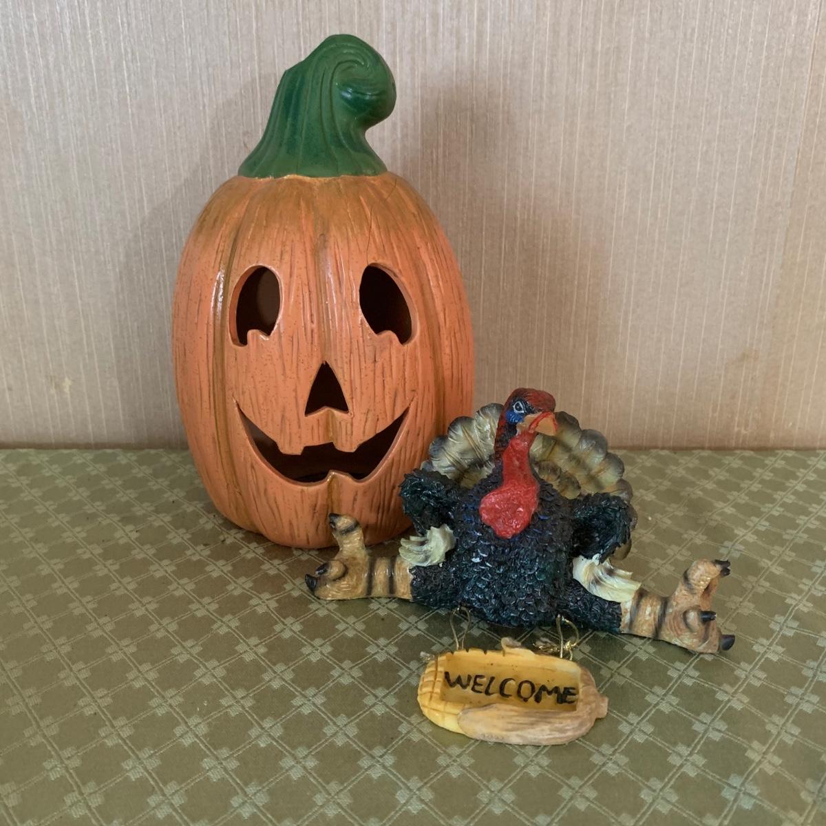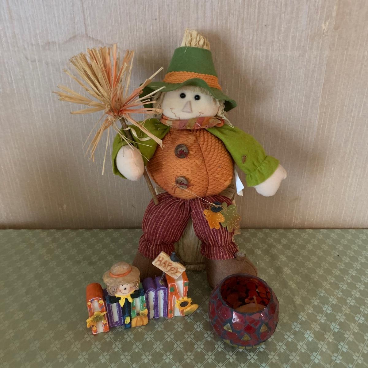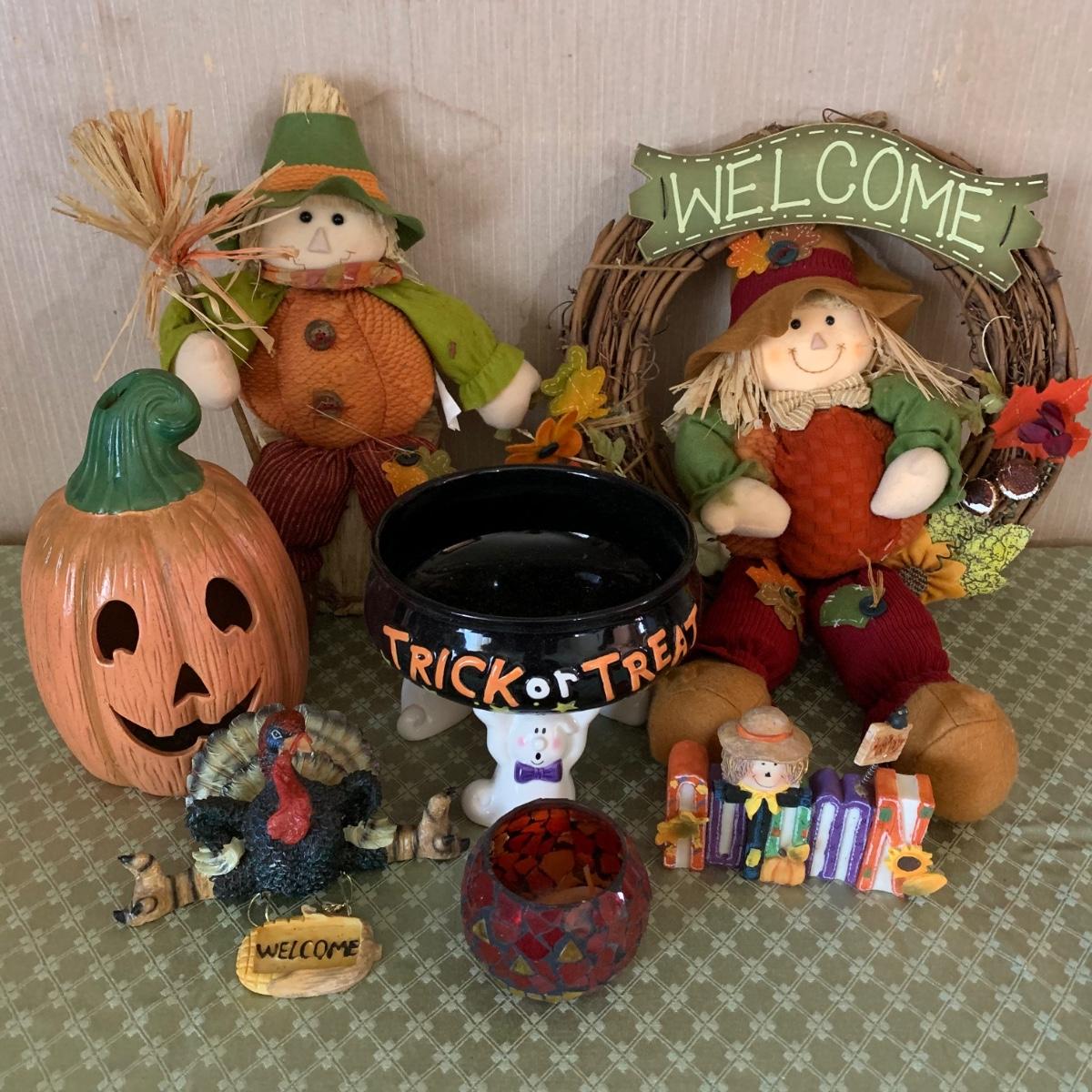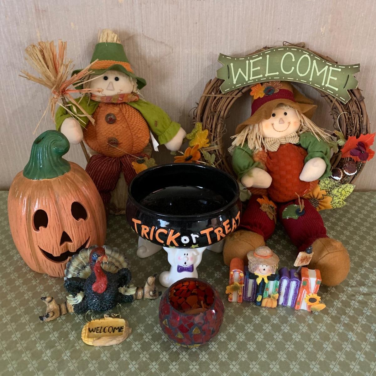 Includes scarecrow, wreath, small trick or treat bowl, candle holder, turkey statue and pumpkin.