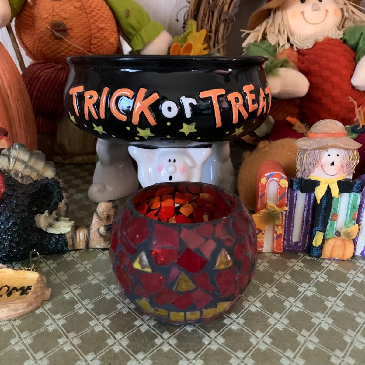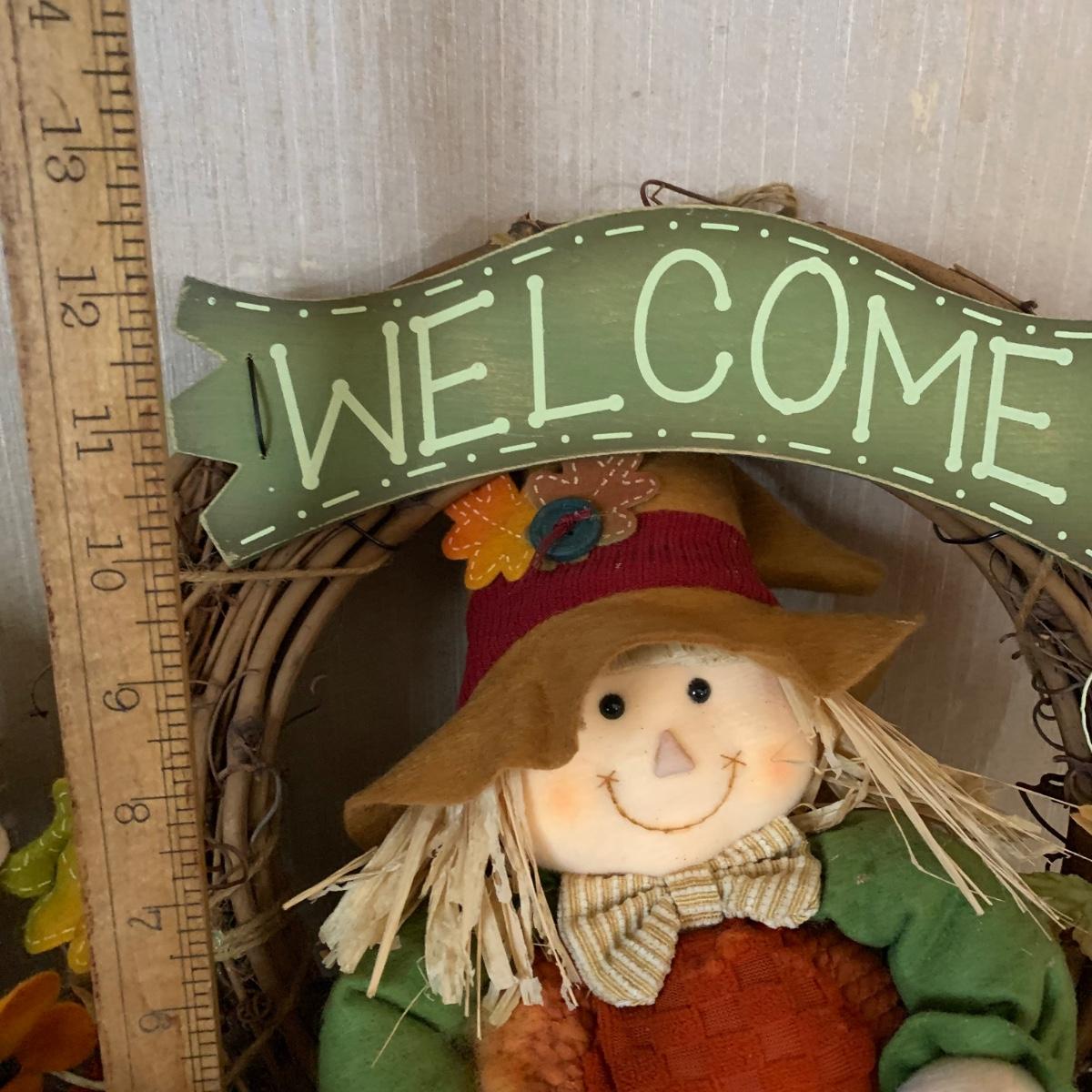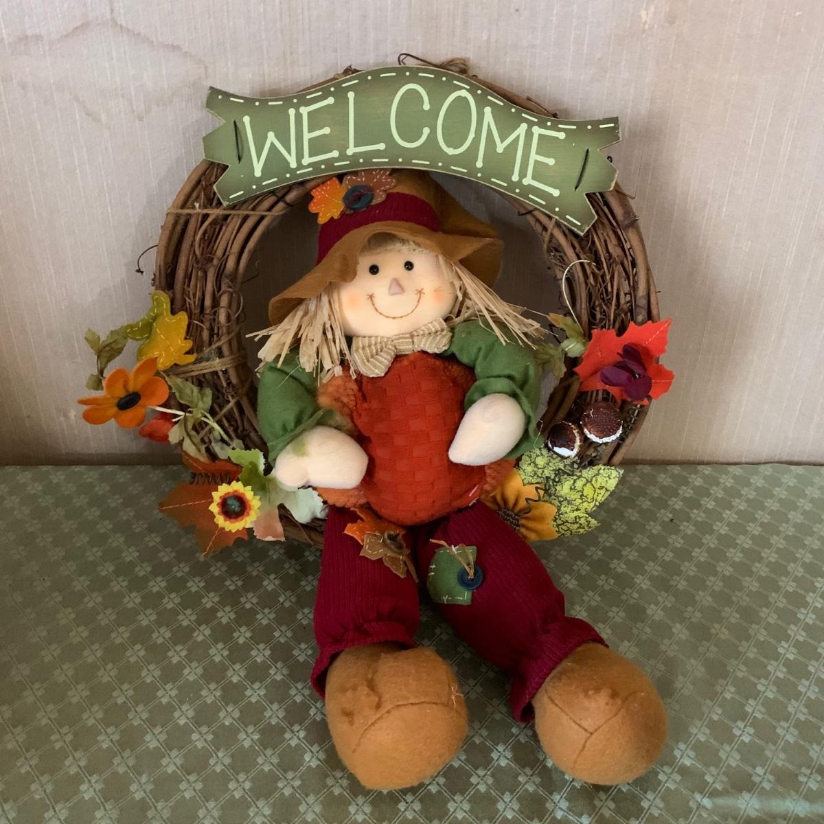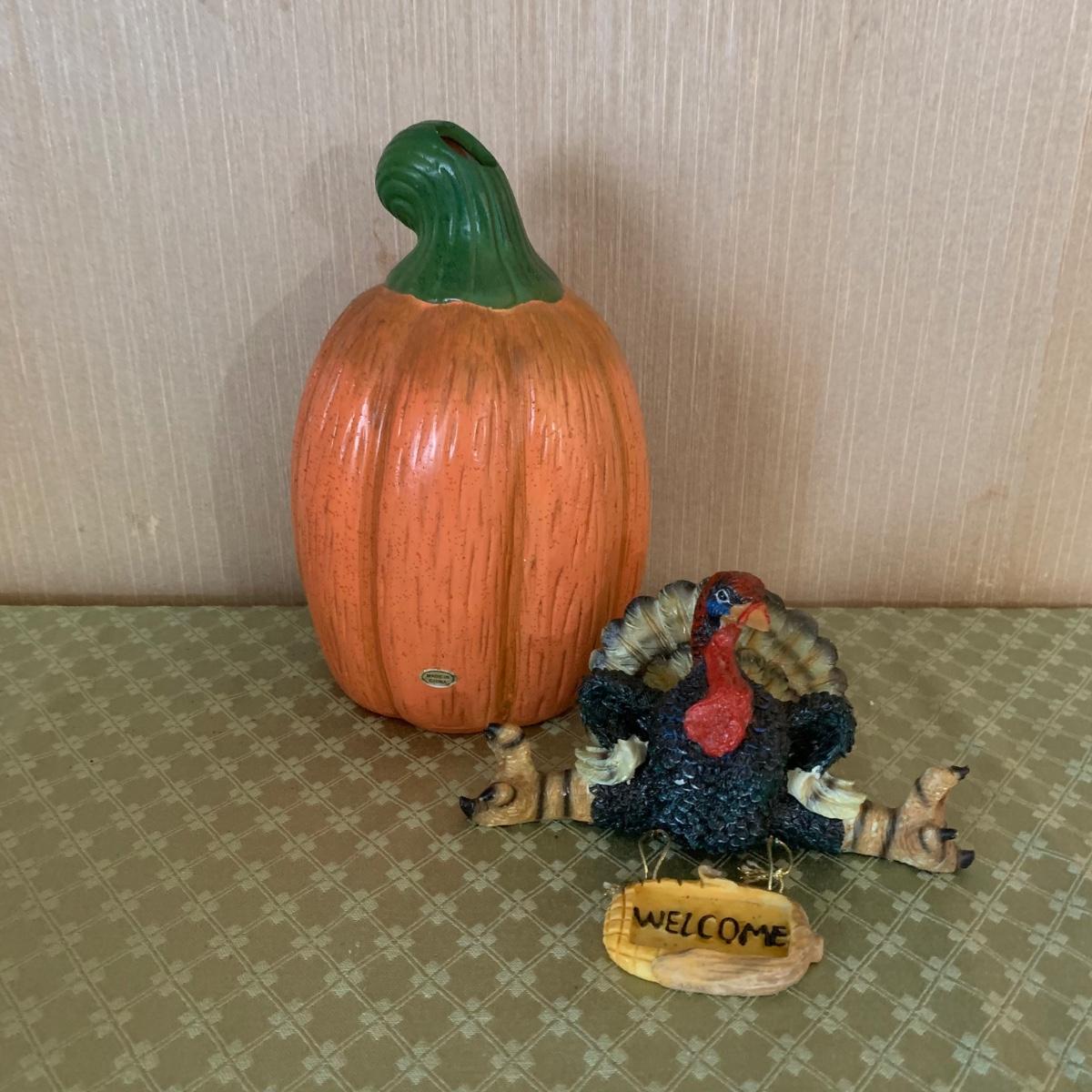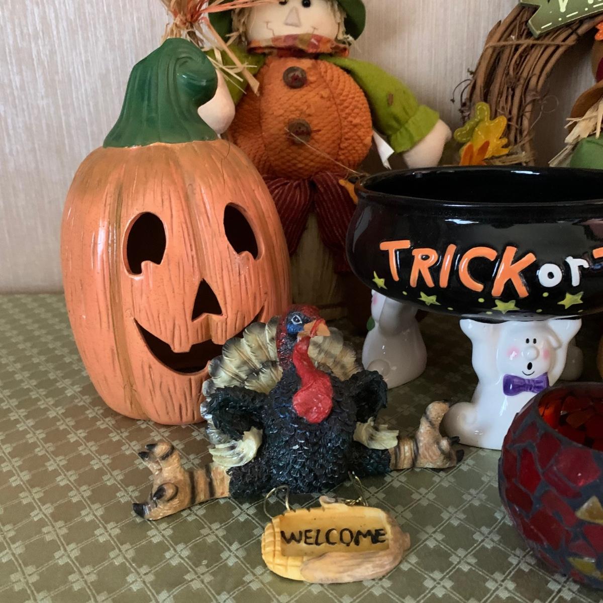 Includes scarecrow, wreath, small trick or treat bowl, candle holder, turkey statue and pumpkin.