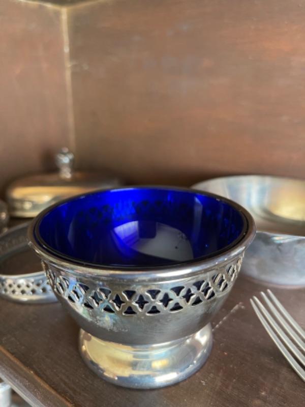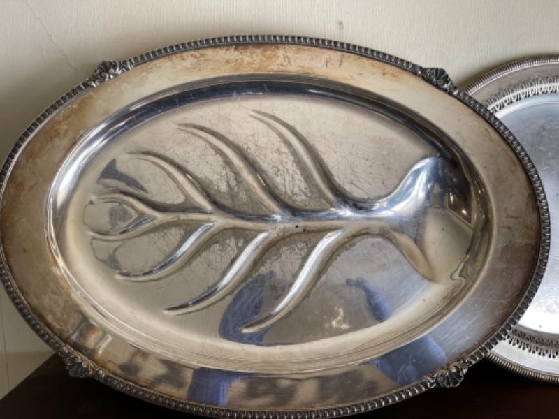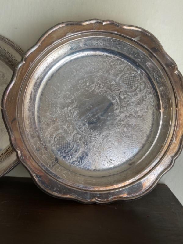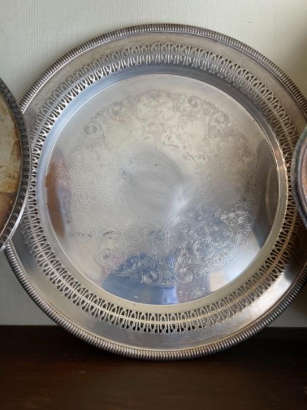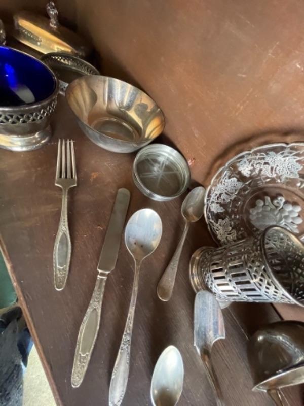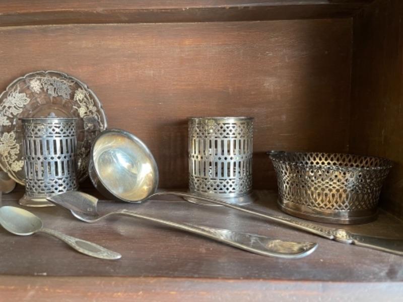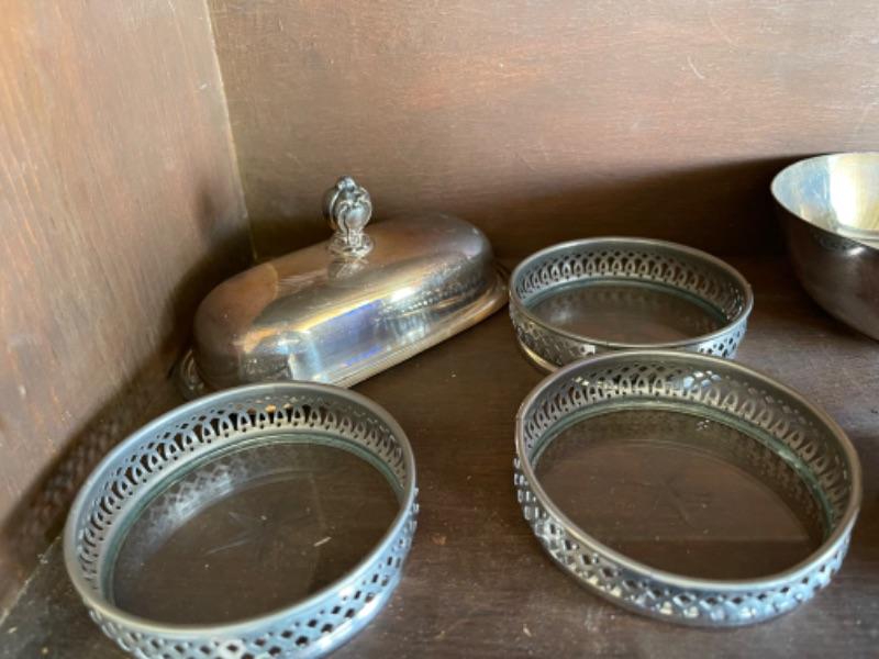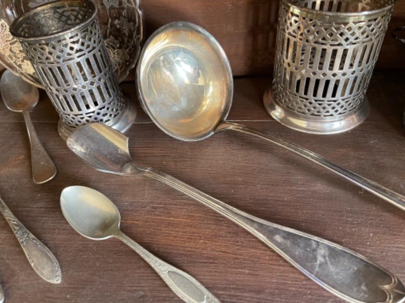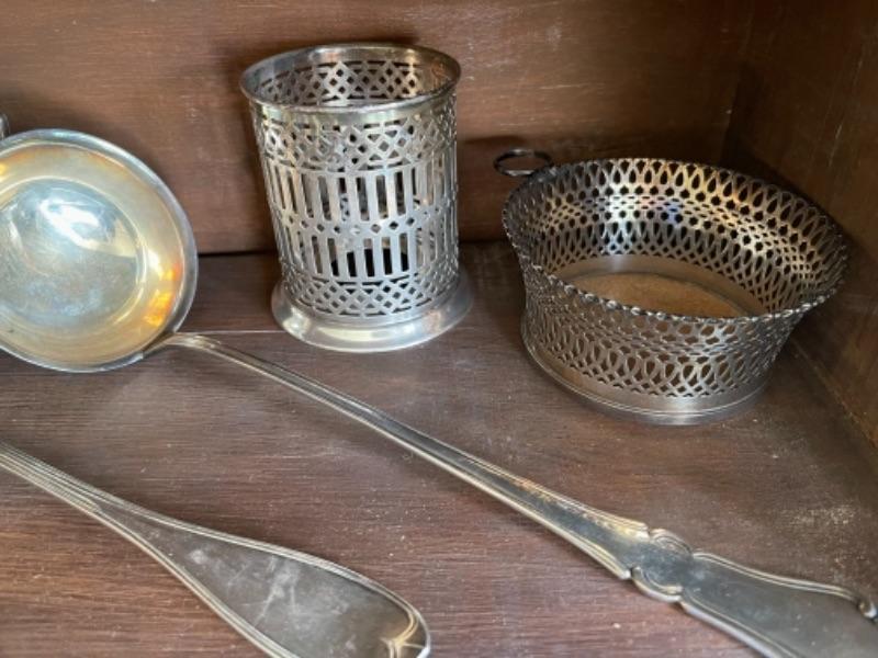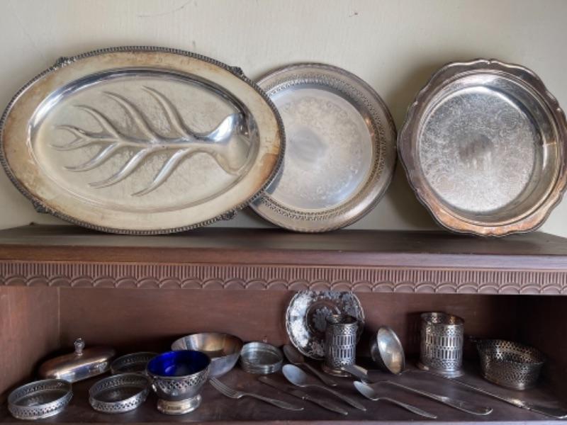 Lot 84L. Three silver plate trays, collection of silver plate smalls, coasters, ladle, etc.--$55