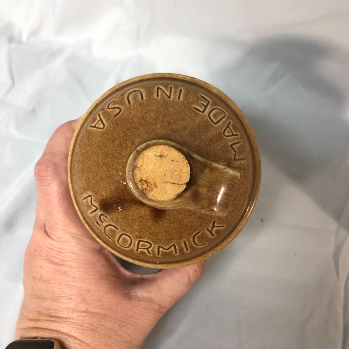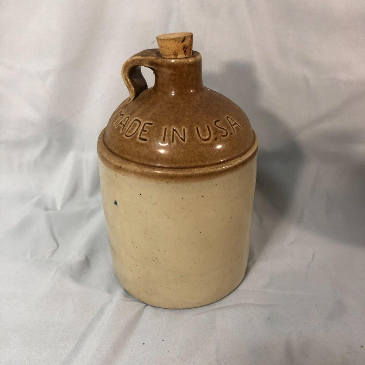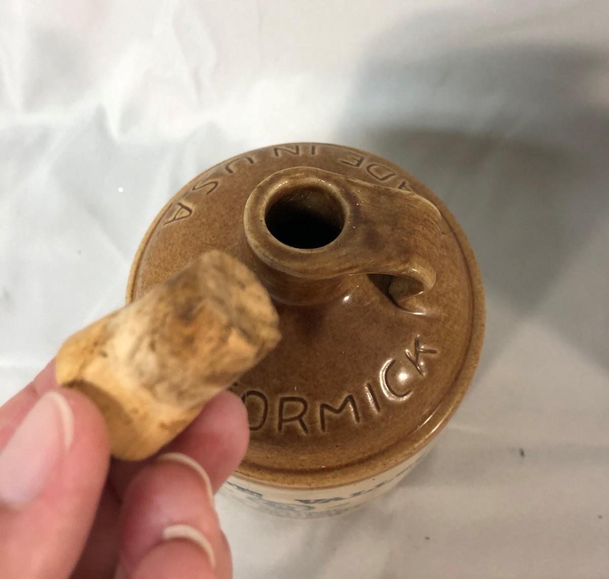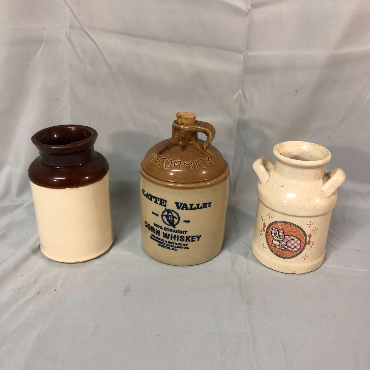 The small brown and white crock is marked on the bottom McCoy. The whiskey jug is by McCormick and the cork comes out easily. The other piece is not marked. All are in excellent condition and stand between 5.5" - 7.25".