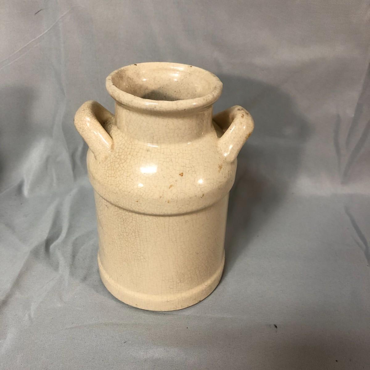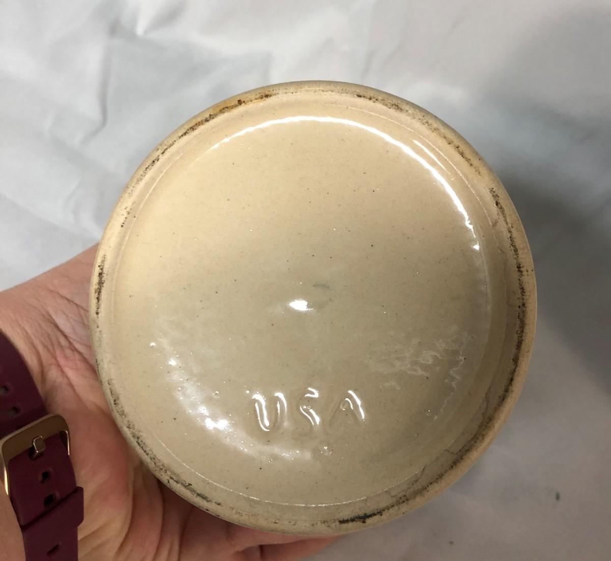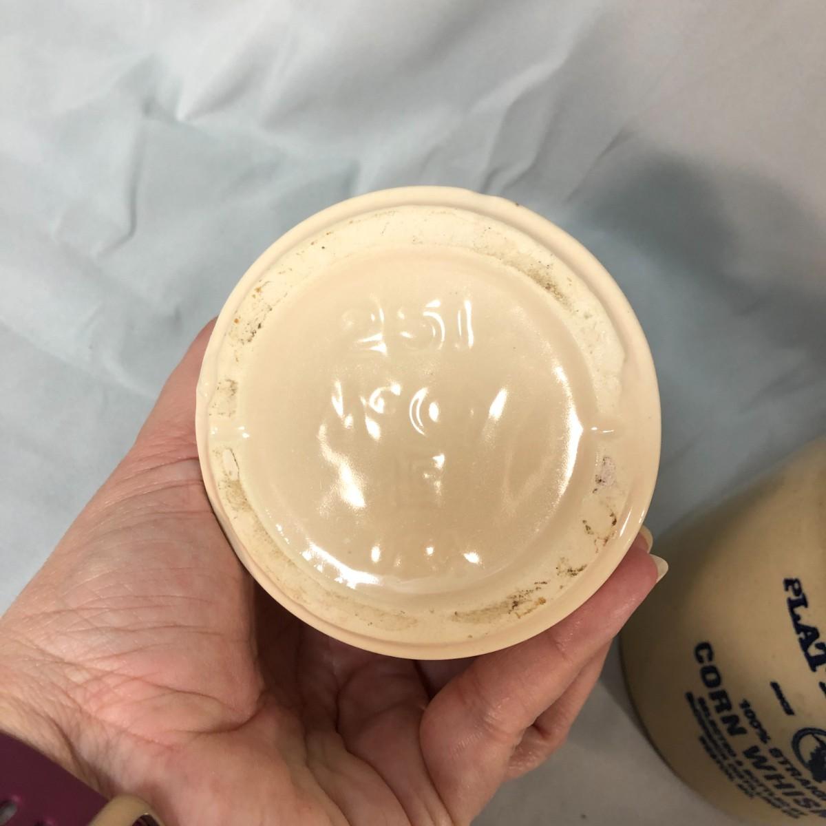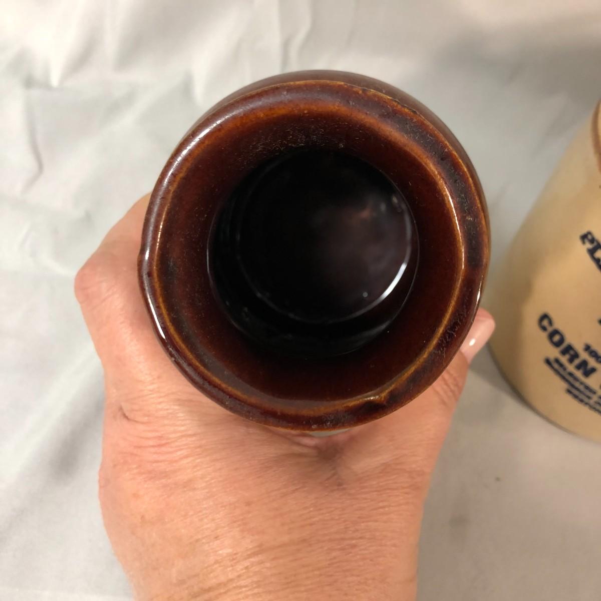The small brown and white crock is marked on the bottom McCoy. The whiskey jug is by McCormick and the cork comes out easily. The other piece is not marked. All are in excellent condition and stand between 5.5" - 7.25".
